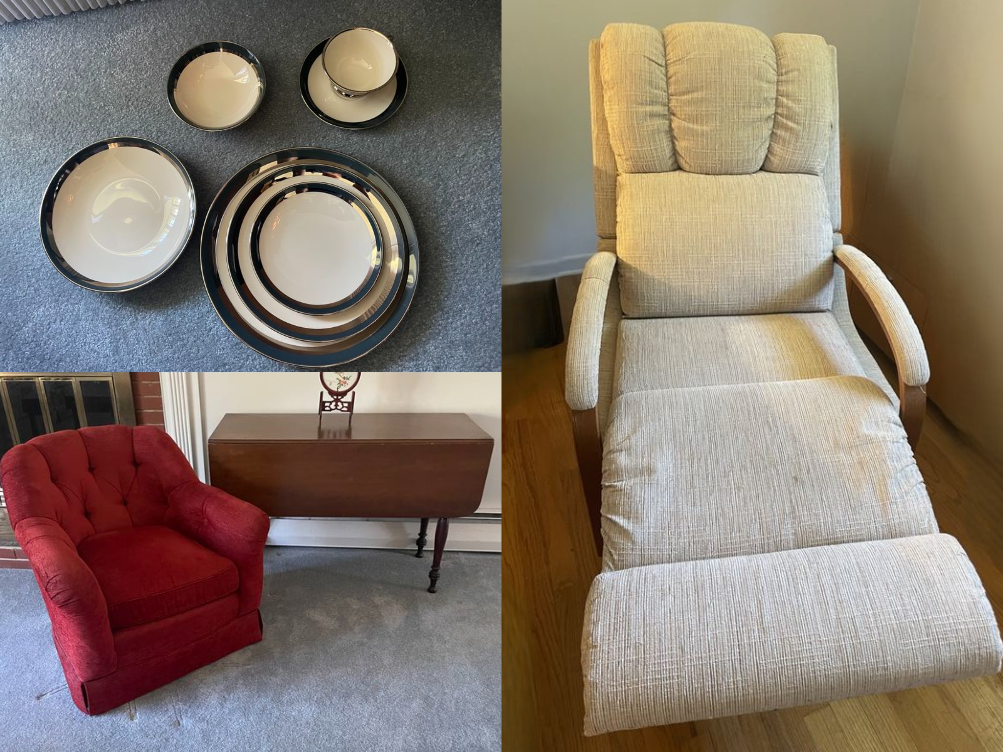 Items include modern recliner; Noritake "Reina" dish set & hostess pieces; Goodwrench R/C car; large Lenox platter; Polish pottery; Hummels; modern & vintage cookware; Jackson Furniture Company US ...