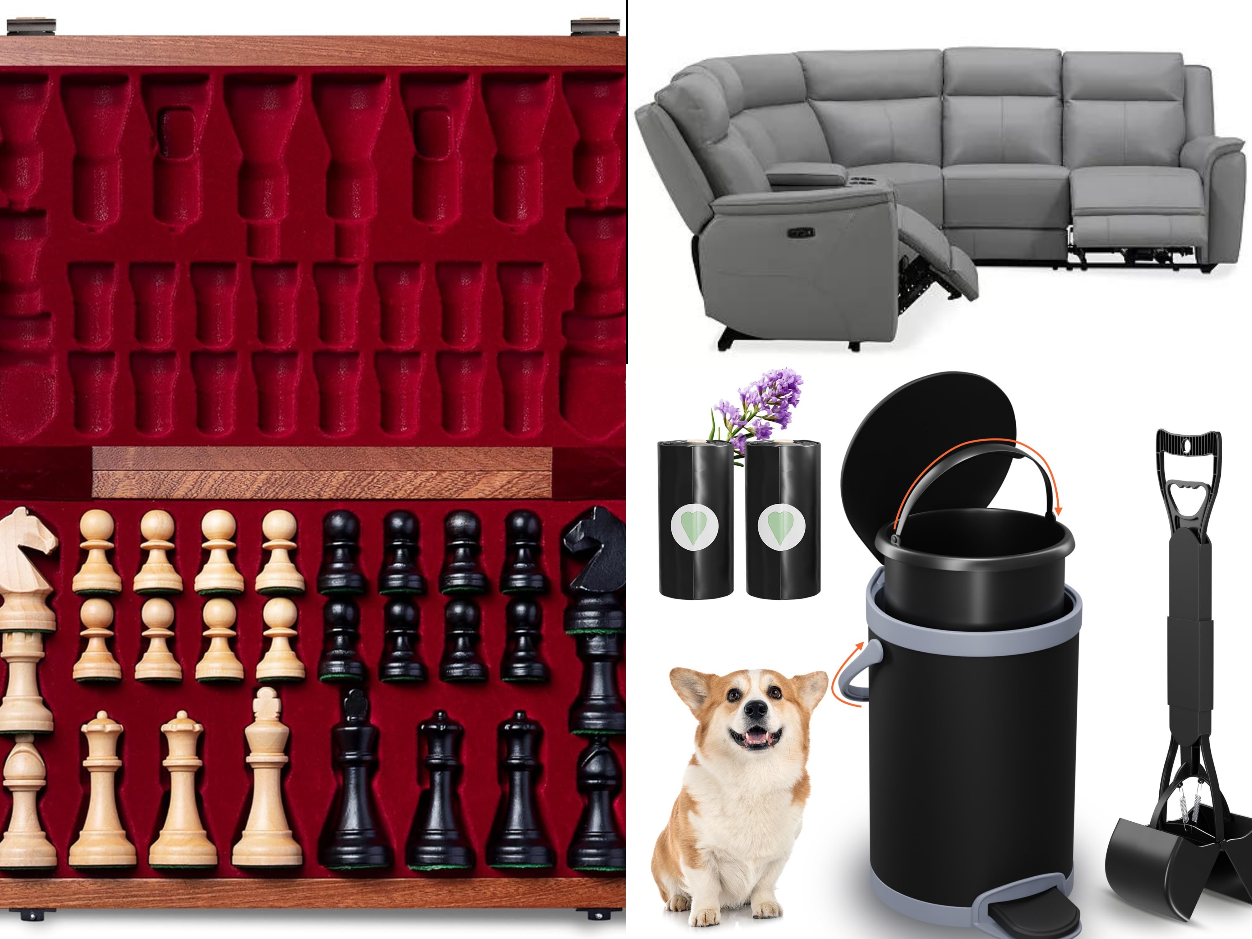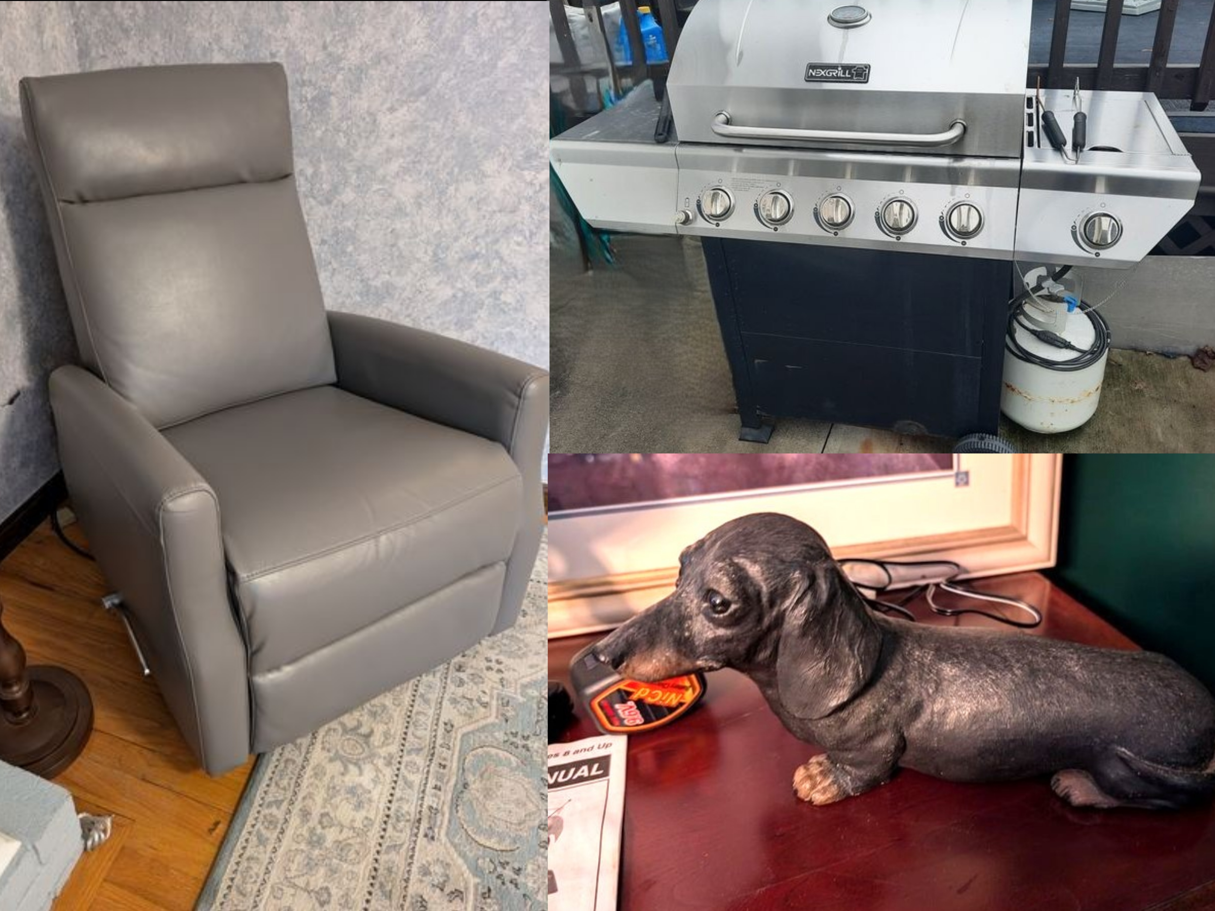 Items include Macy's Nevio fabric power reclining chofa; Macy's Saeville 43' fabric armchair; Macy's Ossoio leather power recliner; Athletic Works large golf training net; stone bath mat; ODCA boat...