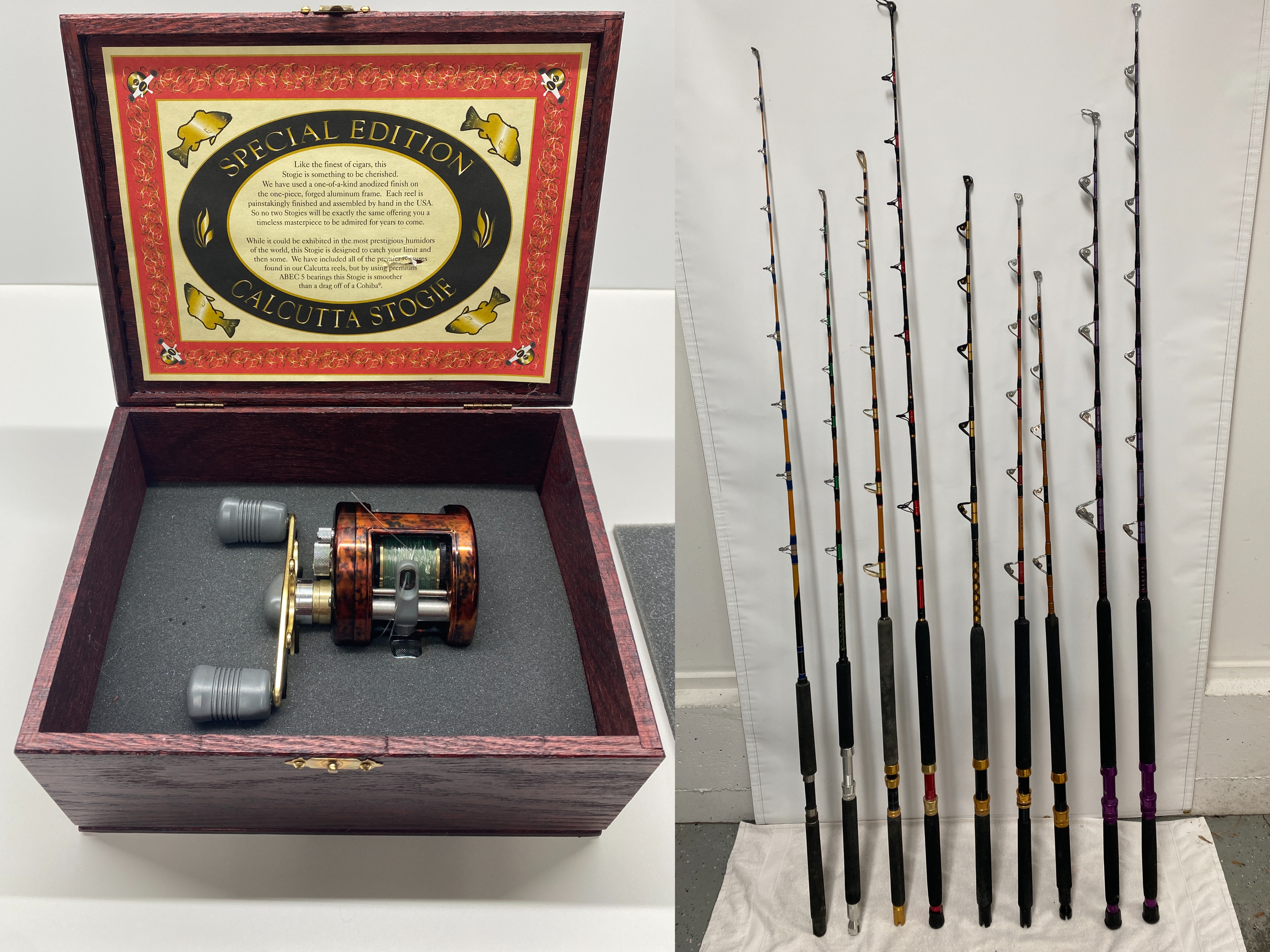 Items include Aruze Corporation slot machine; Mills goose neck slot machine; 1975 New York Yankees team signed baseball; Bruce Lee Lineage black hardwood nunchakus; Muhammad Ali frame boxing poster...