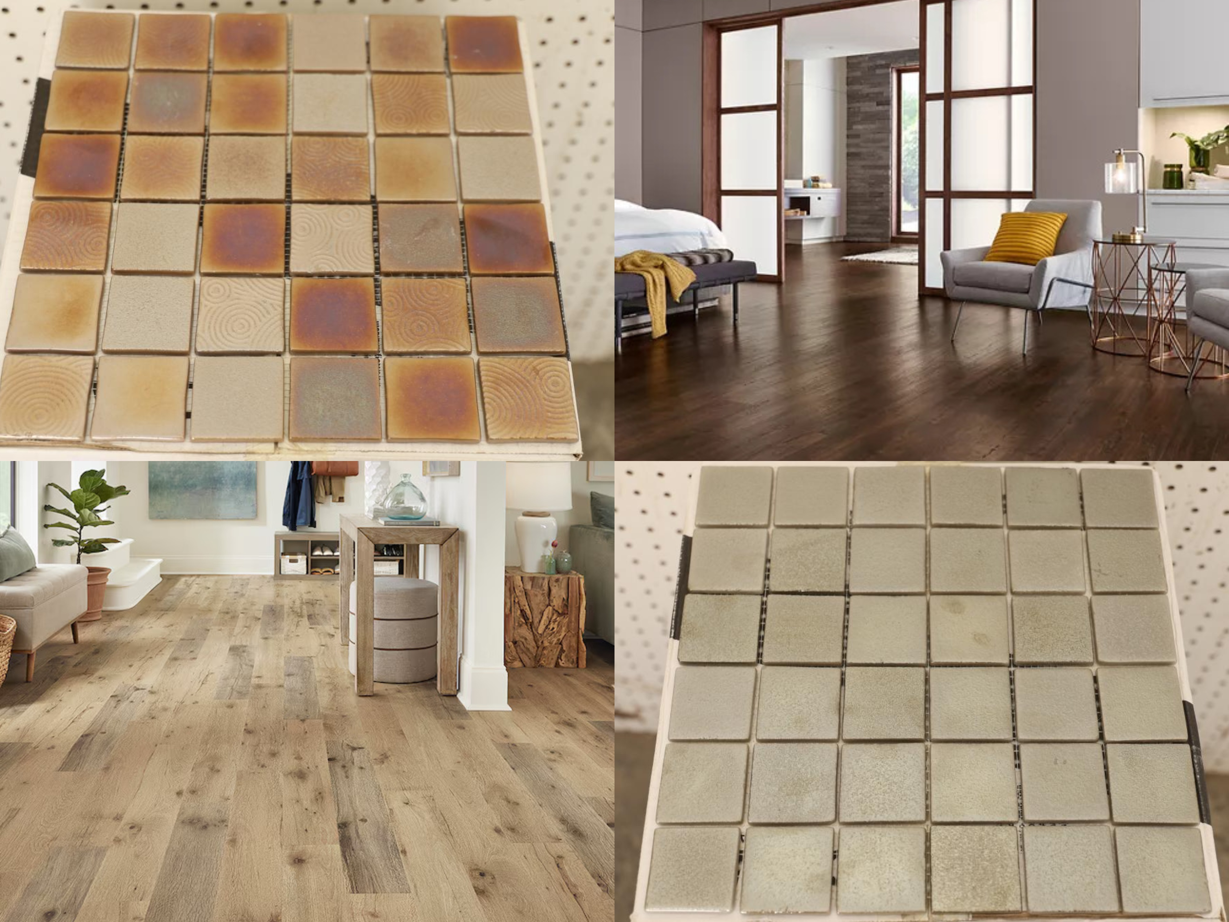 Items include Mohawk waterproof Uni-Clic floating laminate flooring, including Pergo Outlast Java scraped oak, Quickstep Studio Concord maple, Pergo Timb...