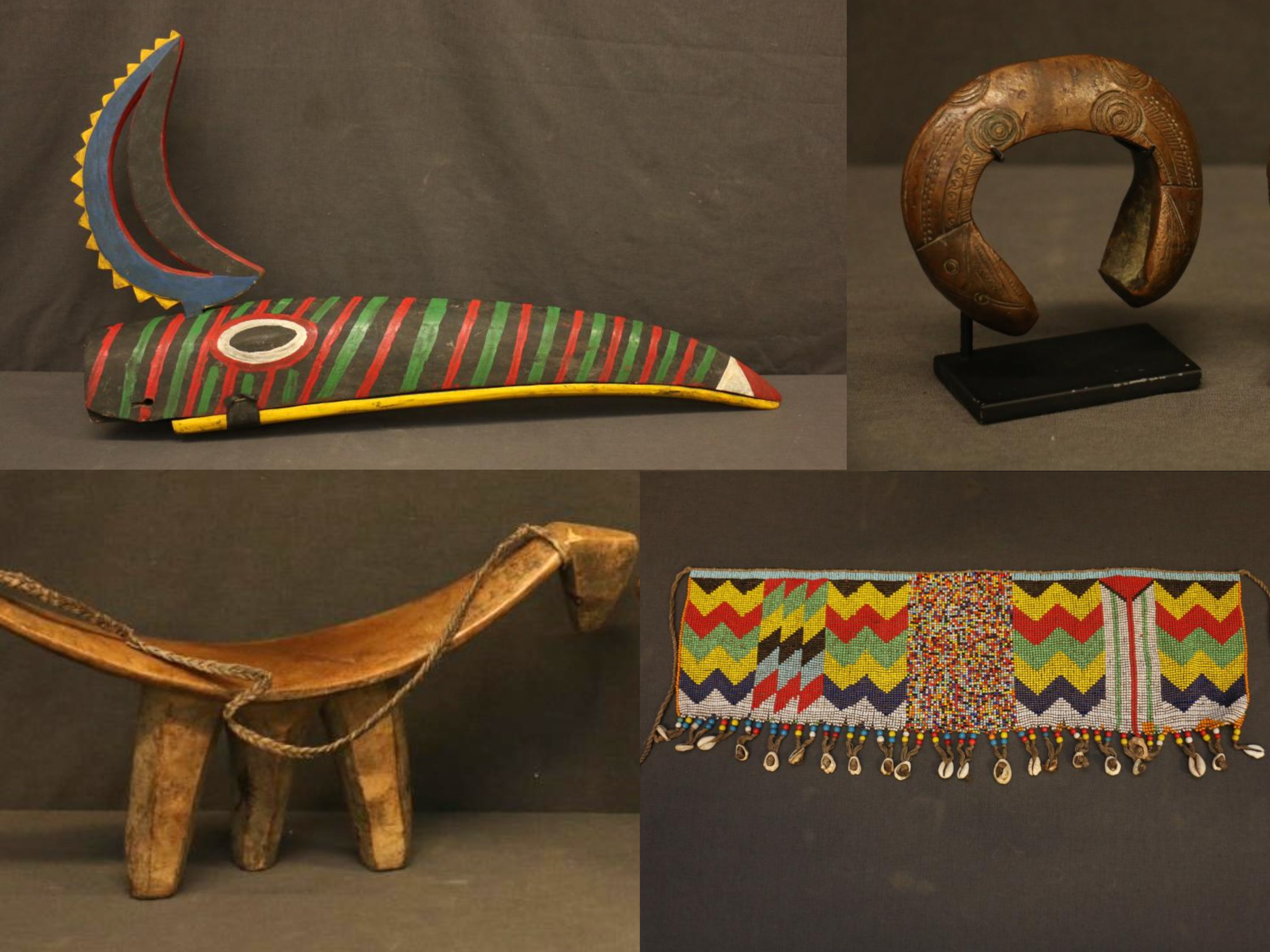 Over 170 lots of African art. Items include women's indigo wraps. Marka/Dafing people, Burkina Faso; Dan headdress, Liberia; large carved Mali-style African drum; old currency spears. Tuareg people...