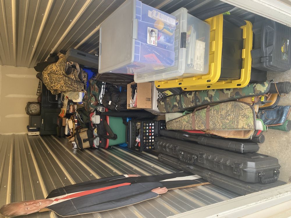 Contents of an 8' x 20' storage pod. Items include furniture and storage pieces such as two folding corner pine shelving units, a white IKEA-style two-shelf unit, a wooden computer cabinet, a woode...