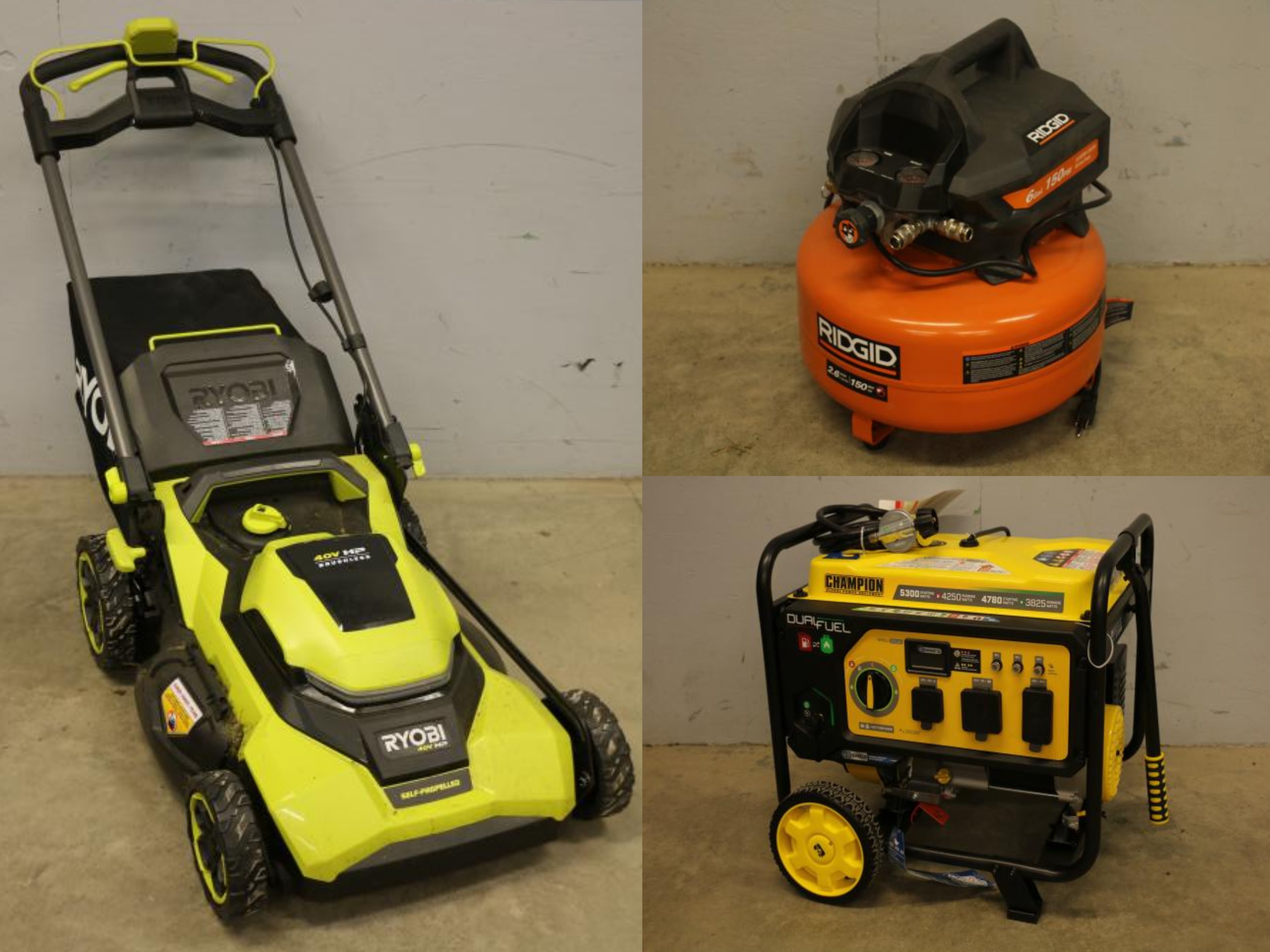 Items include DeWalt standing air compressor; DeWalt 21" self-propelled mower; Husky air compressor; Toro gas powered push mower; Champion inverter generator; Legend Force gas powered edge trimmer;...