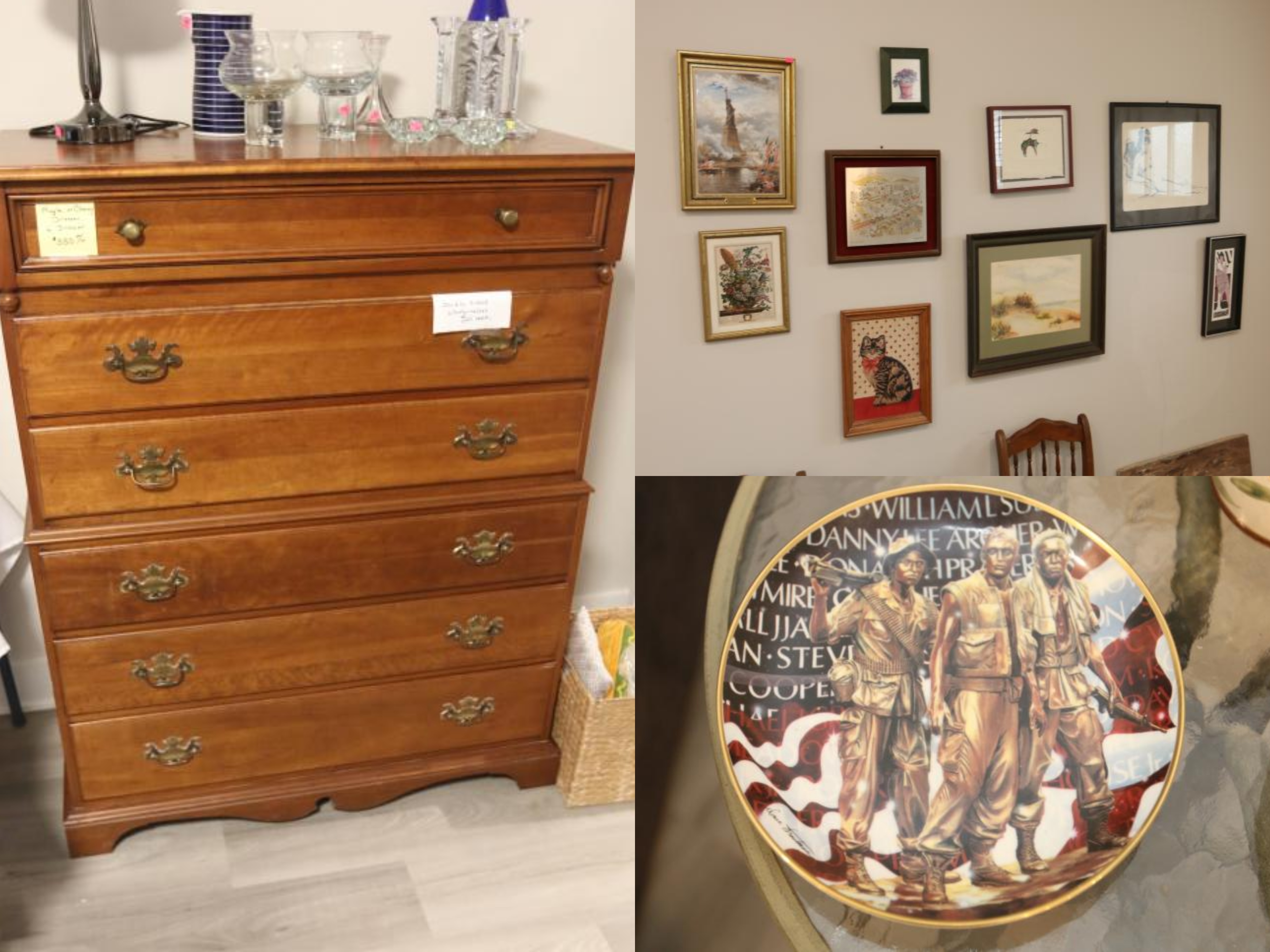 Items include Century Furniture Chest of Drawers;, Bags, Purses, Wallets, and Accessories; Oak Wood-Framed Rectangular Mirror with Dark Finish; Home Electronics, Furniture, and Decor; Framed Artwor...