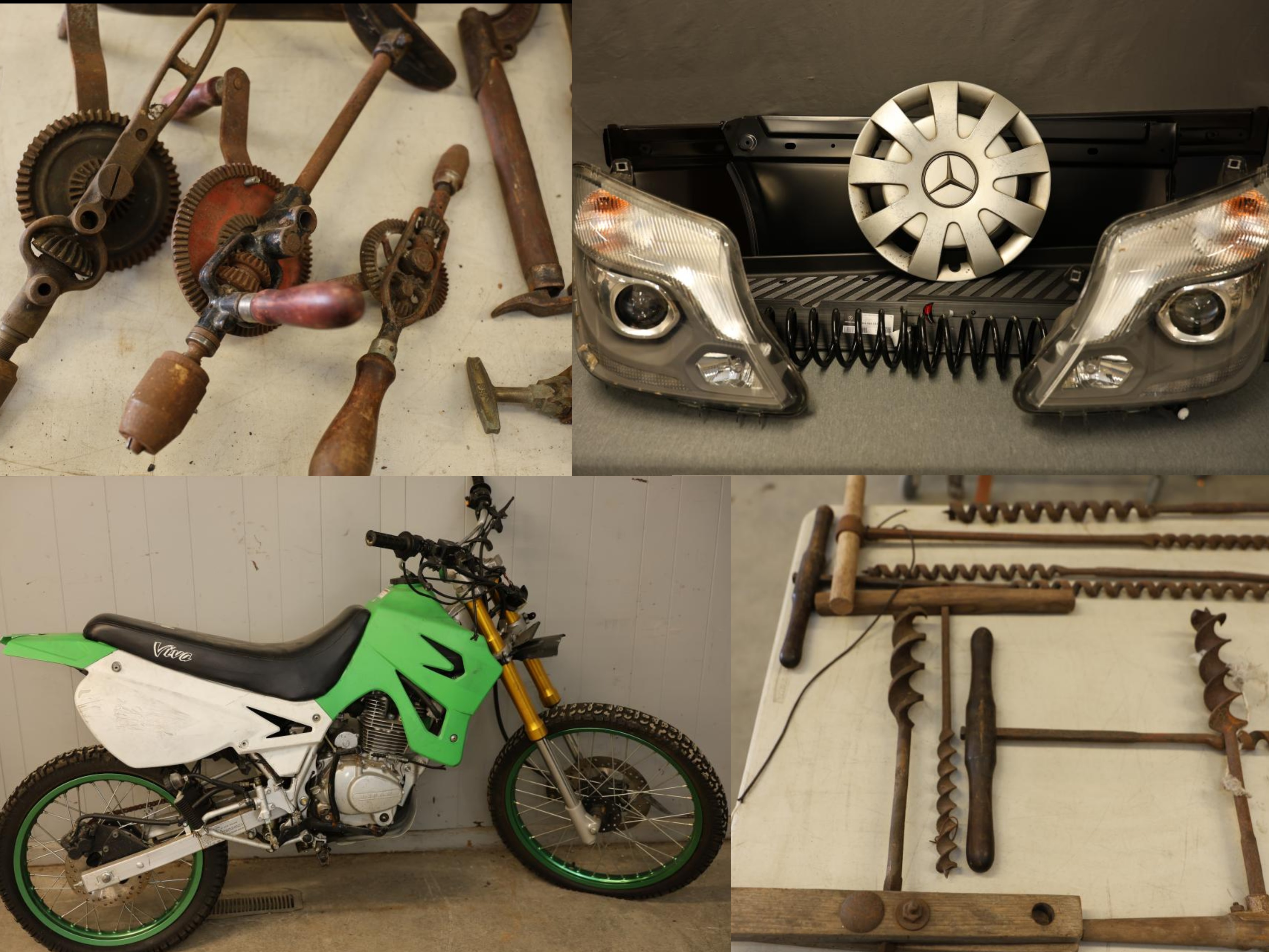Items include dirt bike with Lifan 200 cc 5-speed manual four-stroke engine; Airco oxy-acetylene welding & cutting torch set; Jack Boss motorcycle stand; Cortex Muffler 45 Series Round 4518CC3030; ...