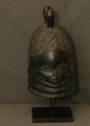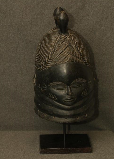 HELMET MASK. Mende people, Sierra Leone. The smooth surface of this mask provides a dramatic contrast to the sharply carved braided hair and facial scarifications. Complex hair braiding is a mark of internal and external beauty among the Mende people. A white cloth would have been wrapped around the knobs on top of the mask. Two slender slits below the chin allow the wearer to see where she is going. Custom mount. H 15in. Wood, pigment. Exhibited Free Library Gallery Philadelphia 2012. Published in Rosen, Rosen 2013 p39 Fig 39.