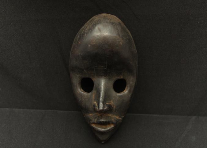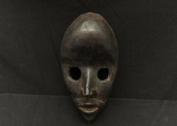 GUNYEYA FACE MASK. Dan people, Liberia. Characterized by a prominent, protruding forehead that occupies half of the face, large round eyes, prominent lips, and a triangular chin. Masks such as this were worn by men in races. H 9in. Wood, pigment. See Bacquart 1993 p36-37 and Rosen, Rosen 2013 p22-23.