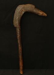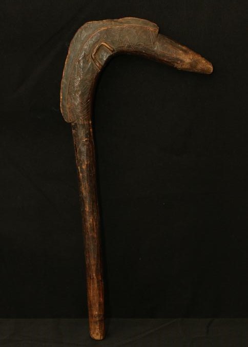 THROWING STICK. Ingesanna people, Sudan/Ethiopia. Throwing sticks were used for hunting, as weapons in war, and in some rituals. They are known to have been used since the Egyptian Middle Kingdom period (2050 BC-1652 BC). Wooden throwing sticks were ultimately supplanted by iron throwing blades. The blade of this stick was carved in the form of an animal head with engraved complex geometric designs. Because of their perishable nature and the abuse they receive when used, well preserved examples such as this are rare. H 21.5in. Wood, pigment.