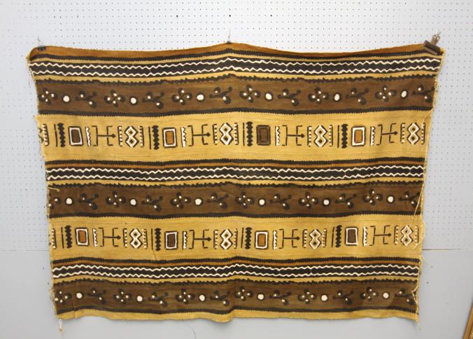 ABSTRACT BOGOLAN (MUD CLOTH) TEXTILE. Bamana people, Mali. Painted with pigments derived from plants and soil, this dramatic textile is composed of 8 hand woven cotton strips. The designs have symbolic significance L 69in. W 45in. Cotton, pigments.