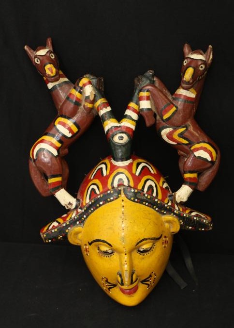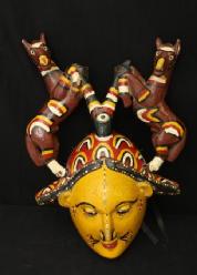 FACE MASK. Anang (Ibibio) people, Nigeria. The Y-shaped post at the top of this mask is probably a reference to the confluence of the Niger and Benue Rivers that define the geography of Nigeria. Together with the horse, this configuration is a reminder of the Nigerian coat of arms. The significance of the eye on the stem of the Y is not known. Facial designs represent traditional tattoos. A band of rubber from a bicycle inner tube was used to hold the mask in place and a costume was attached to nails around the sides of the mask. H 19.5in. Wood, paint, nails, rubber. Exhibited at Free Library Gallery Philadelphia 2012. Published in Rosen, Rosen 2013 p150 Fig 209.