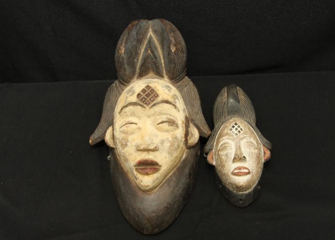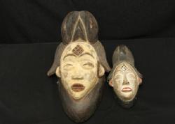 OKUY FACE MASK AND PASSPORT MASK. Punu people, Gabon. The Okuy mask of the Punu people is an idealized portrait of a favored female ancestor who returns as a guardian figure for a funeral or other important ceremony. The white pigment on the face refers to death and ancestors. Both masks have typical facial scarifications. The hair is divided into three lobes with the large central lobe split by a dramatic comb-like device. During performances, the masker towers above the audience on stilts. Mask H 13in. Passport mask H 7in. Wood, pigment. See Rosen, Rosen 2013 p164-169.