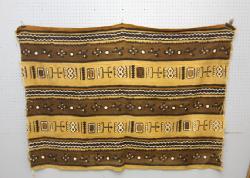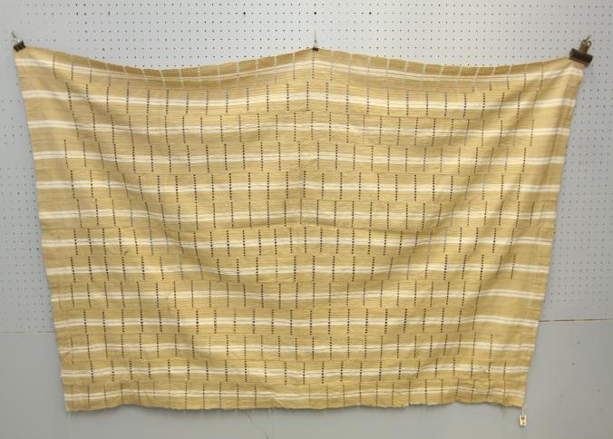 WOMAN’S ASO OKE CEREMONIAL CLOTH. Yoruba people, Nigeria. This traditional cloth of 13 hand woven strips was made from cotton and glittering Japanese metalized Lurex plastic thread. The outside surface of the cloth is covered with warp float decorations. Gaps in the cloth were made by placing a weaver’s sword among the warp threads. The gaps allow for ventilation. L 71in W 43in. See Clarke 1997 p94-111.