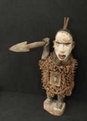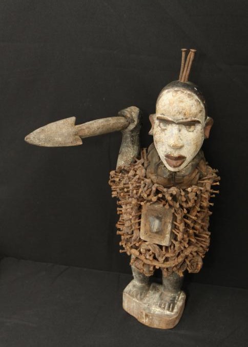 NKONDI NAIL FETISH. Kongo people, Democratic Republic of Congo. The body of this sculpture wears powerful magical substances wrapped in cloth bundles called Nkissi. A box with a glass or mirror face on the abdomen has similar power. The force of these substances is activated when the owner of the sculpture or a ritual specialist (Ngang) hammers objects like nails into it. This very powerful Nkondi has glass eyes and he carries a spear in a clenched fist which he uses to attack and punish a person or spirit that has placed a curse on the owner. H 26.5in. Wood, nails, cloth, glass, rope, pigment. See Bacquart 1993 p128-133.