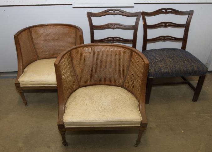 Four chairs incl two ladder back upholstered seat chairs, and two cane barrel backed chairs having casters on front legs. Pickup only.