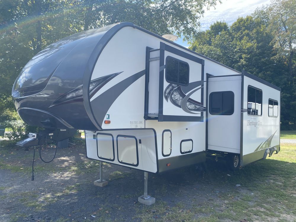 2018 Forest River Hyper-Lyte Heritage Glenn RV Camper. Model WBF28BHHL. VIN#4X4FWBD24JV701025. 34' fifth-wheel RV designed for family travel, featuring sleeping space for up to eight people, two slide-outs, a private master bedroom, a walk-in pantry, and double-bed bunks for the kids. This lightweight model includes interior amenities like Stainless appliances, a residential-style kitchen with a high-rise faucet, and exterior features such as a power awning with "Quick Pitch" functionality. Virginia Title. RV is located in Highland Mills, NY. A NYS DMV MV-50 (transfer of title) will be done with the seller at the time of pickup.