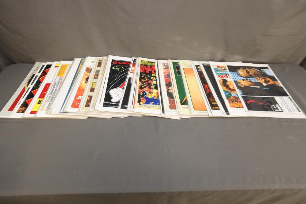 Items include reproduction posters of many different genres of celebrities; music artists and movies including "Key Largo"; "The African Queen"; "Scarface"; "A Nightmare on Elm Street"; "Chitty Chitty Bang Bang"; "Judas Priest"; "Capote"; "A Star Is Born"; "Macbeth"; "Allman Brothers"; "Flash Gordon"; Hairspray"; "Audrey Hepburn"; "The War of the Worlds"; "La Dolce Vita"; "Joni Mitchell"; "King Solomon's Mines"; "Batman"; "Dr. Who"; "The Cotton Club"; "Fiat"; "The Motels"; "North Sea Jazz Fest"; "Julius Caesar"; "Easy Rider"; "The Graduate"; "Titanic"; "Josephine Baker"; "Jaws 2"; "Ghetto Freaks"; "Cyrano"; "Dead Reckoning"; "The Hustler"; "Jurassic Park"; "The Doobie Brothers"; "Goldfinger"; "Spartacus"; "Animal Farm"; "Monty Python"; "The Grapes of Wrath"; poster mock-ups and source materials including post cards, clippings, images, and pages and much more. Most pieces throughout the auction are 11" x 17." Items are located in Pleasant Valley, NY.