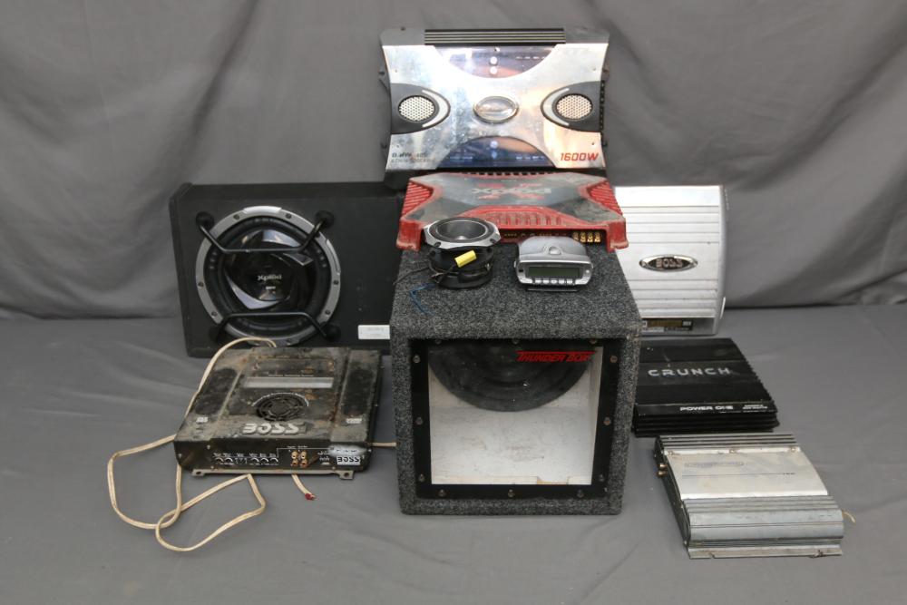 Subwoofers and amps including Crossfire mosfet amplifier TEK 352, Crunch Power One model CR600.4 600 watt amplifier, Sony Xplod model XM-475GSX 800 watt amplifier, Audiopipe ATR-4061 600 watt output power speaker, Boss model CX1100m mono block 1100 watt amplifier, Nitro BMW-485 1600W 4 H/Bridgeable amplifier, Boss 700W amplifier, Sony Xplod model XS-LB10S 1200W subwoofer in low profile sealed box , Power Acoustik subwoofer in Thunder Box bandpass box. Pickup only.