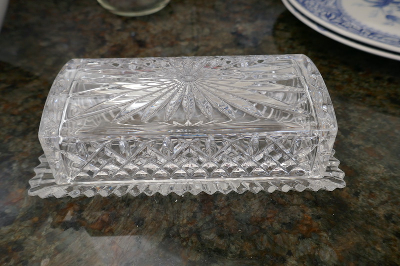 Kitchen and barware items including; Waterford Crystal Butter dish; 2 Spode Plates; glass fish plates; wine glasses; cordial glasses; Book Cordial set with one drawer; and much more; Buyer must take all; Please bring packaging to safely remove from home; Items are located in walk-out basement.