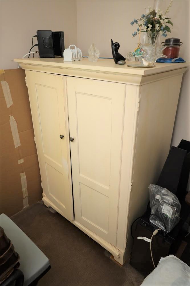 Computer desk with two doors 42" x 24" x 54", wood and metal frame futon, framed artwork, stacking L shaped bookcases approx. 77" x 18" x 26" as configured, filing cabinet 31" x 19" x 28" tall. Largest artwork 38" x 32", smallest 12" x 10". Buyer must take all. Excludes all contents and other items.