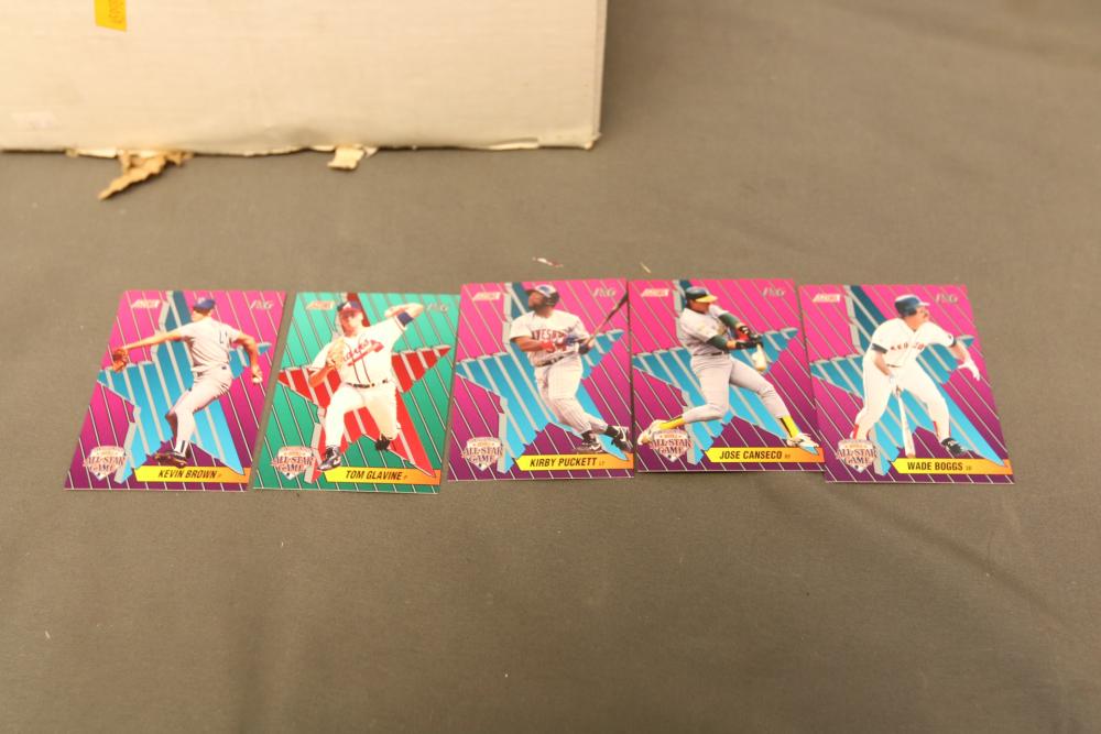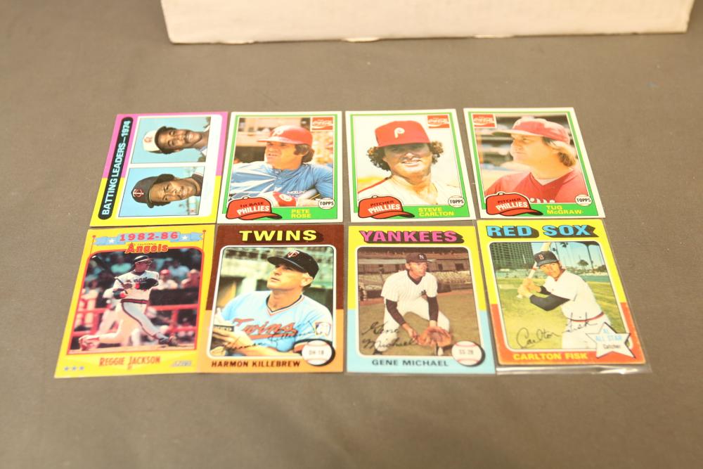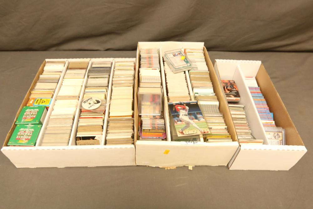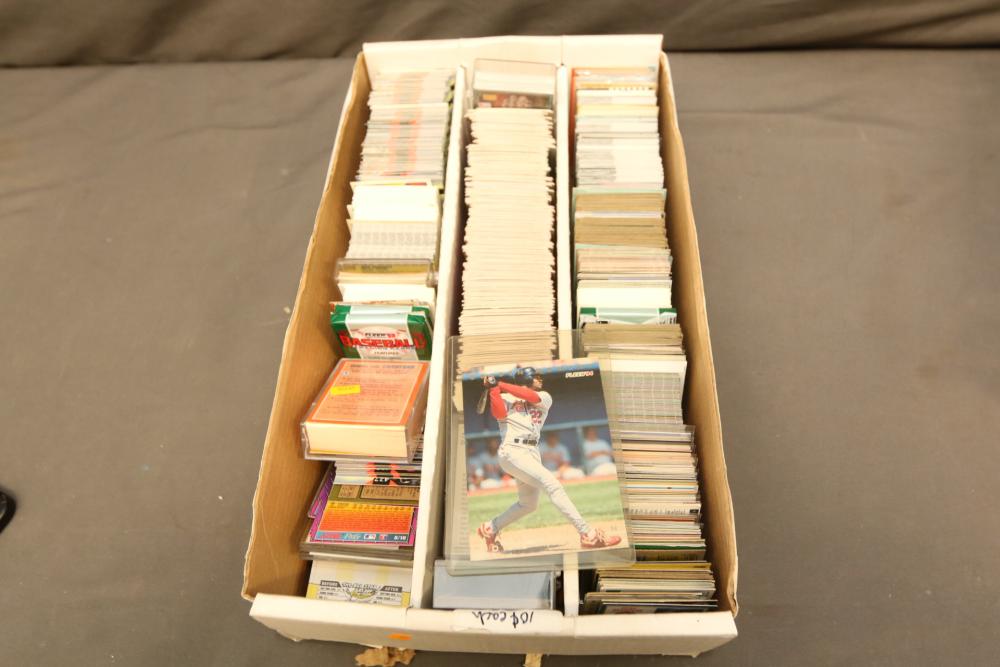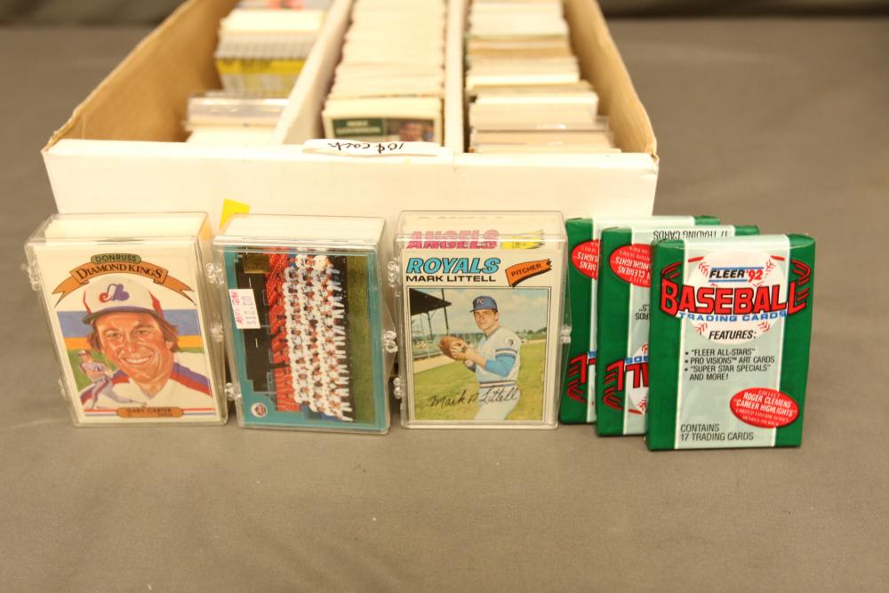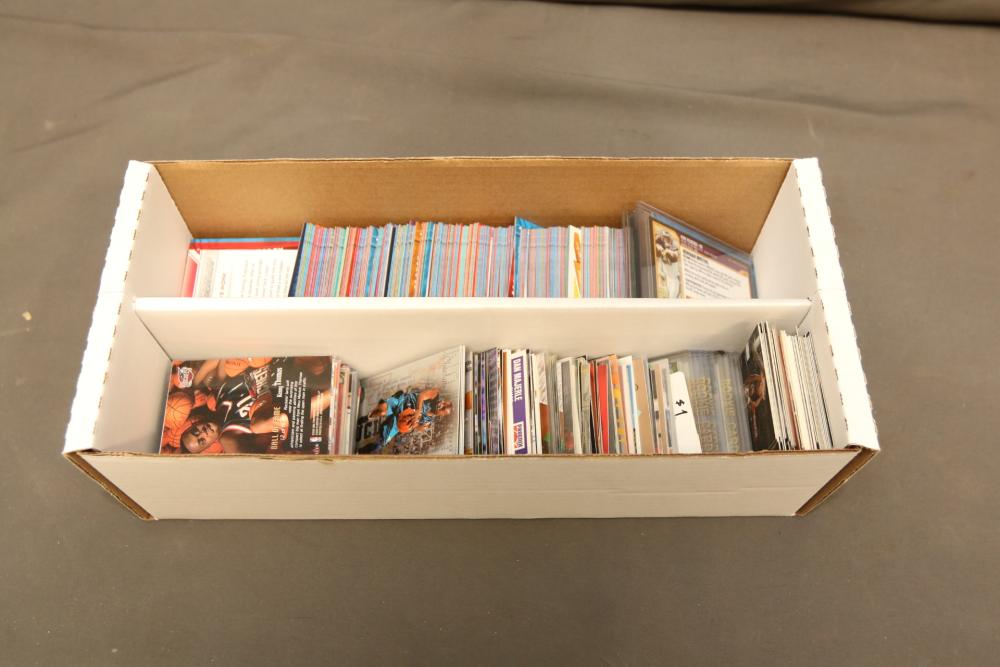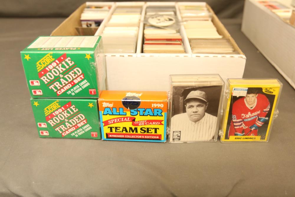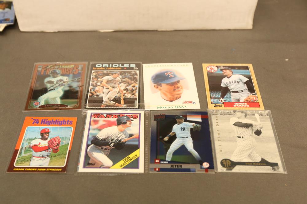 Collection of sports cards incl baseball, basketball, football and hockey in varying sets and years including some sealed sets. Some names include Carlton Fisk, Harmon Killebrew, Gene Michael, Pete Rose, Reggie Jackson, Joey Galloway, William Floyd, Don Mattingly, Nolan Ryan, Wade Boggs, Bob Gibson, Keith van Horn, Stephan Marbury, Carlos Beltran