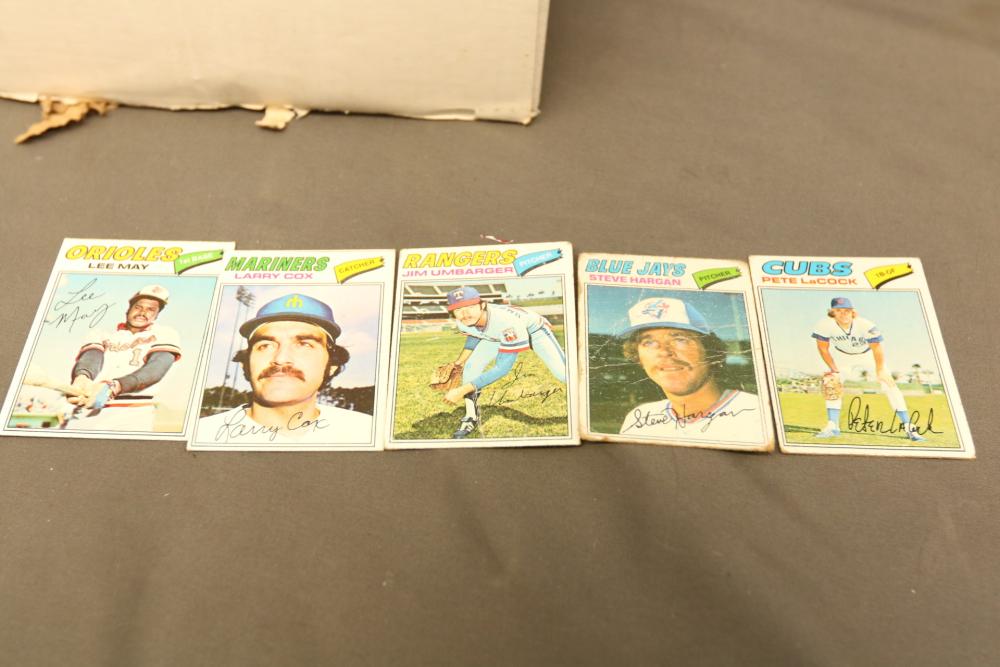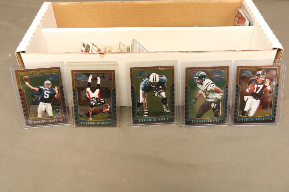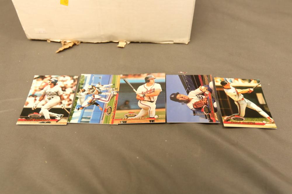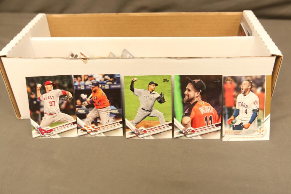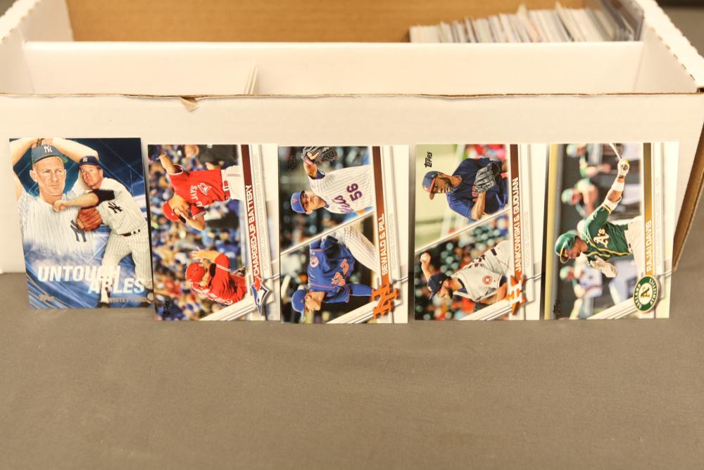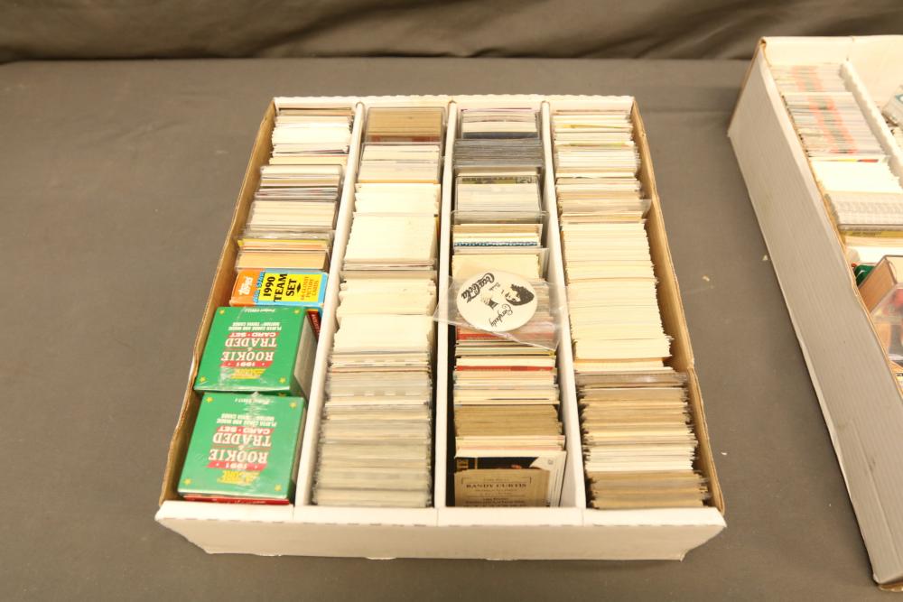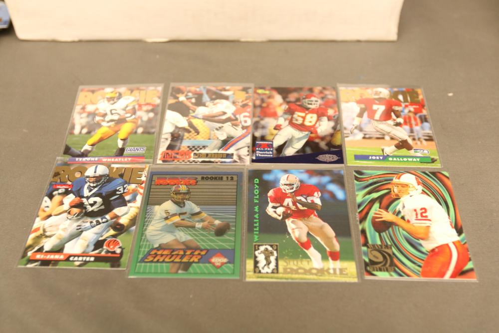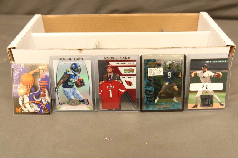Collection of sports cards incl baseball, basketball, football and hockey in varying sets and years including some sealed sets. Some names include Carlton Fisk, Harmon Killebrew, Gene Michael, Pete Rose, Reggie Jackson, Joey Galloway, William Floyd, Don Mattingly, Nolan Ryan, Wade Boggs, Bob Gibson, Keith van Horn, Stephan Marbury, Carlos Beltran