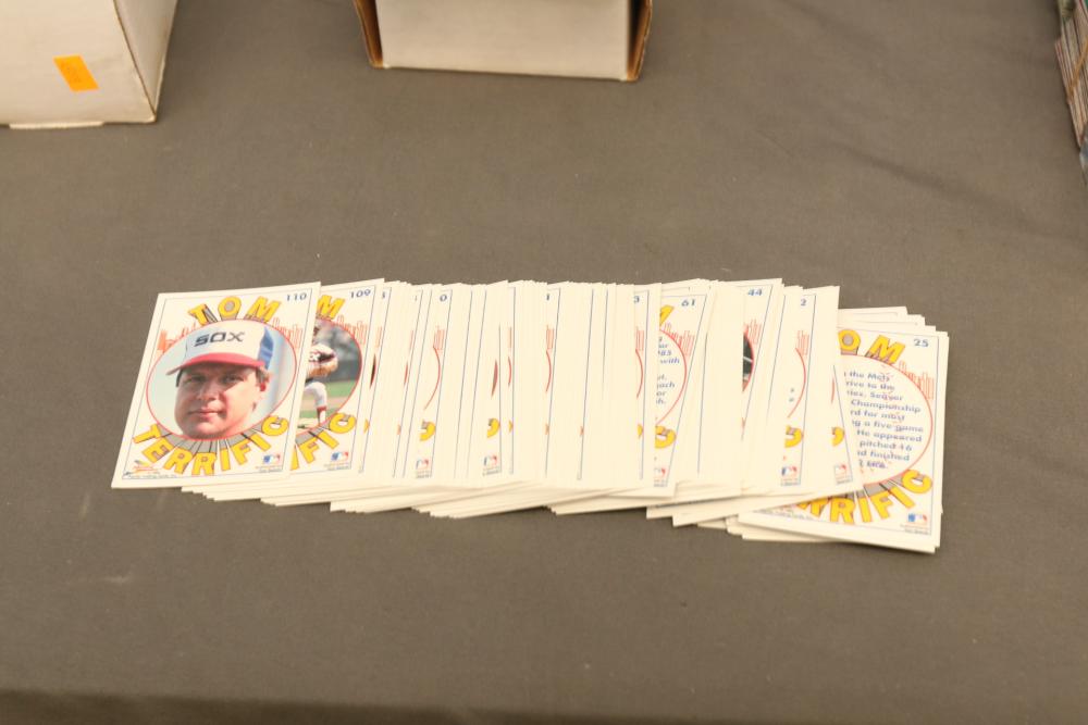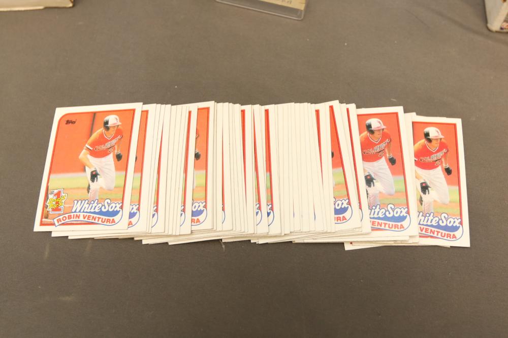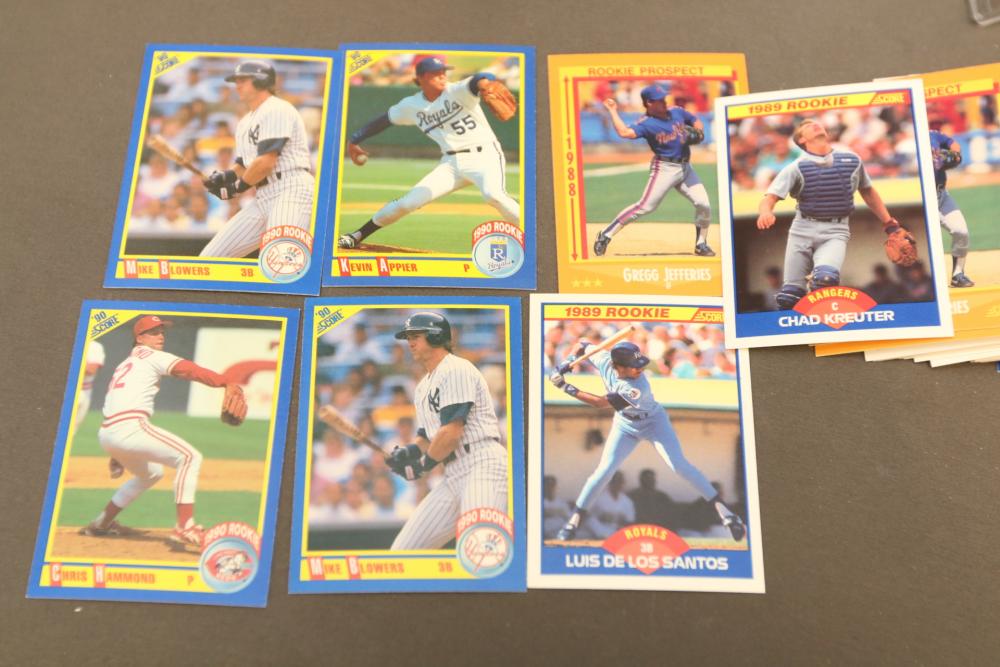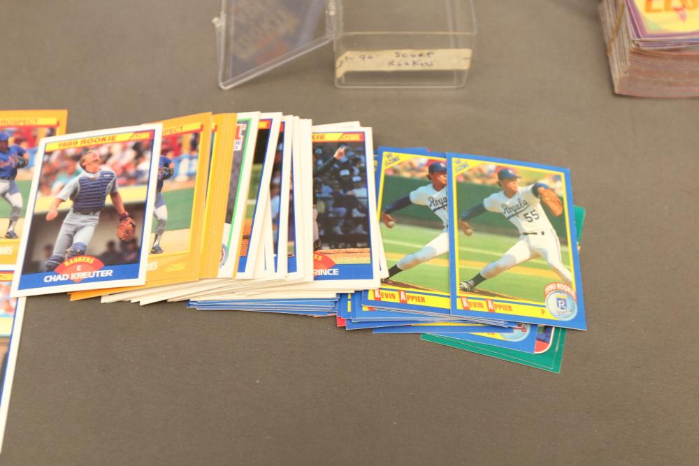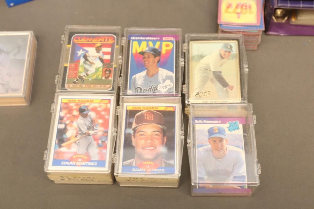 Collection of baseball cards of varying sets and years. Includes some sealed sets and rookie cards. Some names Hubie Brooks, Fred Lynn, Rick Rhoden, Kevin Mcreynolds, Gary Sheffield, Robin Ventura, Tom Seaver, Roberto Clemente, Sandy Alomar, Rich Gossage, Greg Maddux