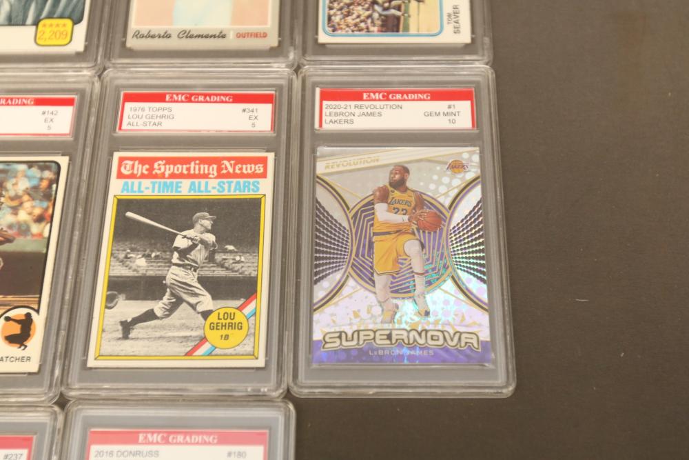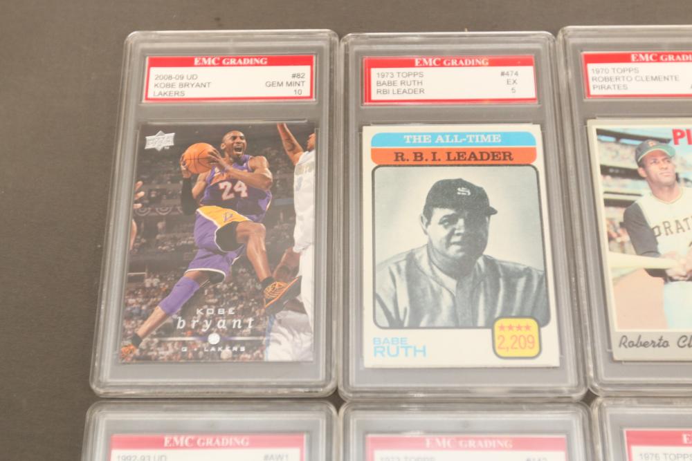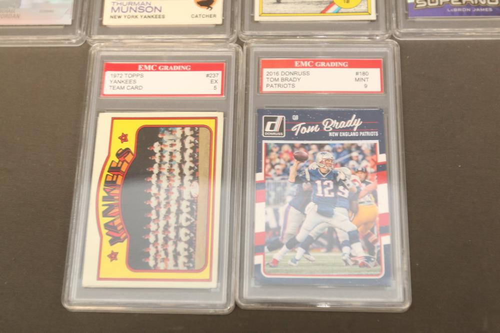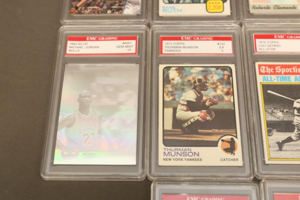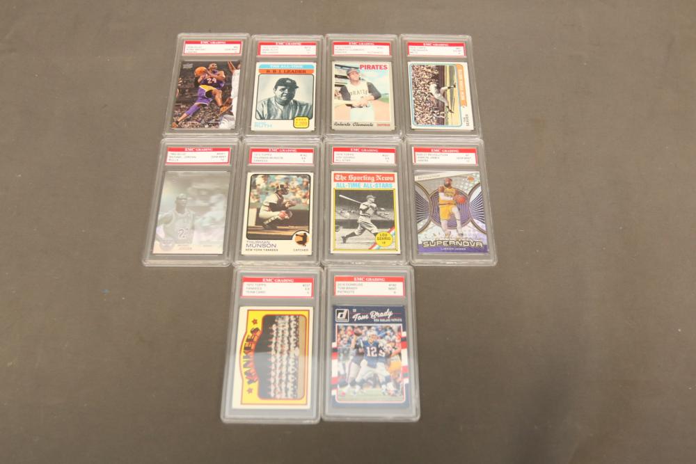10 slabbed and graded cards names include, Kobe Bryant, Babe Ruth, Roberto Clemente, Tom Seaver, Michael Jordan, Thurman Munson, Lou Gehrig, Lebron James, Tom Brady and Yankees team card.