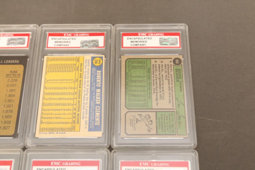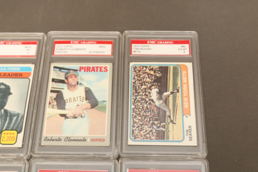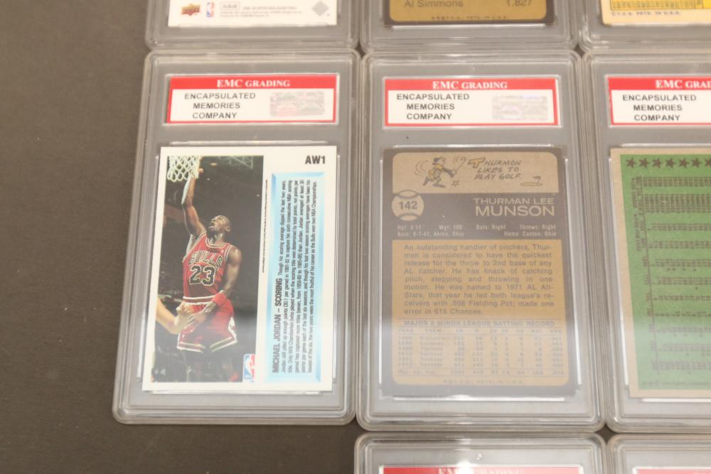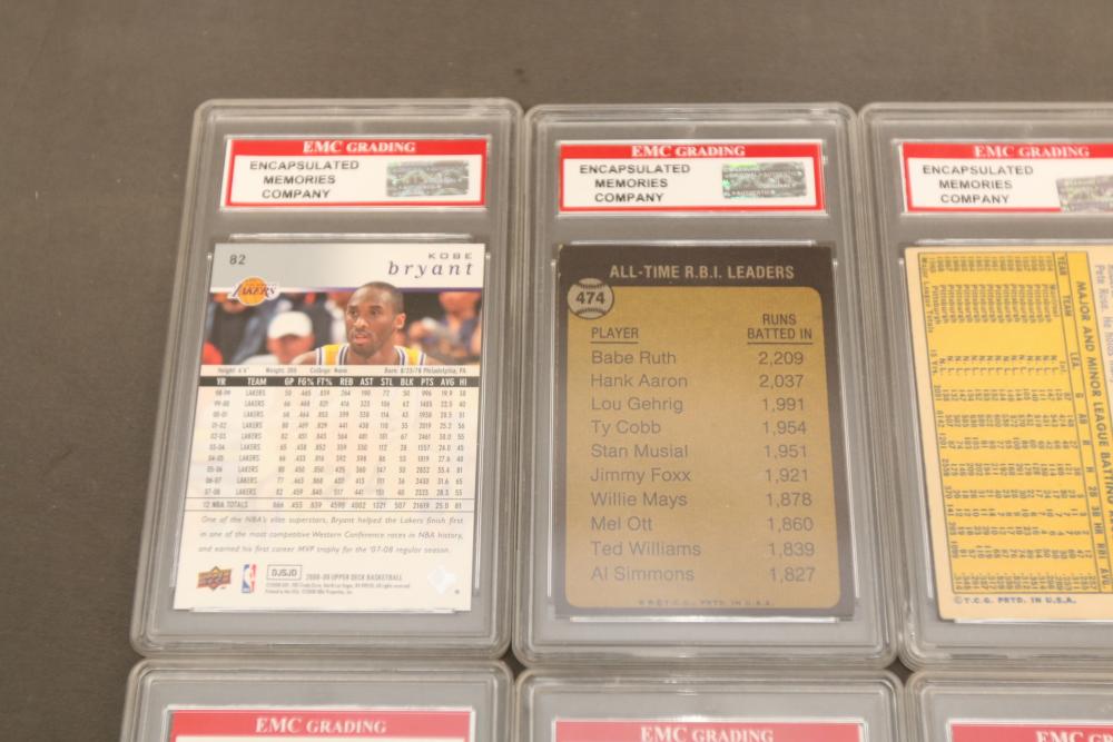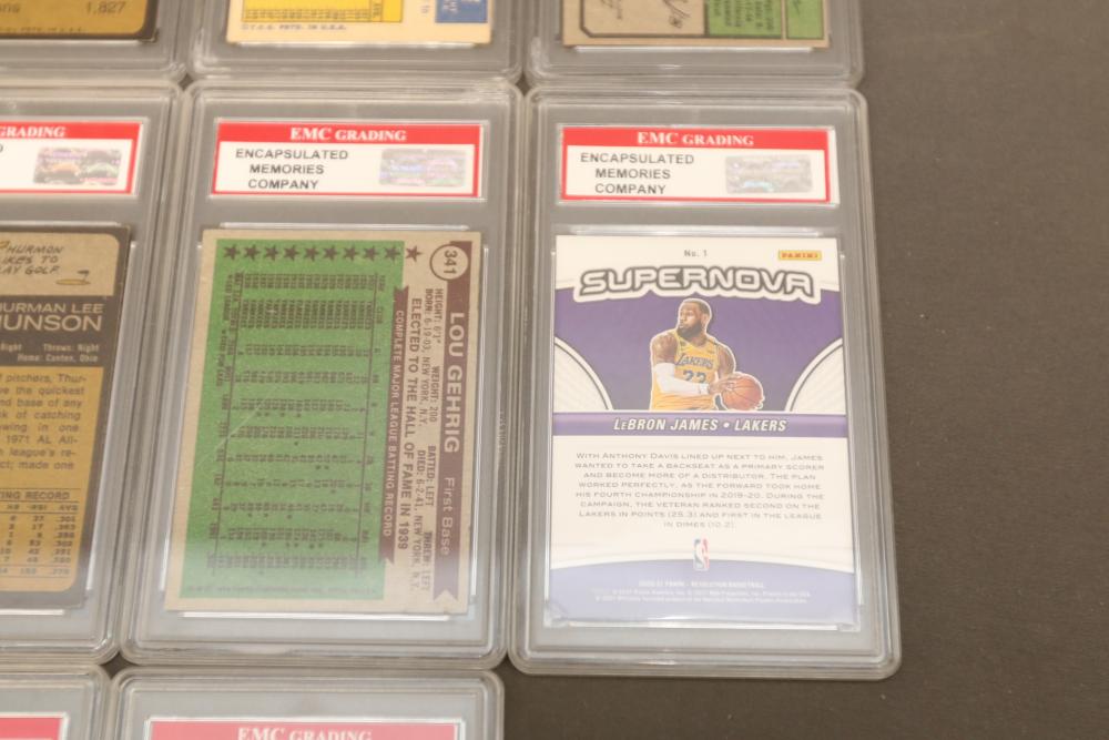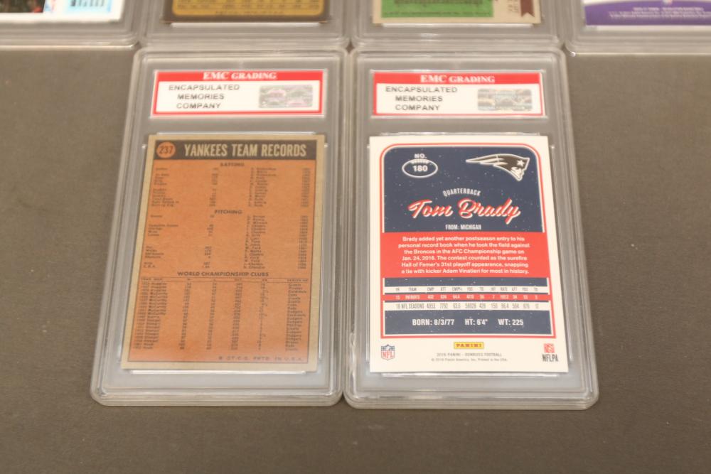 10 slabbed and graded cards names include, Kobe Bryant, Babe Ruth, Roberto Clemente, Tom Seaver, Michael Jordan, Thurman Munson, Lou Gehrig, Lebron James, Tom Brady and Yankees team card.