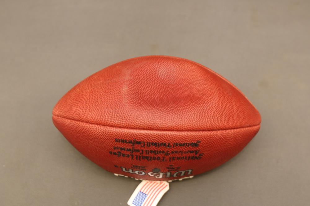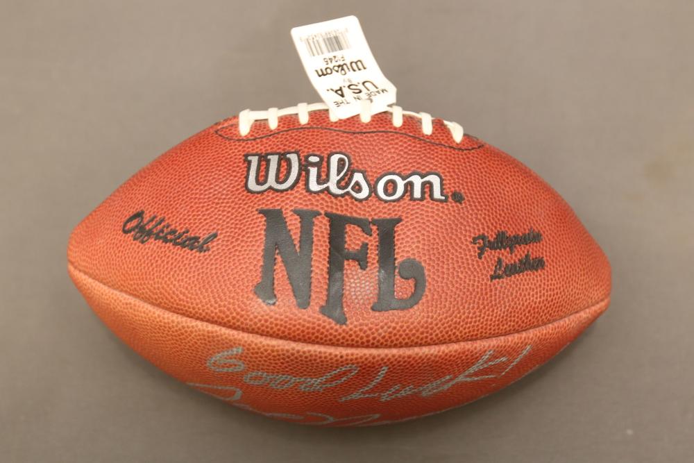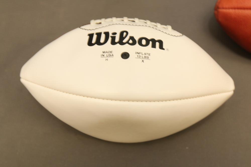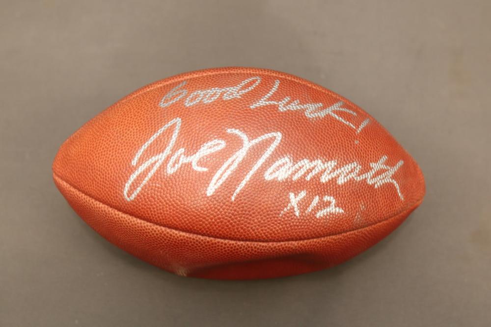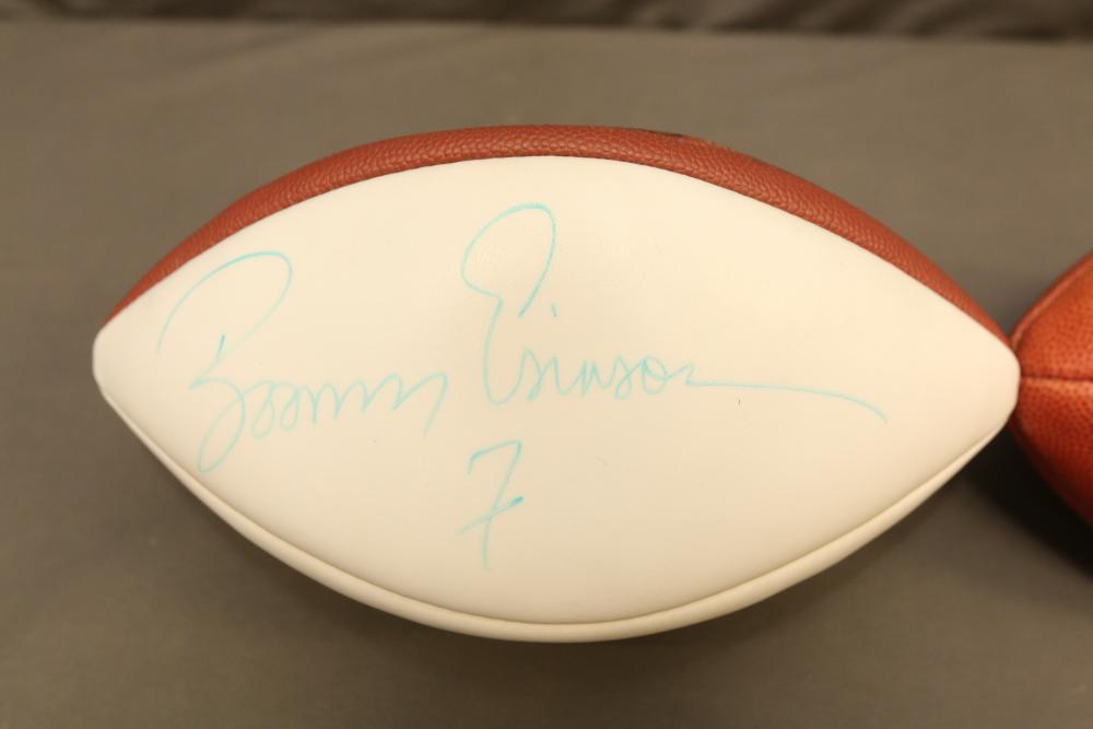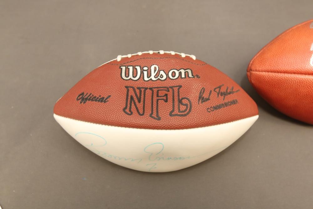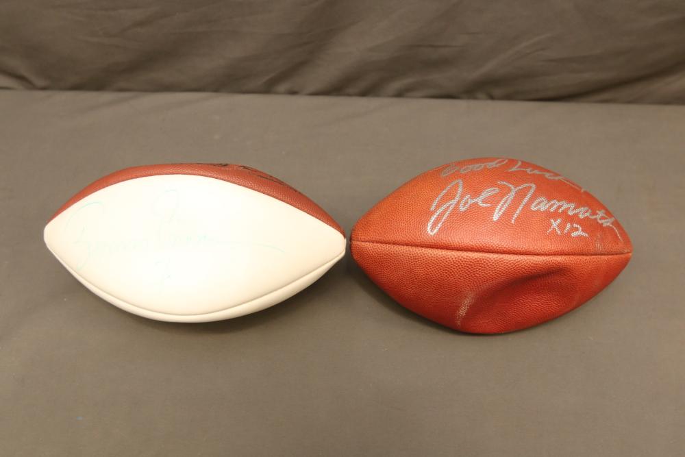 Two Wilson footballs including one signed " Good Luck Joe Namath x12", other signed "Boomer Esiason 7".
