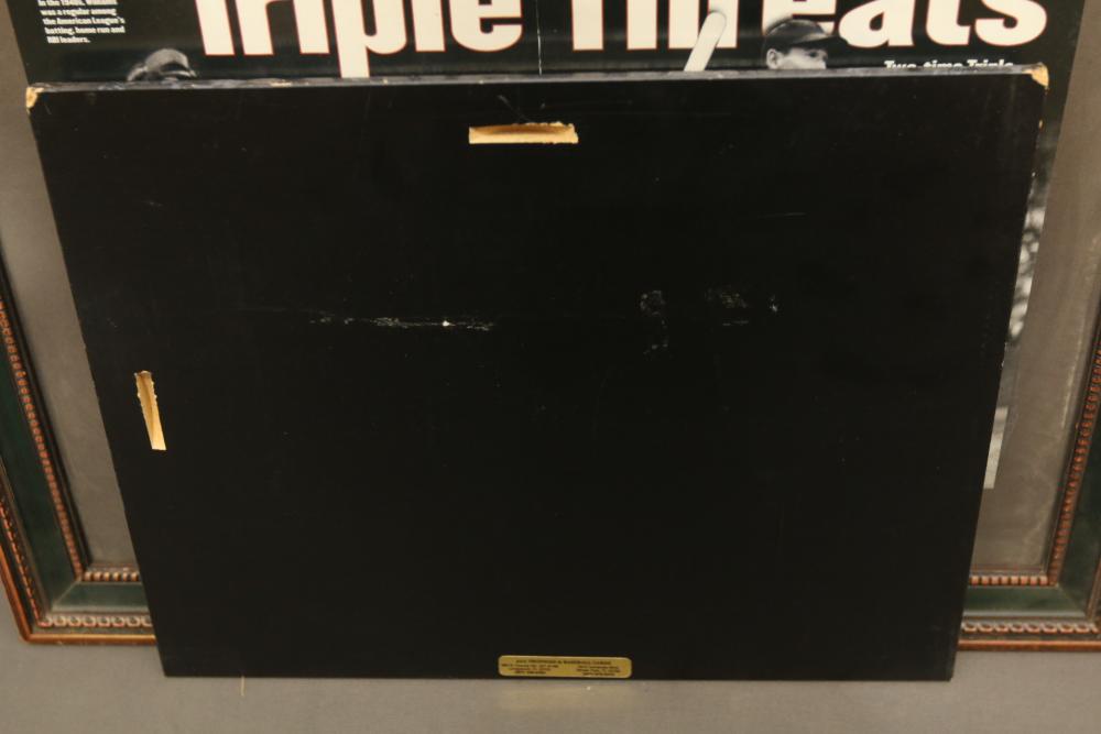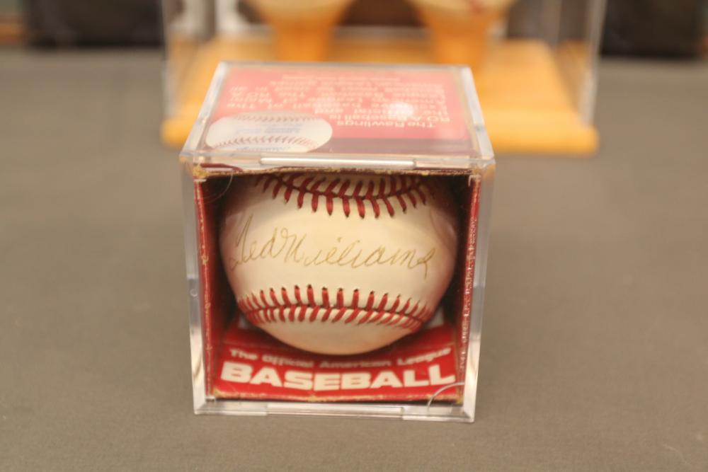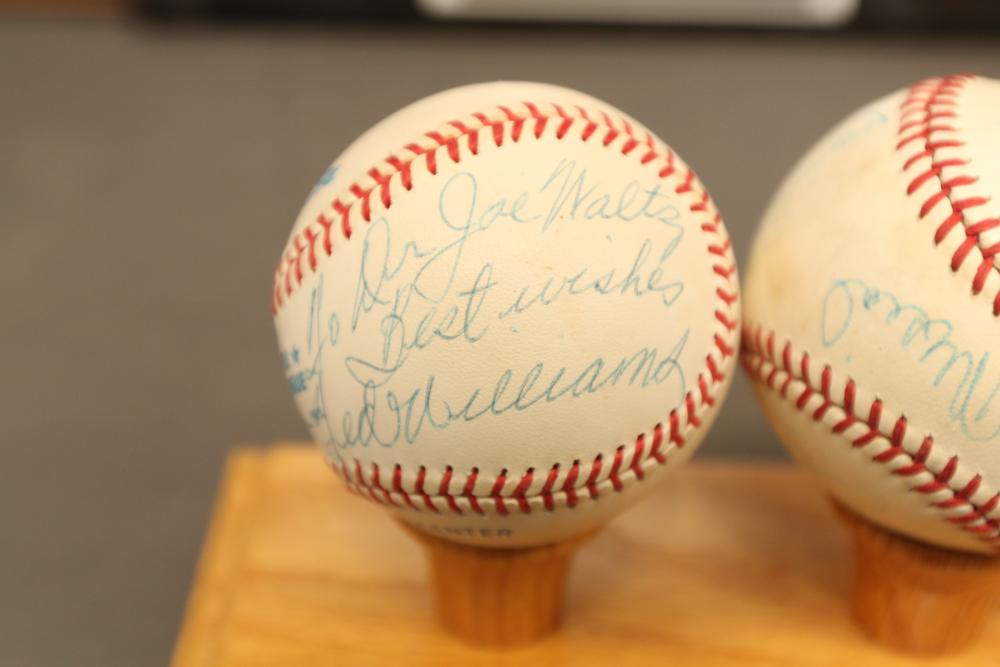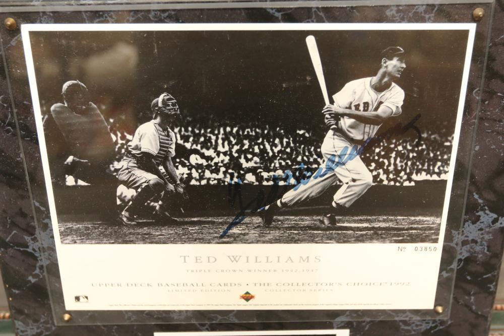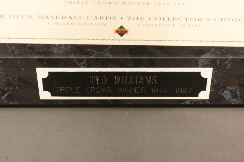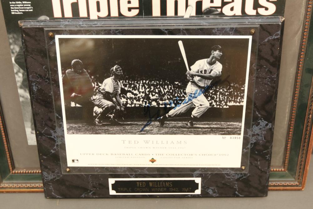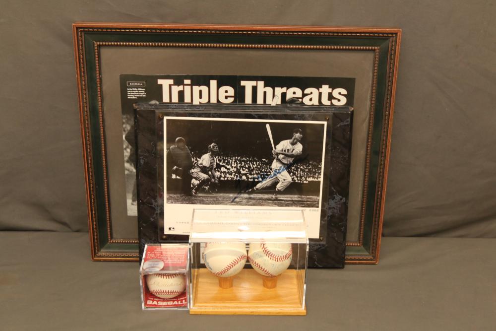 baseballs signed "Ted Williams" and multiple other players in Lucite wooden case, 1940's Ted Williams "Triple Threats" framed piece, and Triple Crown Winner 1942 & 1947 numbered 03850 in frame.