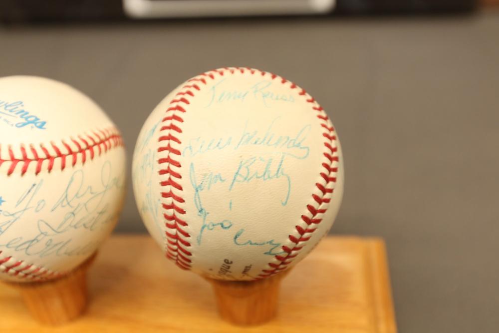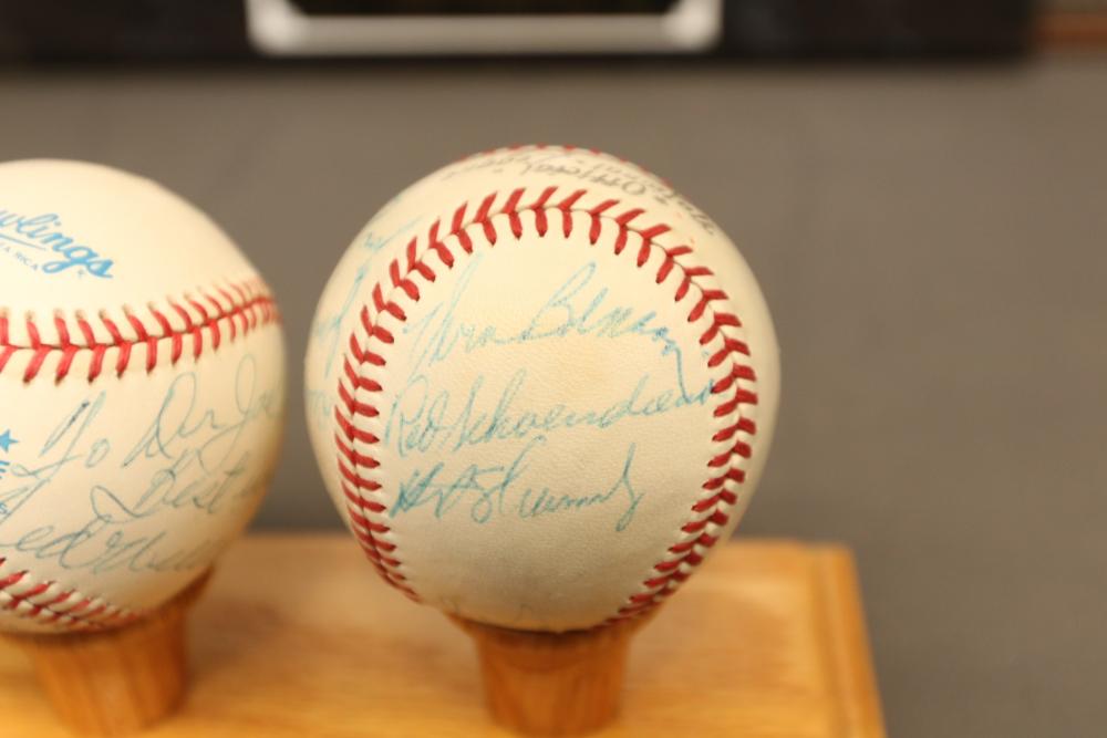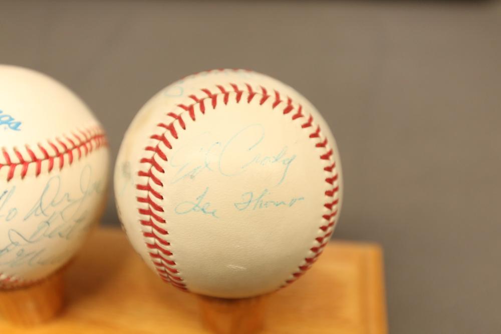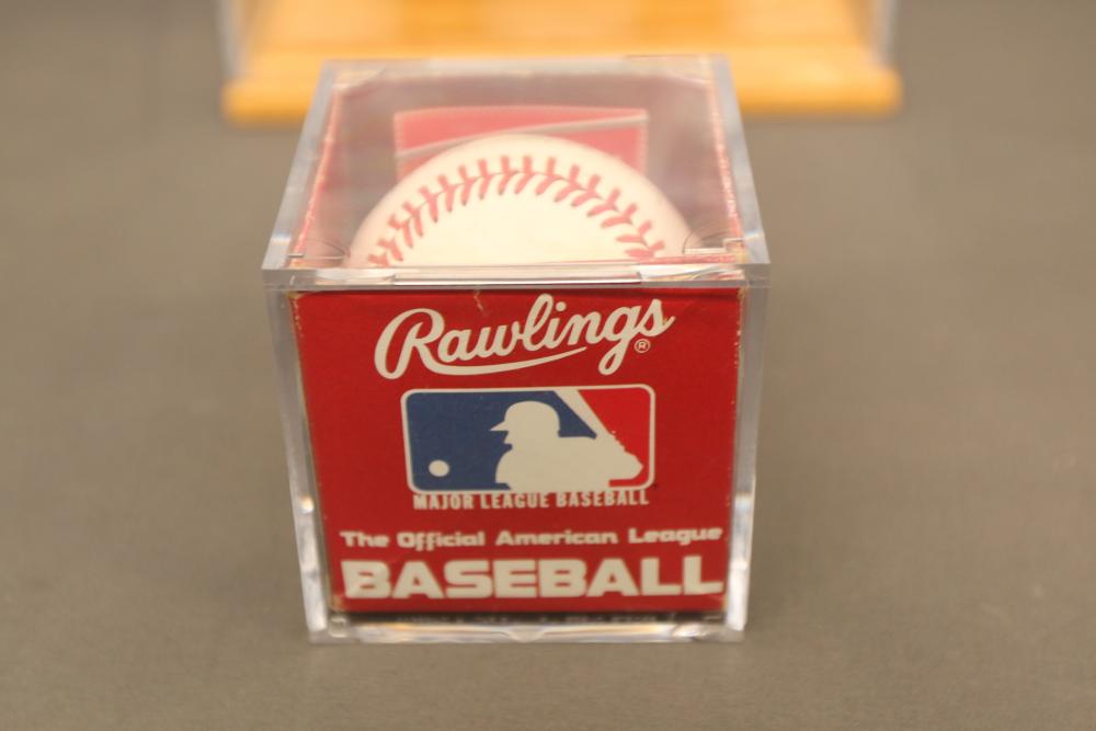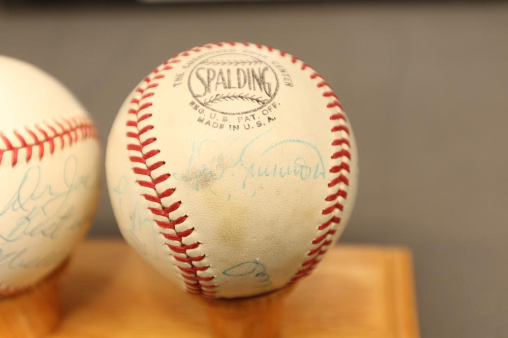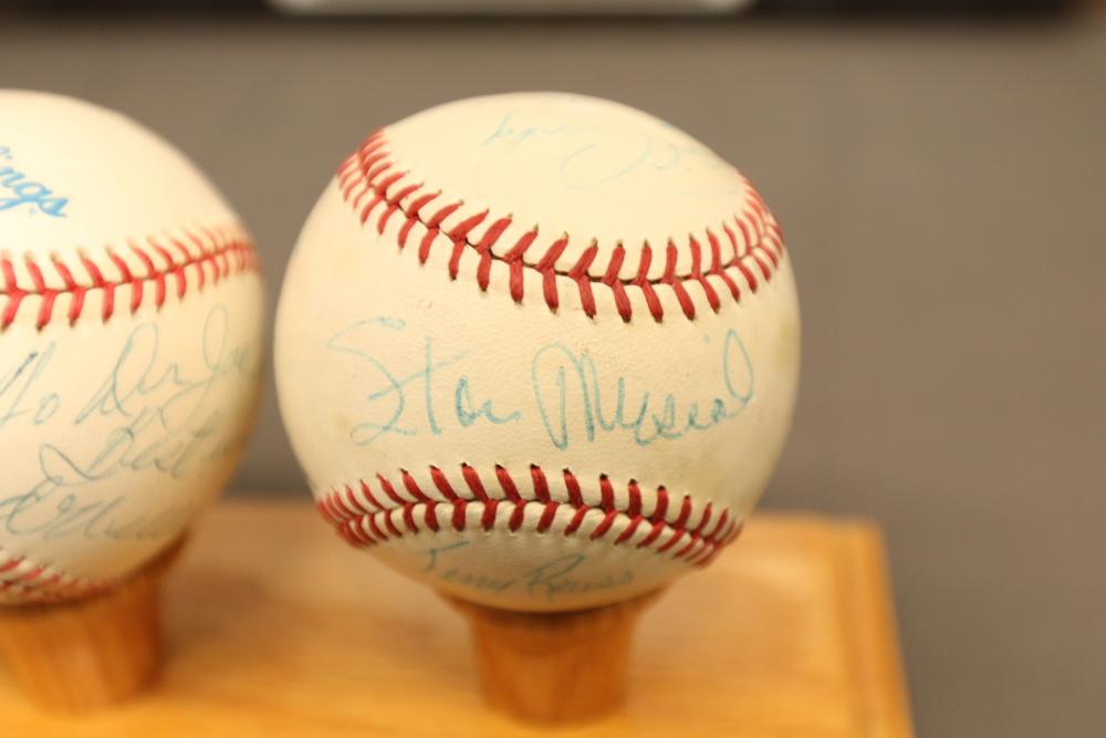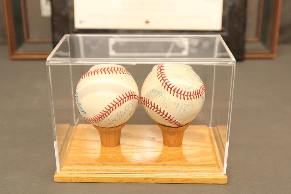 baseballs signed "Ted Williams" and multiple other players in Lucite wooden case, 1940's Ted Williams "Triple Threats" framed piece, and Triple Crown Winner 1942 & 1947 numbered 03850 in frame.