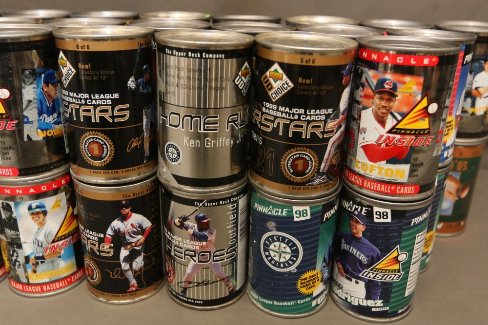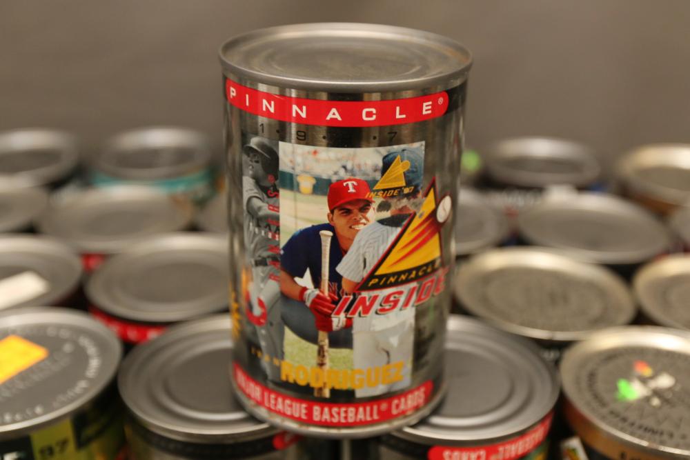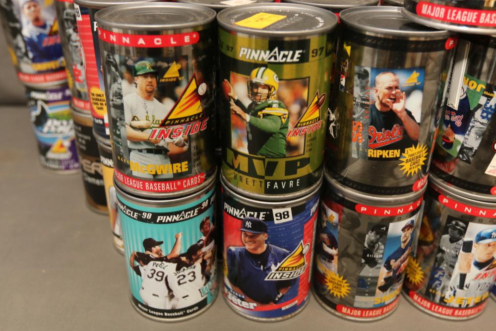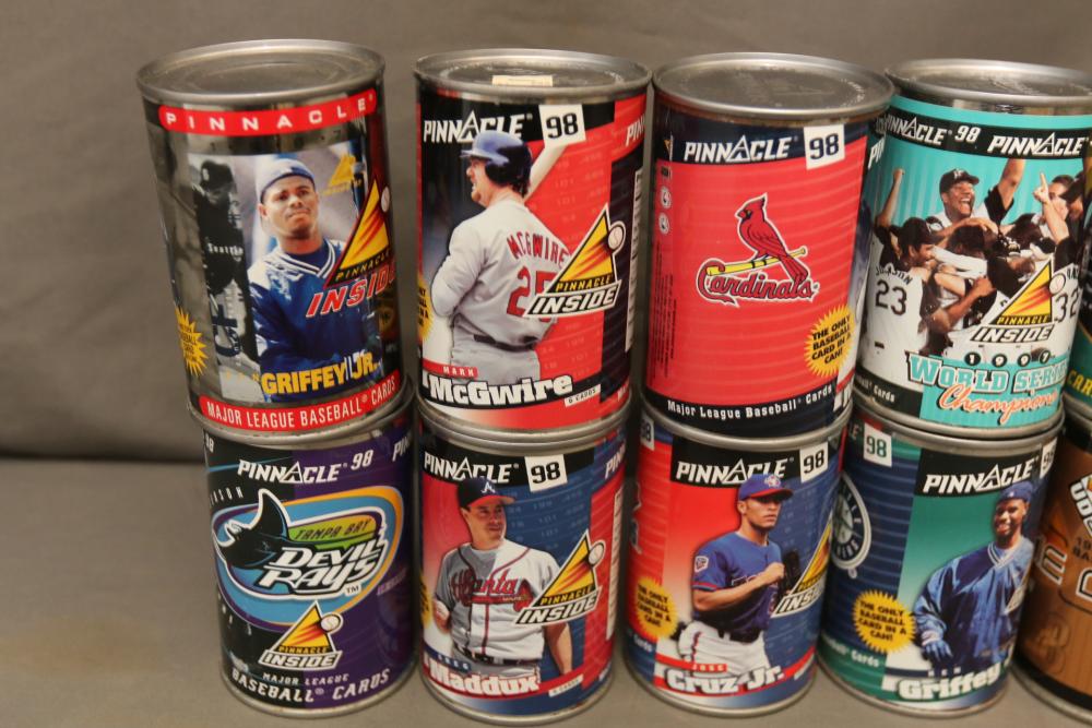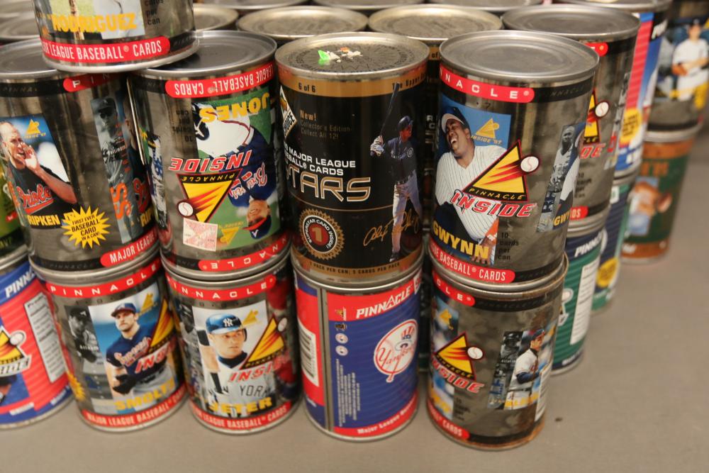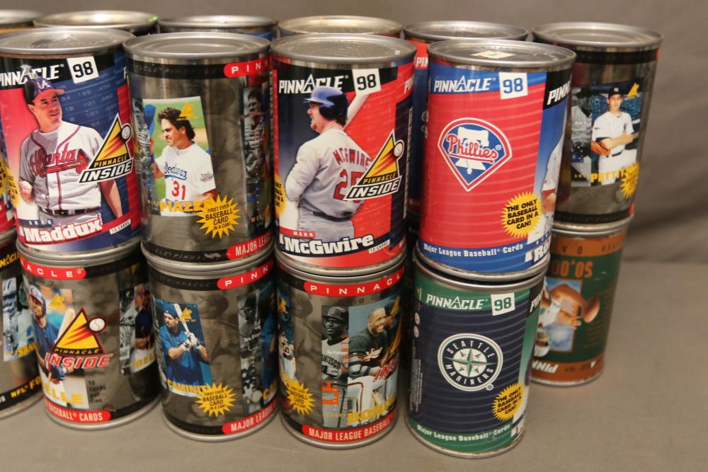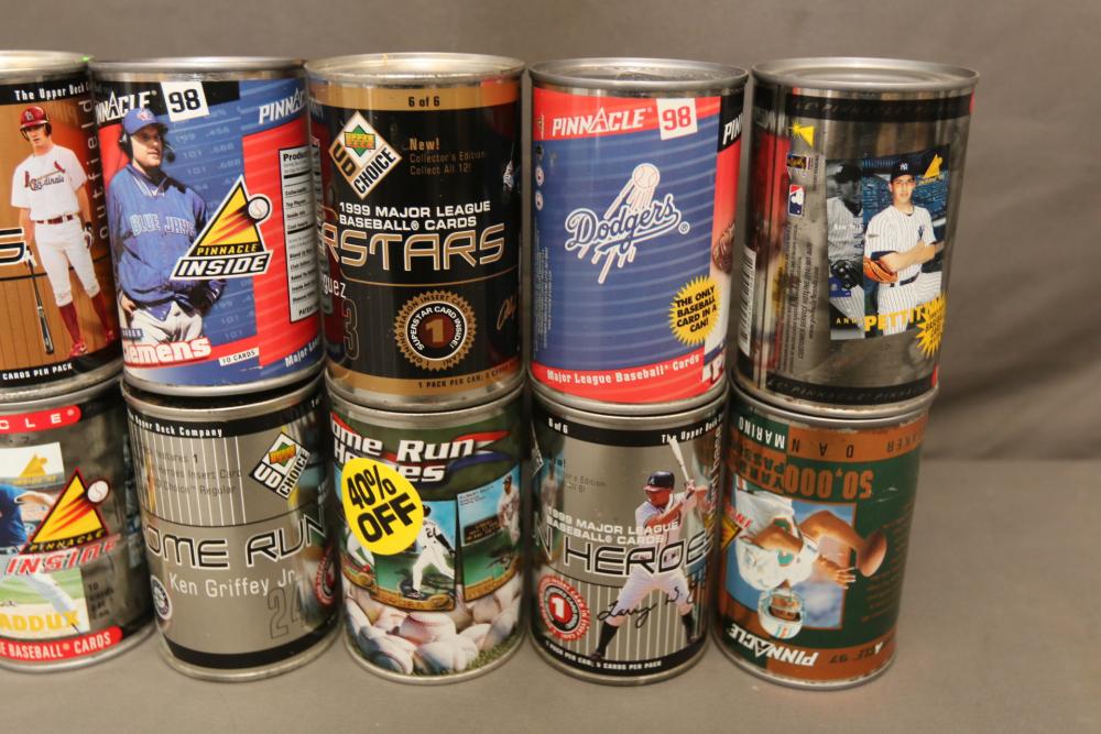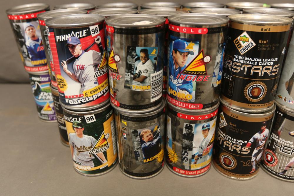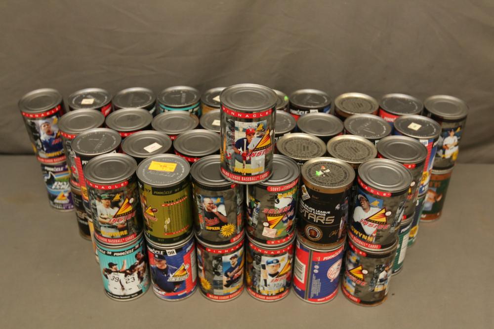 Sealed sports card "tin cans" primarily baseball, with some football tins, makers include Pinnacle and Upper Deck. Over 60 tins total. Pickup only.