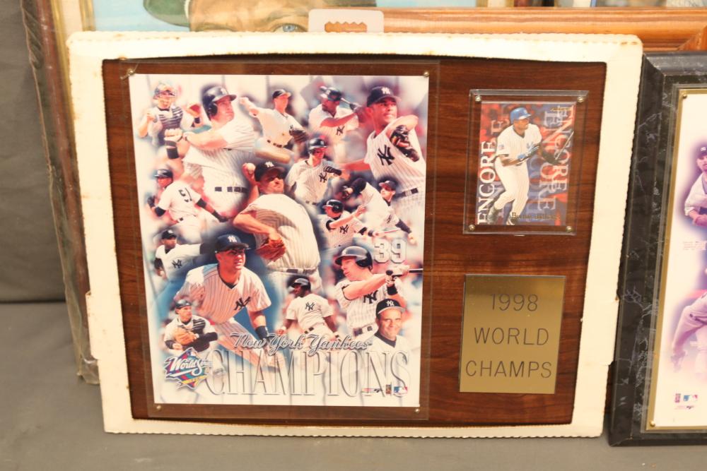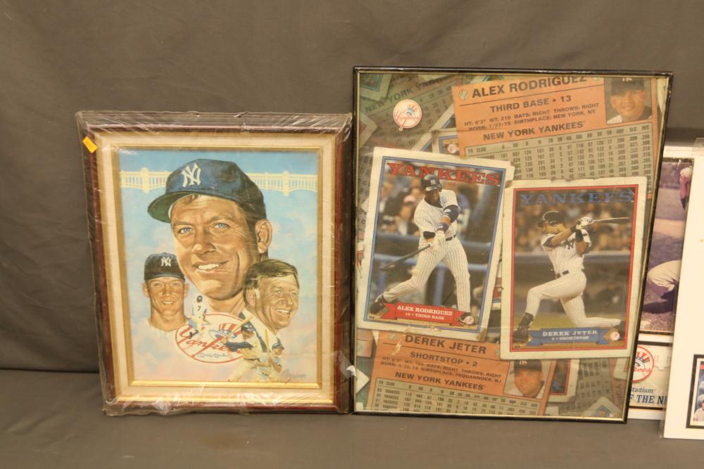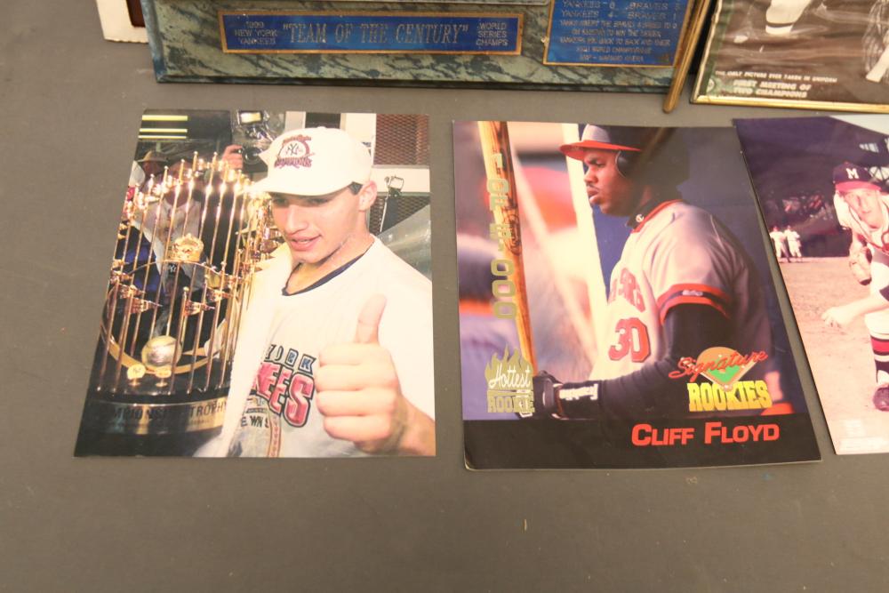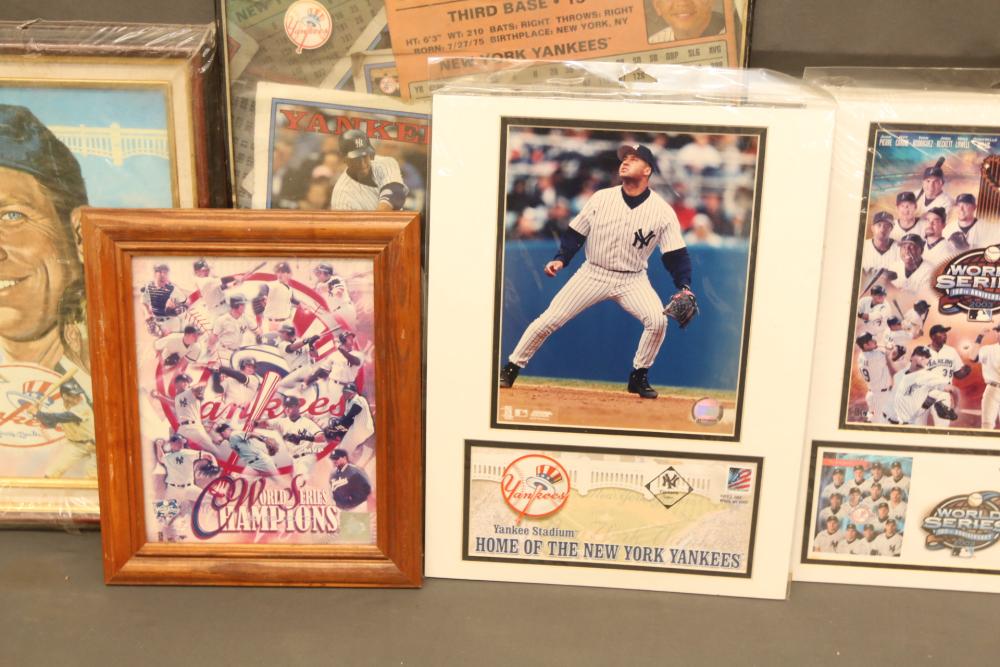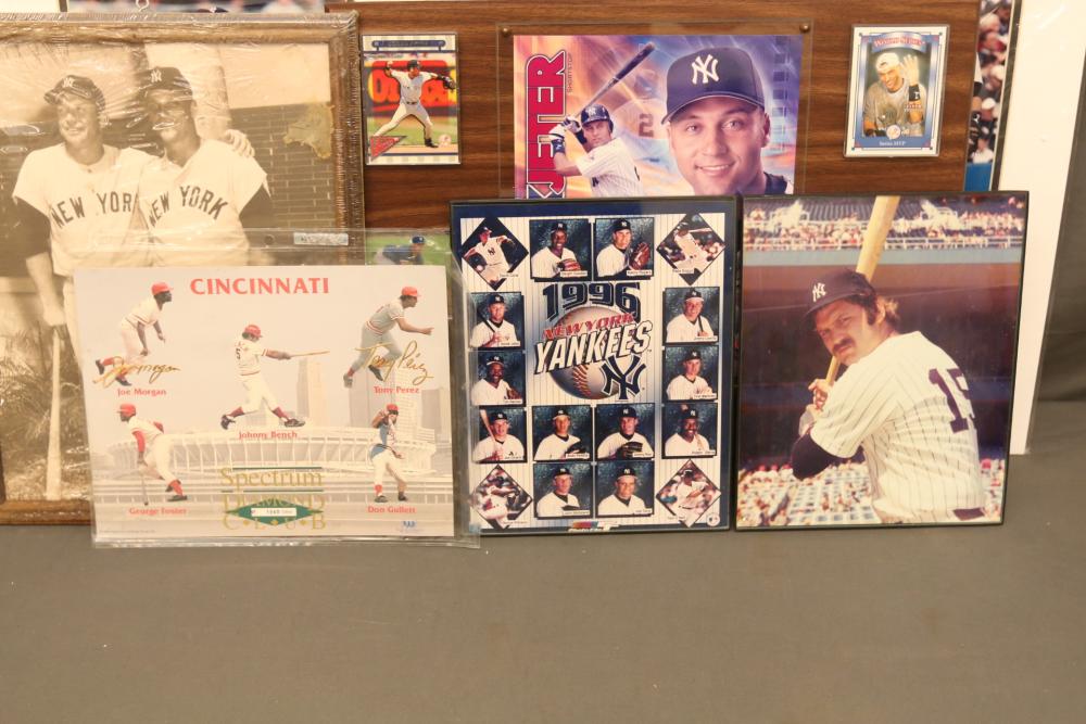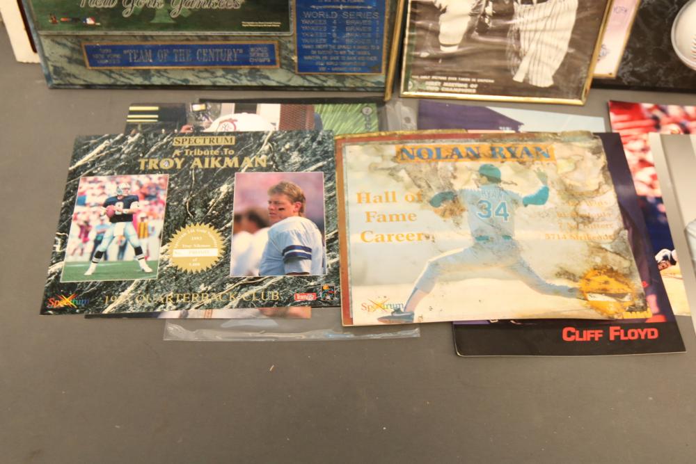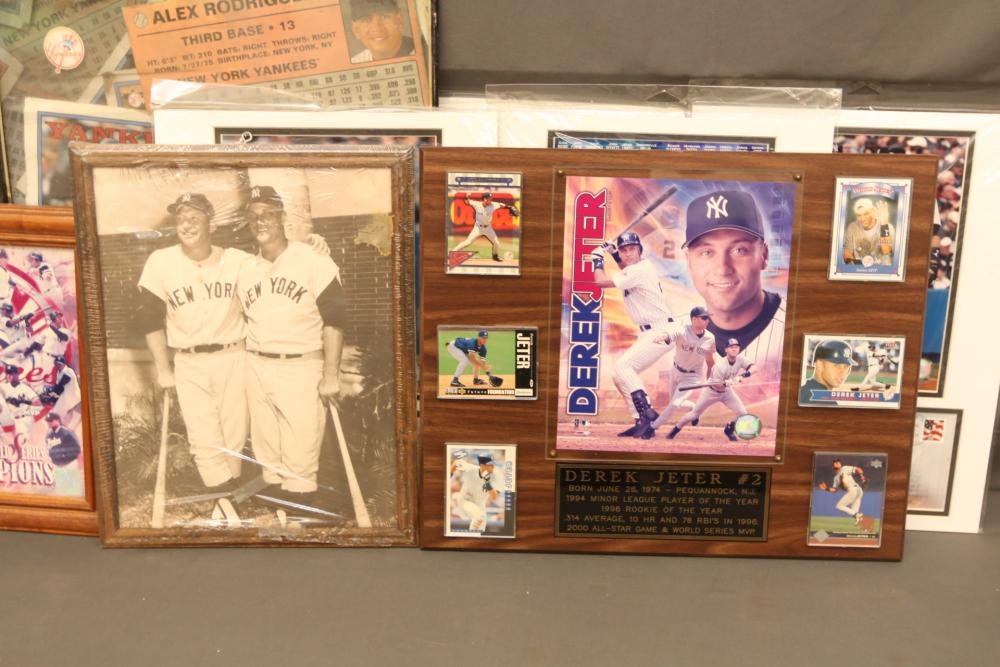 Sports related photographs, posters, prints, including Joe DiMaggio, Troy Aikman, Nolan Ryan, Chipper Jones, Cliff Floyd, Derek Jeter, Brett Favre, 1999 World Series Champions, 1998 World Series Champs plaques, Mickey Charles Mantle "The Mick" plaque, Derek Jeter plaque with cards, New York Yankees display pieces, etc. Pickup only.