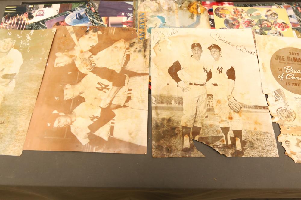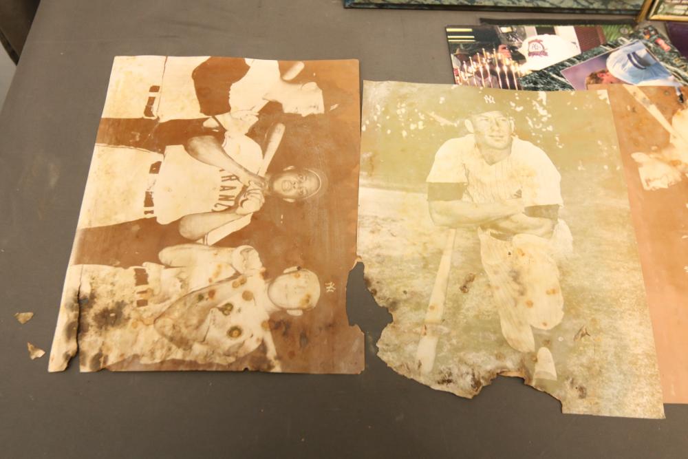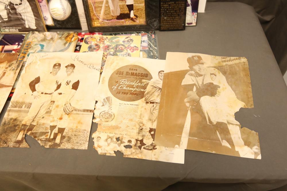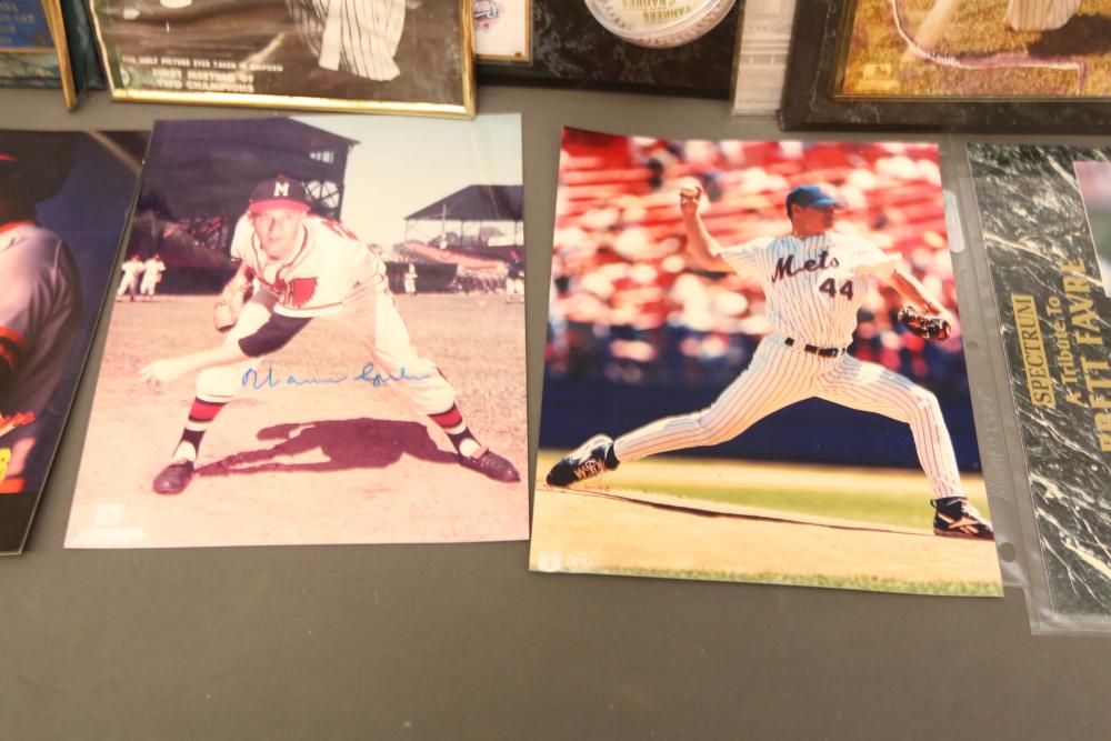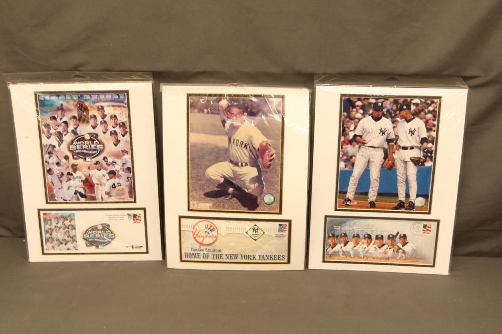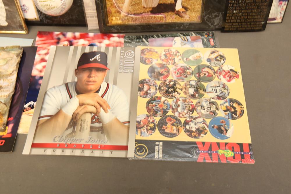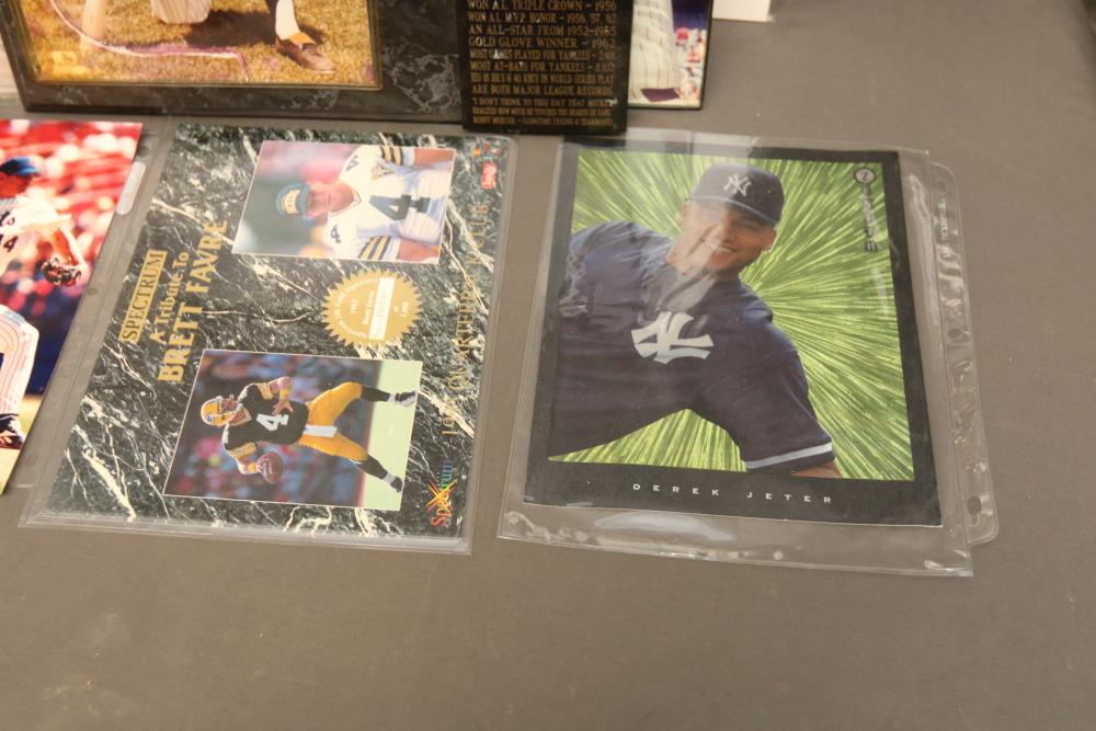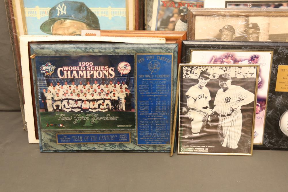Sports related photographs, posters, prints, including Joe DiMaggio, Troy Aikman, Nolan Ryan, Chipper Jones, Cliff Floyd, Derek Jeter, Brett Favre, 1999 World Series Champions, 1998 World Series Champs plaques, Mickey Charles Mantle "The Mick" plaque, Derek Jeter plaque with cards, New York Yankees display pieces, etc. Pickup only.