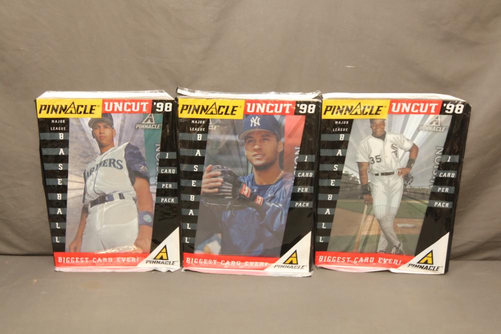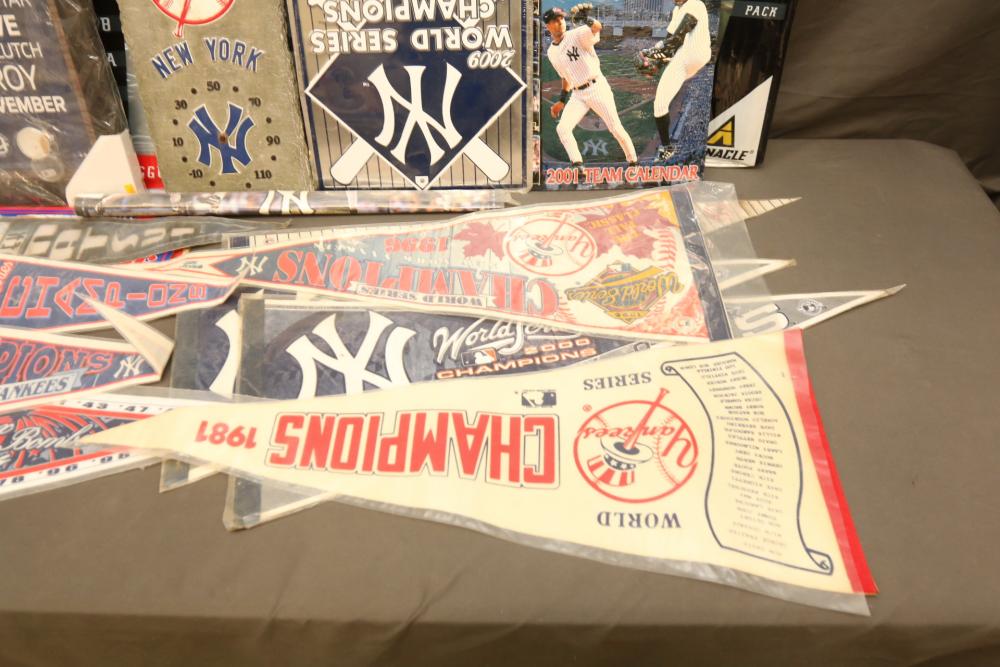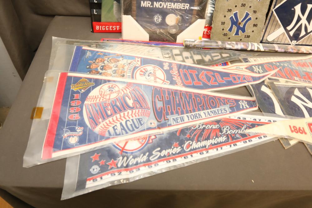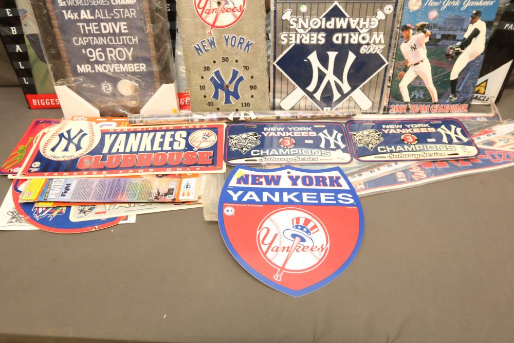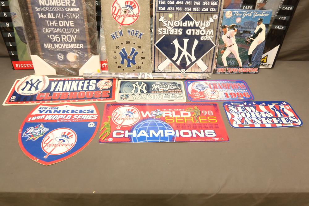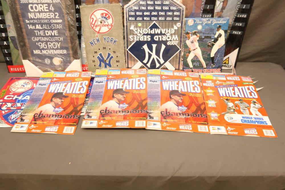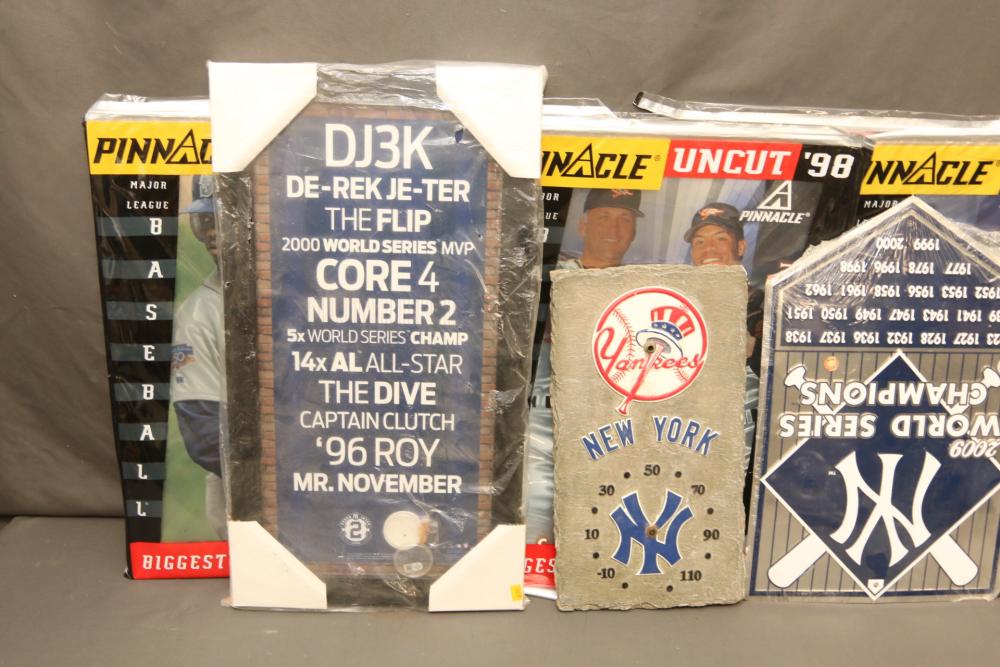 New York Yankees memorabilia including Derek Jeter plaque, NY Yankees decorative license plates, Yankees Clubhouse sign, Wheaties advertising boxes, 1996 American League Champions, 1981 Champions, 2001 team calendar, also including Pinnacle "Uncut 98 Biggest Card Ever", etc. Pickup only.