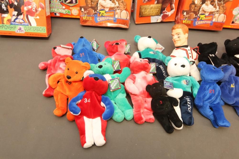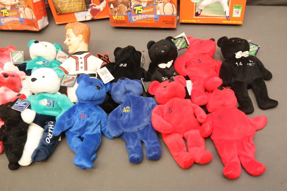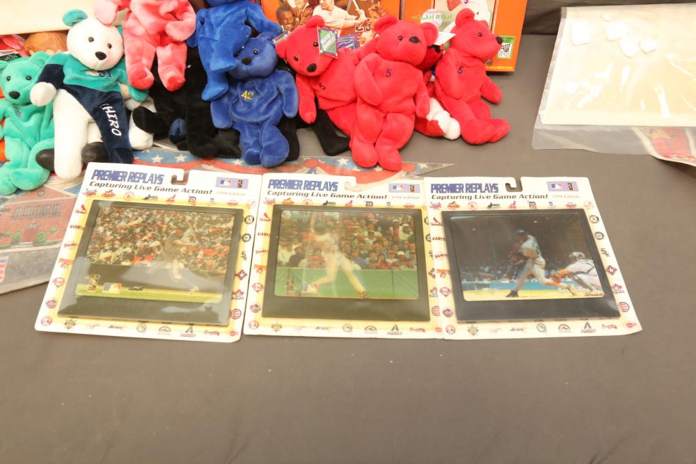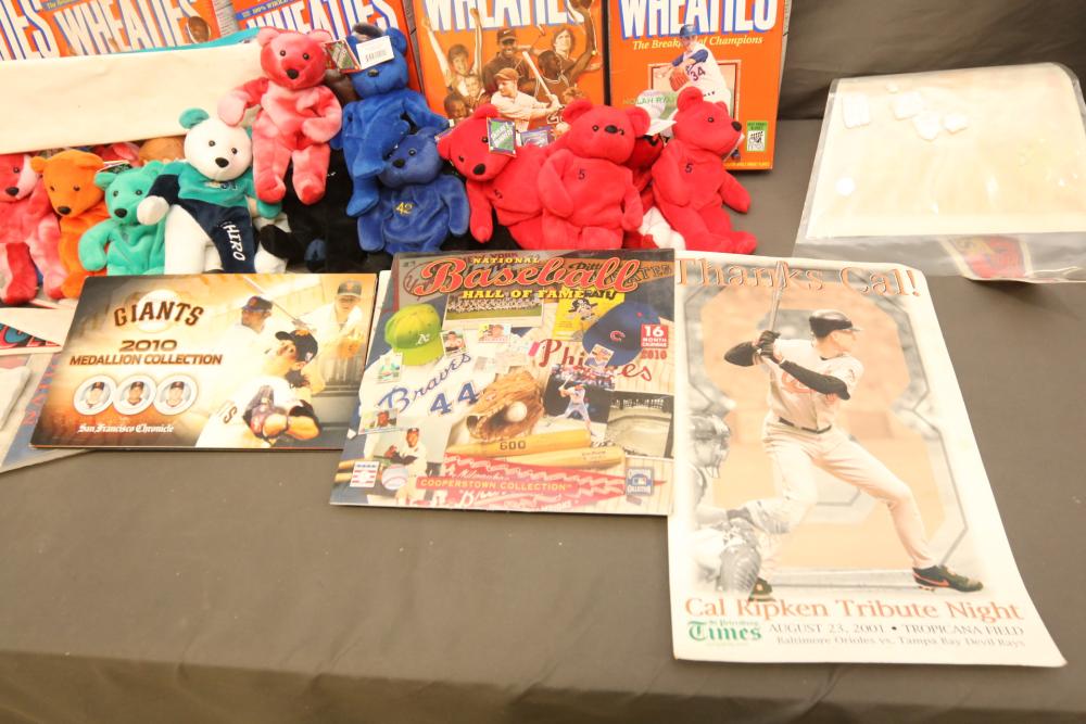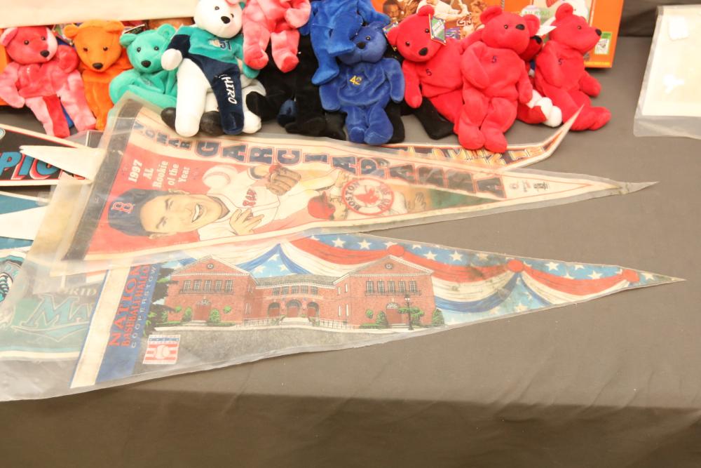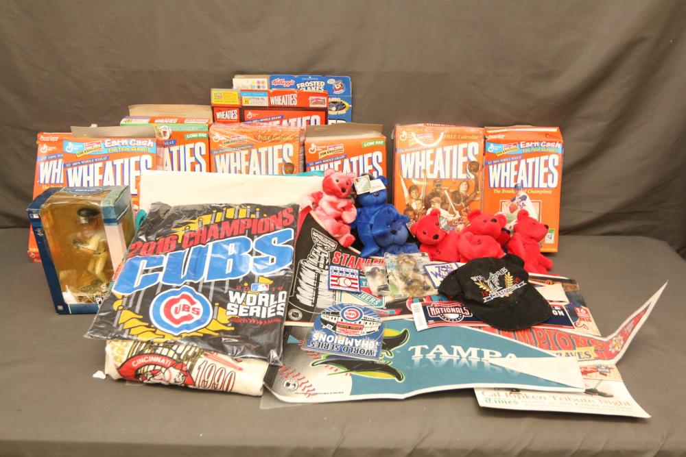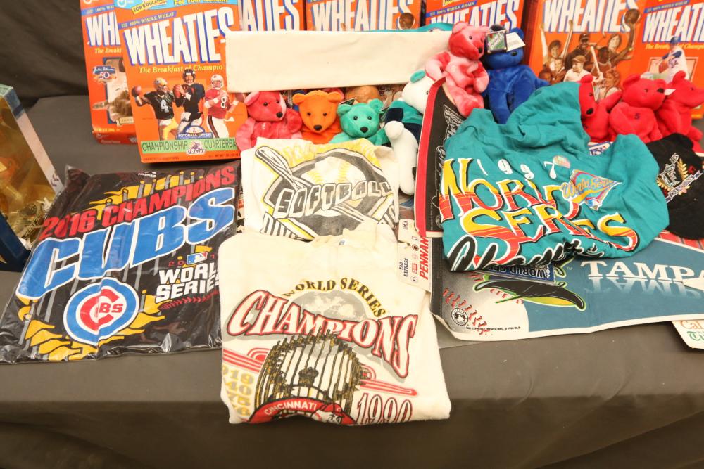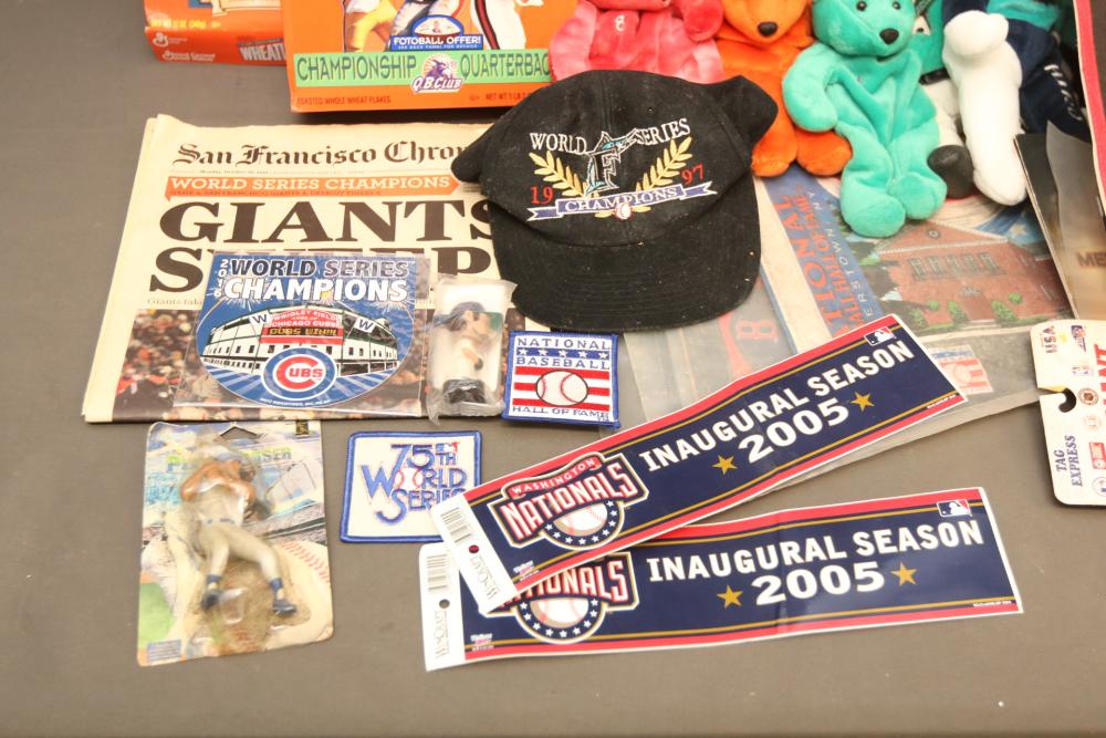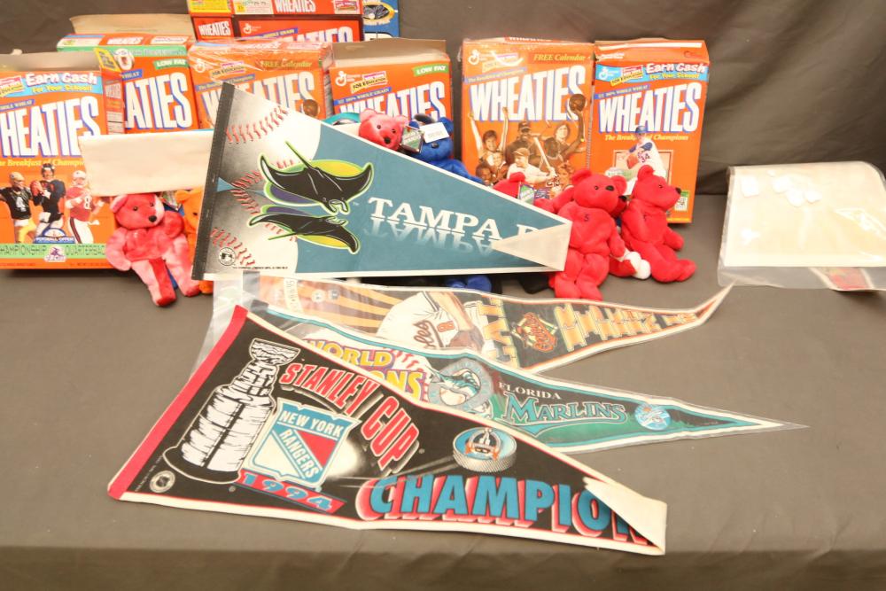 Sports Memorabilia including patches, World Series hat, bumper stickers, beanie babies, newspaper, Giants medallion collection, premier replays, decorative pendant flags including Tampa Rays, NY Rangers Champions, World Series Marlins, Wheaties and Frosted Flakes boxes, etc. Pickup only.