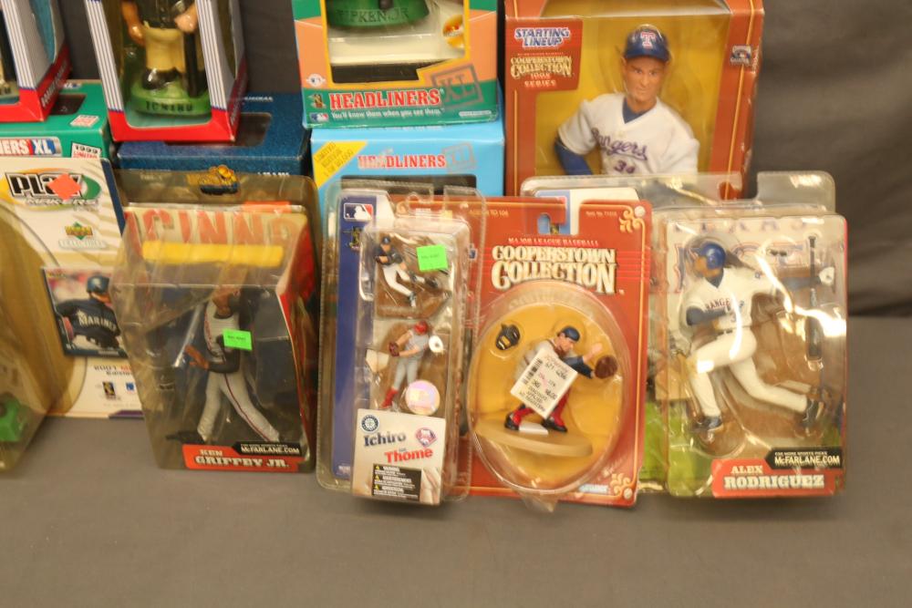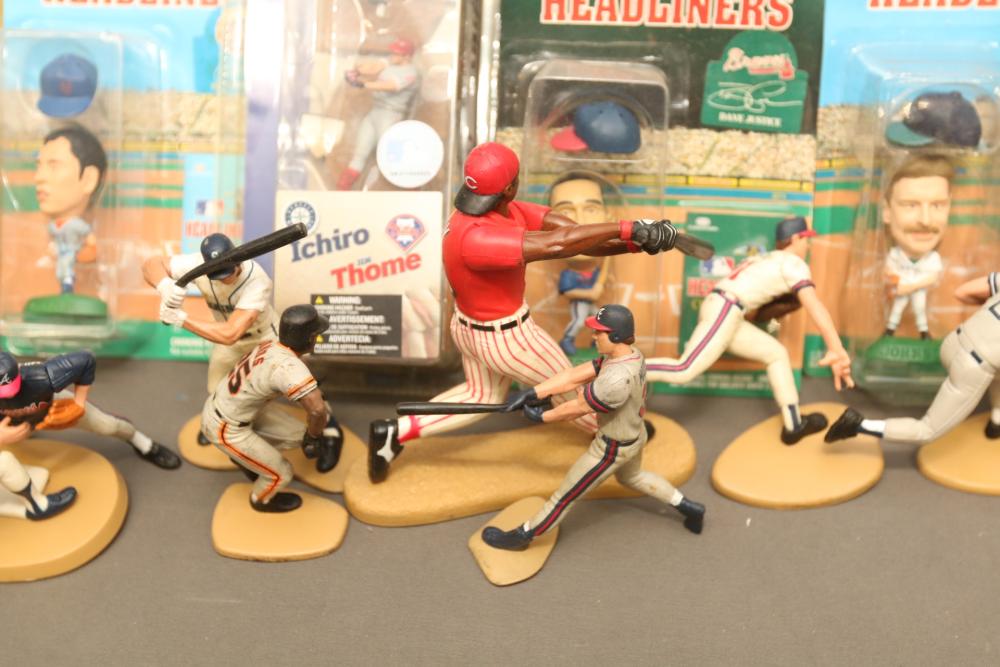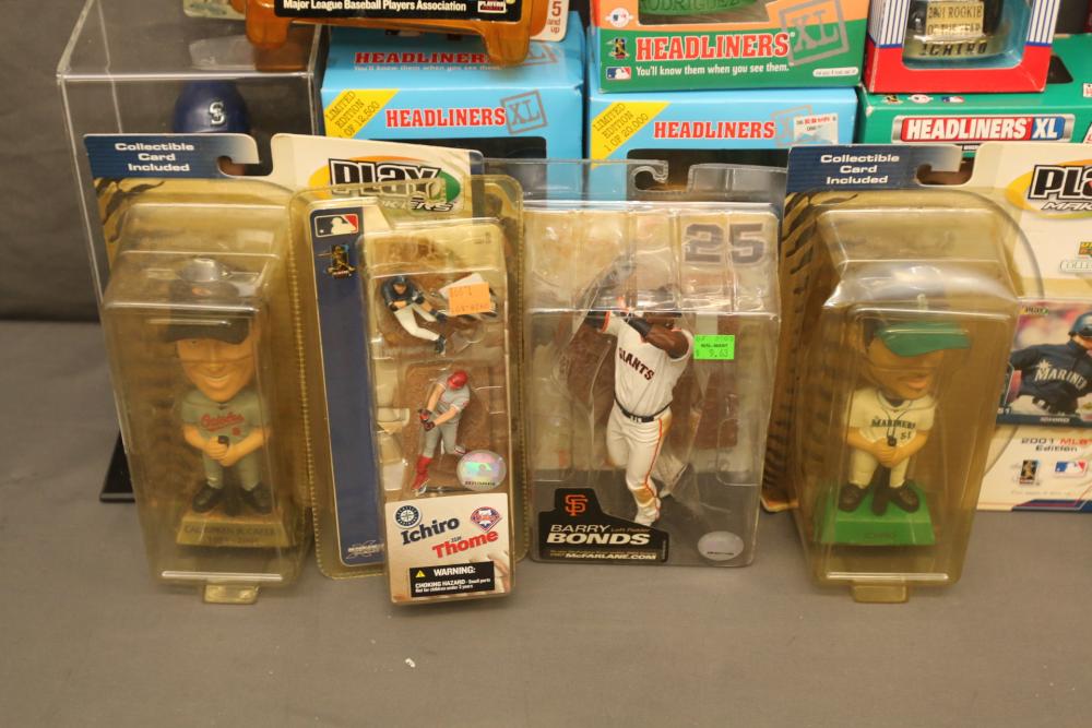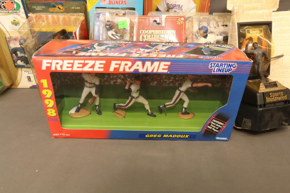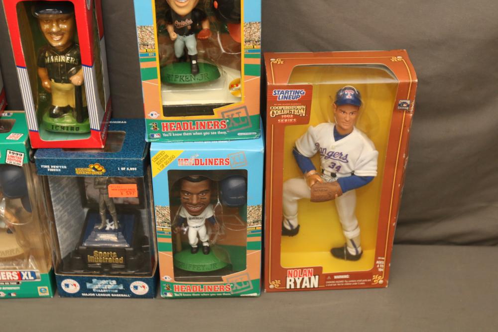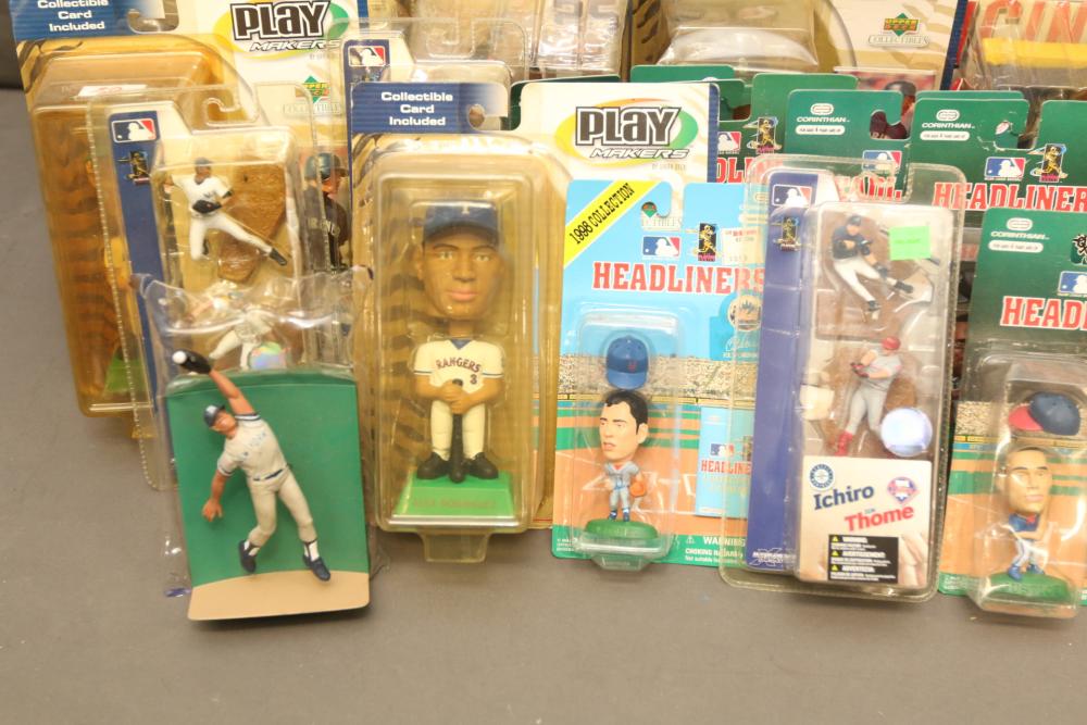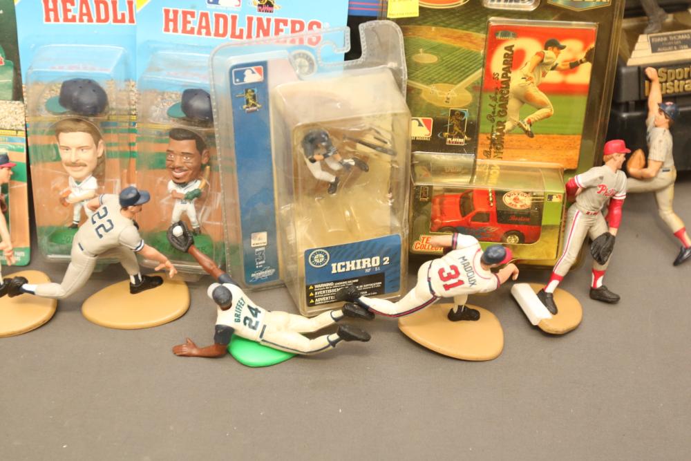 Baseball figurines including Griffey, Maddux, Ichiro, Glaus, Rangers, Jeter/Zito, Gagne/Rodriguez, Upper Deck Play Makers, Freeze Frame Greg Maddux, Barry Bonds, Ken Griffey Jr, Alex Rodriguez, Jones, Nolan Ryan, etc. Pickup only.