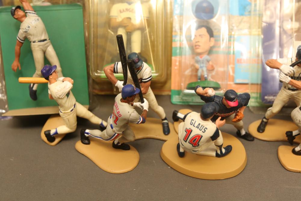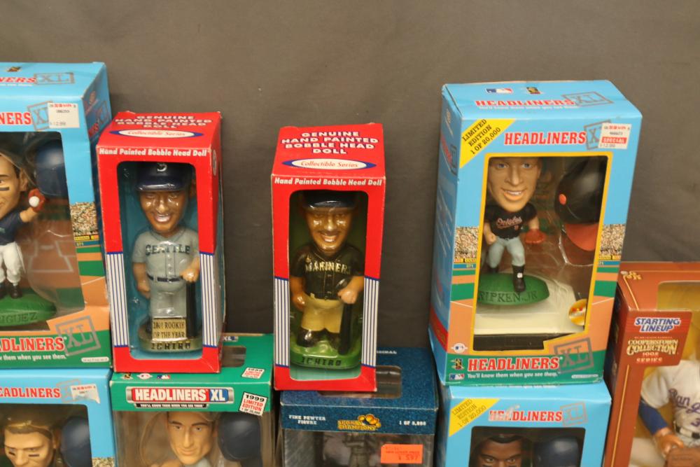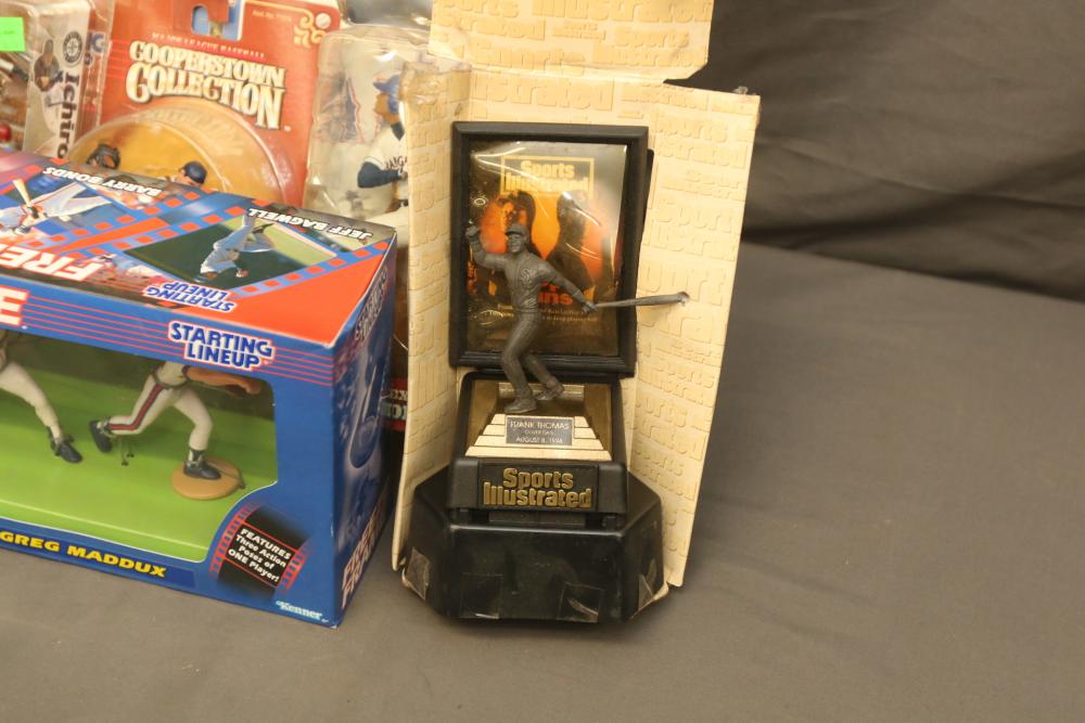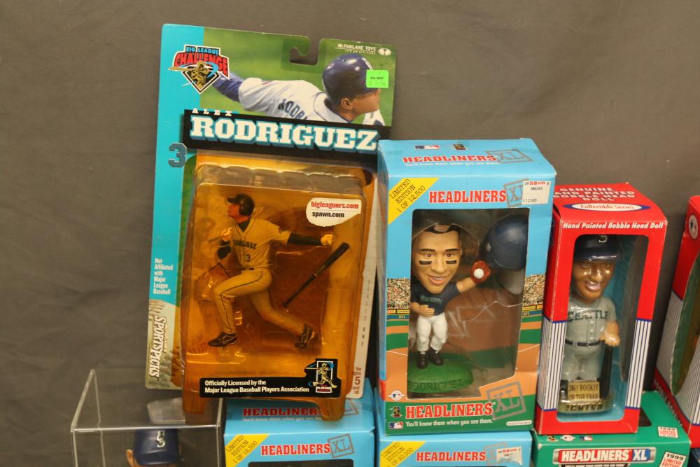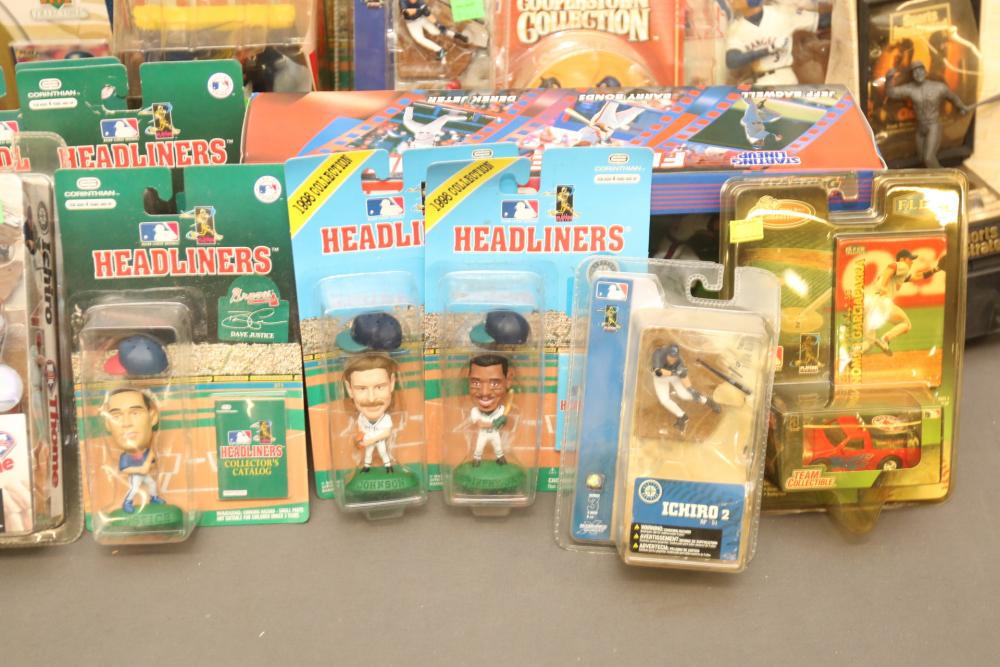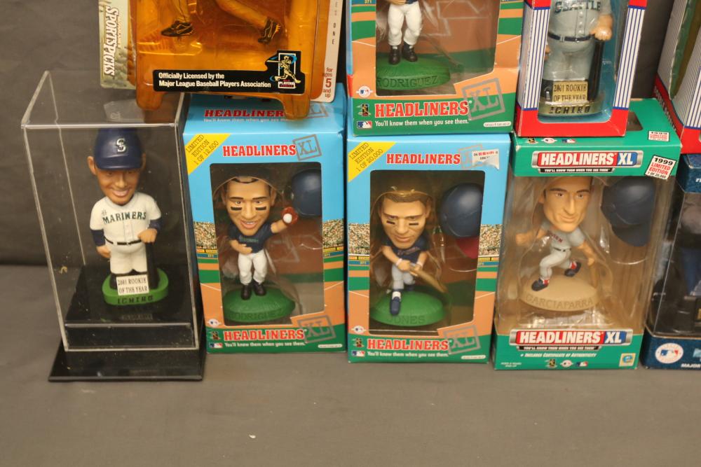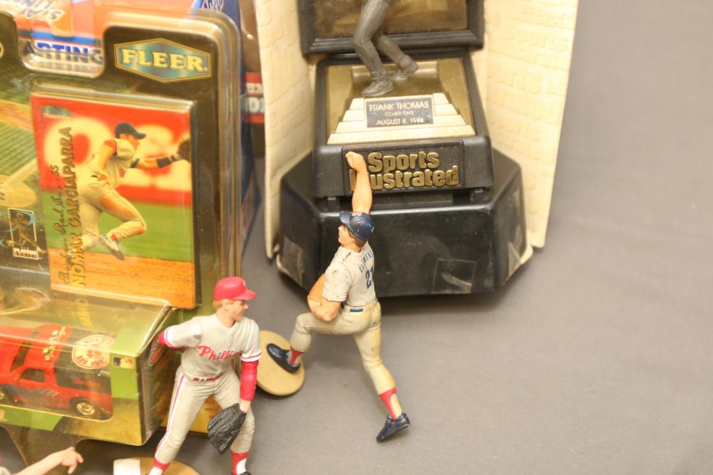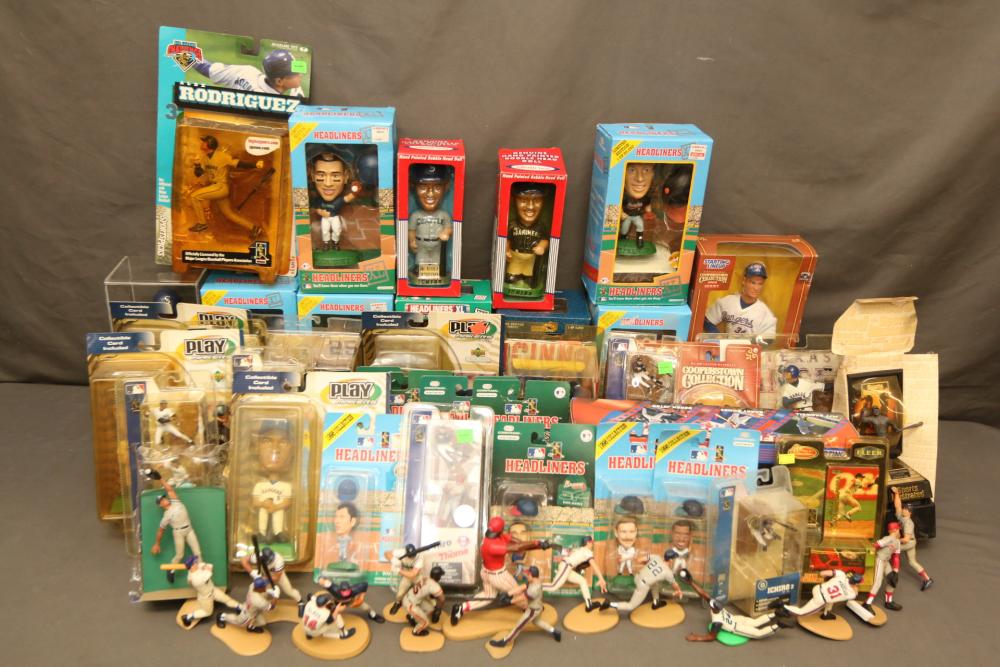 Baseball figurines including Griffey, Maddux, Ichiro, Glaus, Rangers, Jeter/Zito, Gagne/Rodriguez, Upper Deck Play Makers, Freeze Frame Greg Maddux, Barry Bonds, Ken Griffey Jr, Alex Rodriguez, Jones, Nolan Ryan, etc. Pickup only.