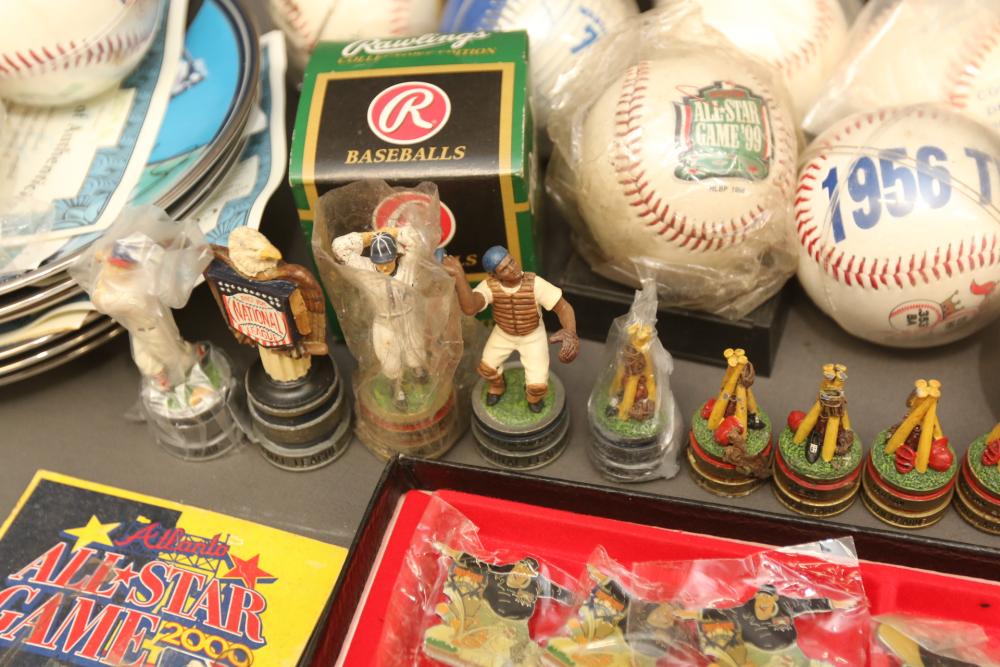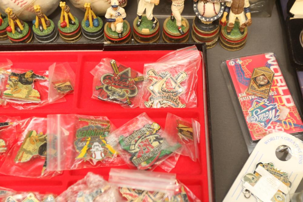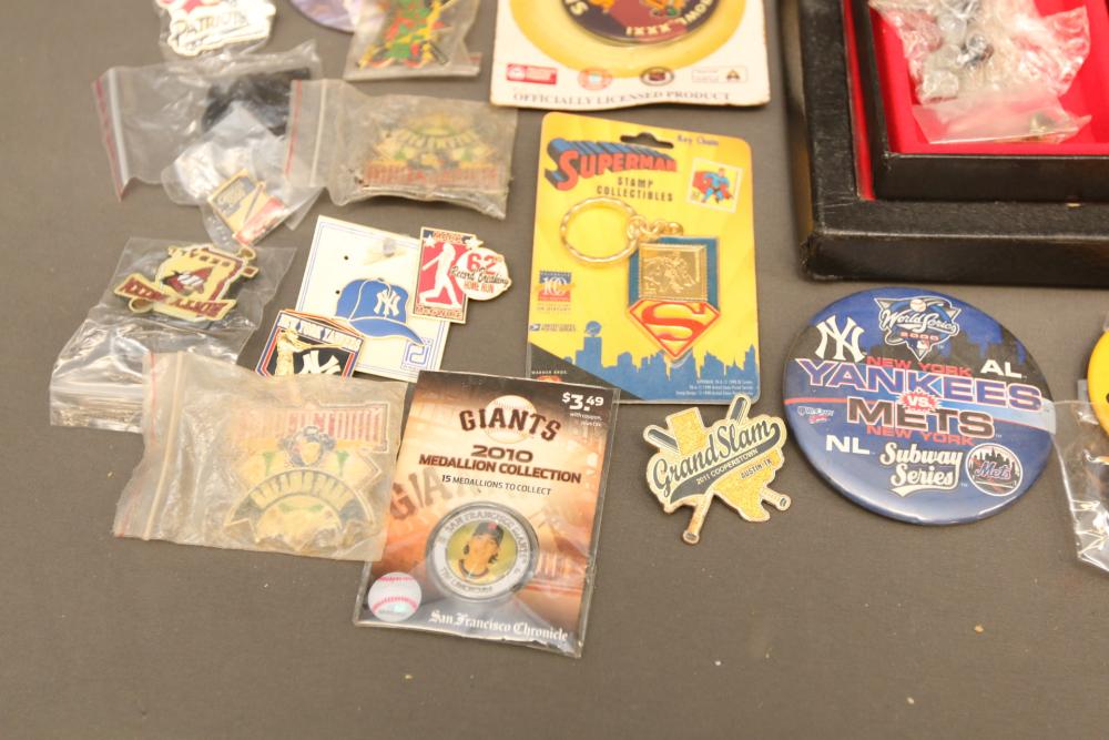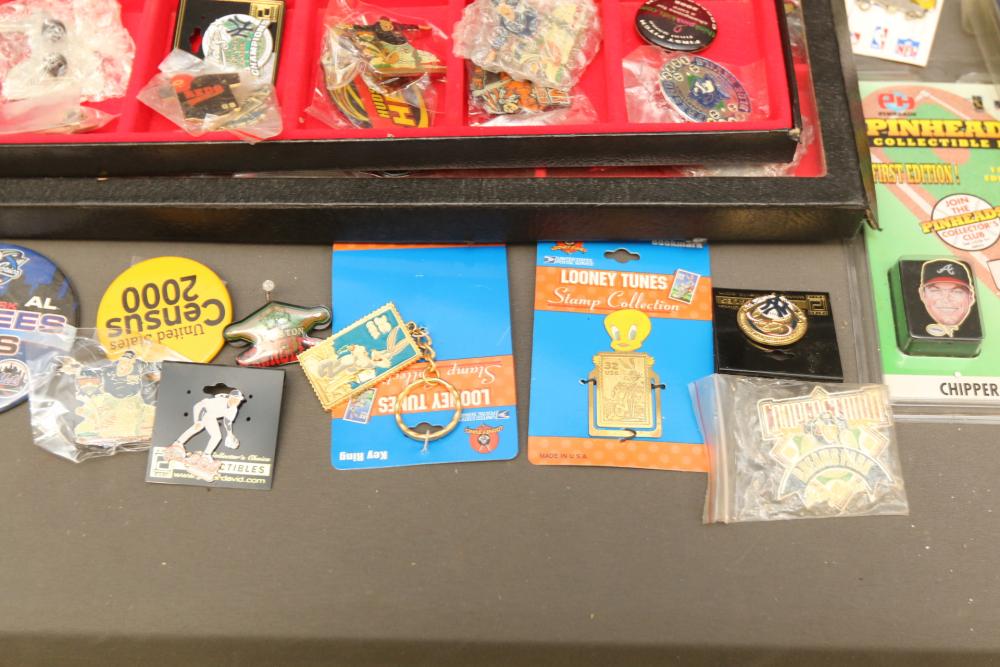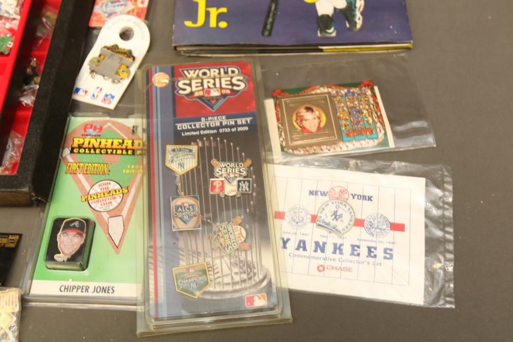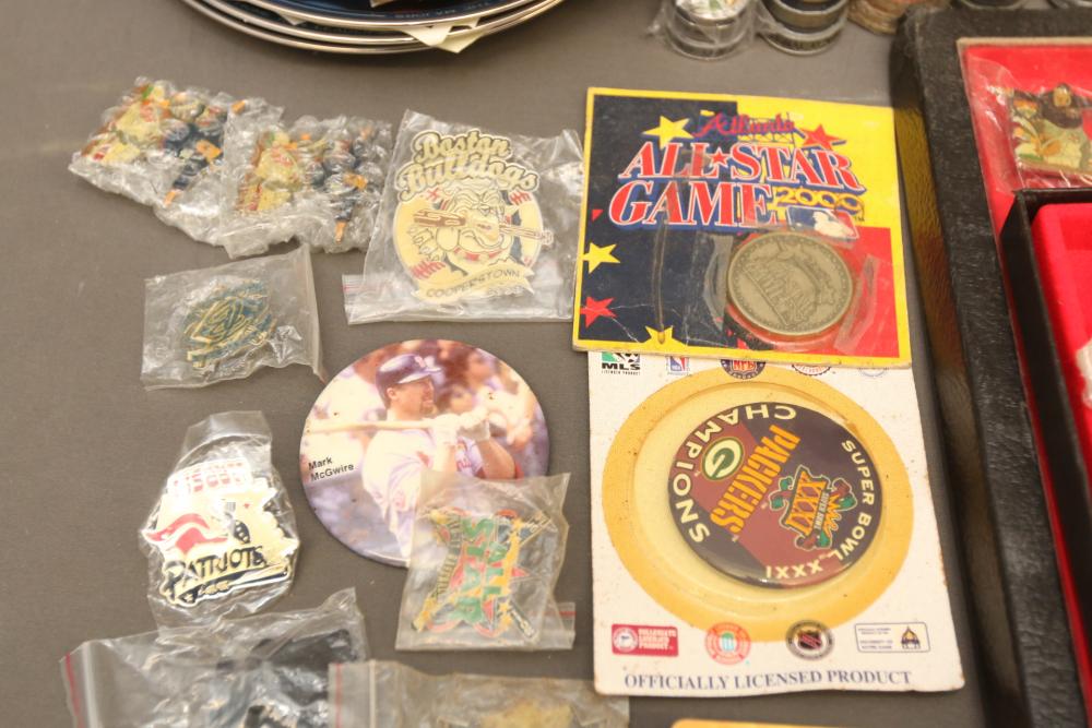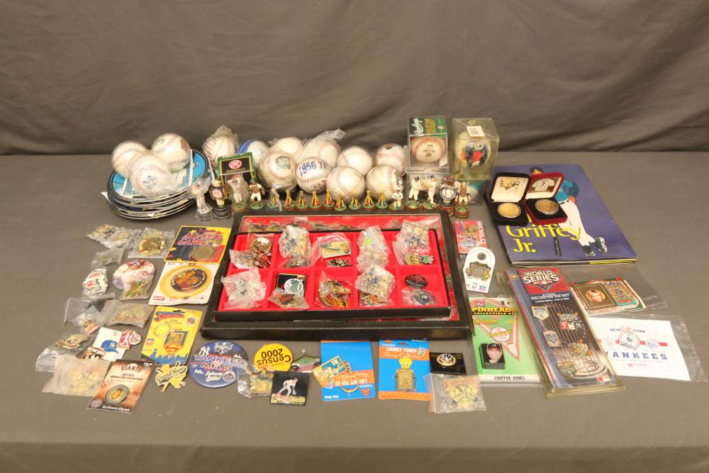 Sports memorabilia including baseball and football, branded advertising baseballs, small collectable figural pieces token coins, Ken Griffey Jr. collector plates, pins including Red Sox, Patriots, Diamondbacks, Thunder, World Series, Fresno Blue Devils, Giants, New York Yankees, Chipper Jones Pinhead, World Series 5 piece collector pin set, also including Looney Tunes pins, United States Census 2000, etc. Pickup only.
