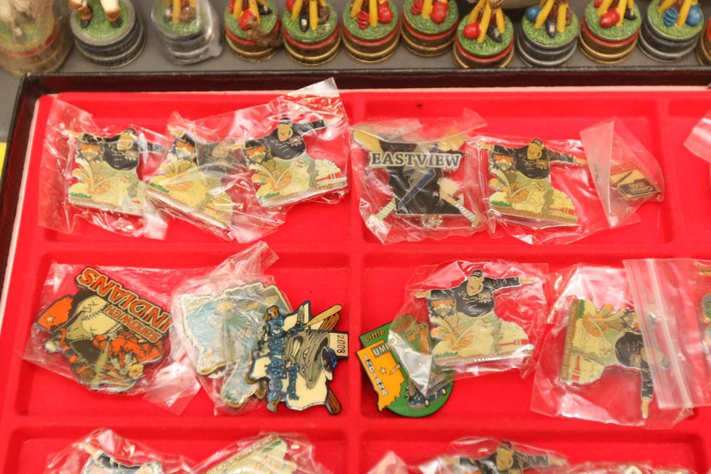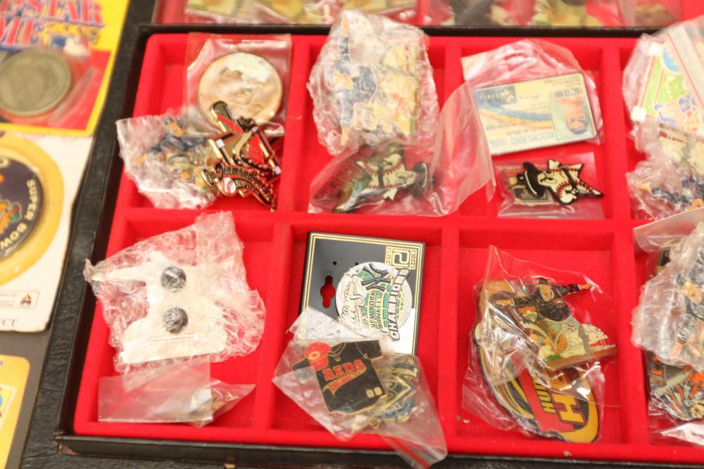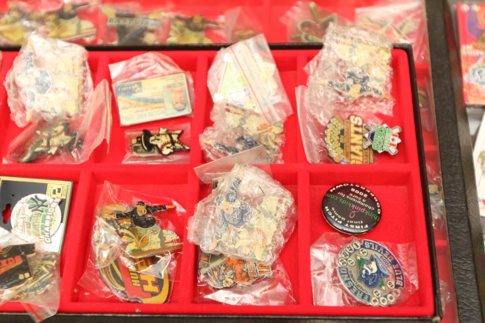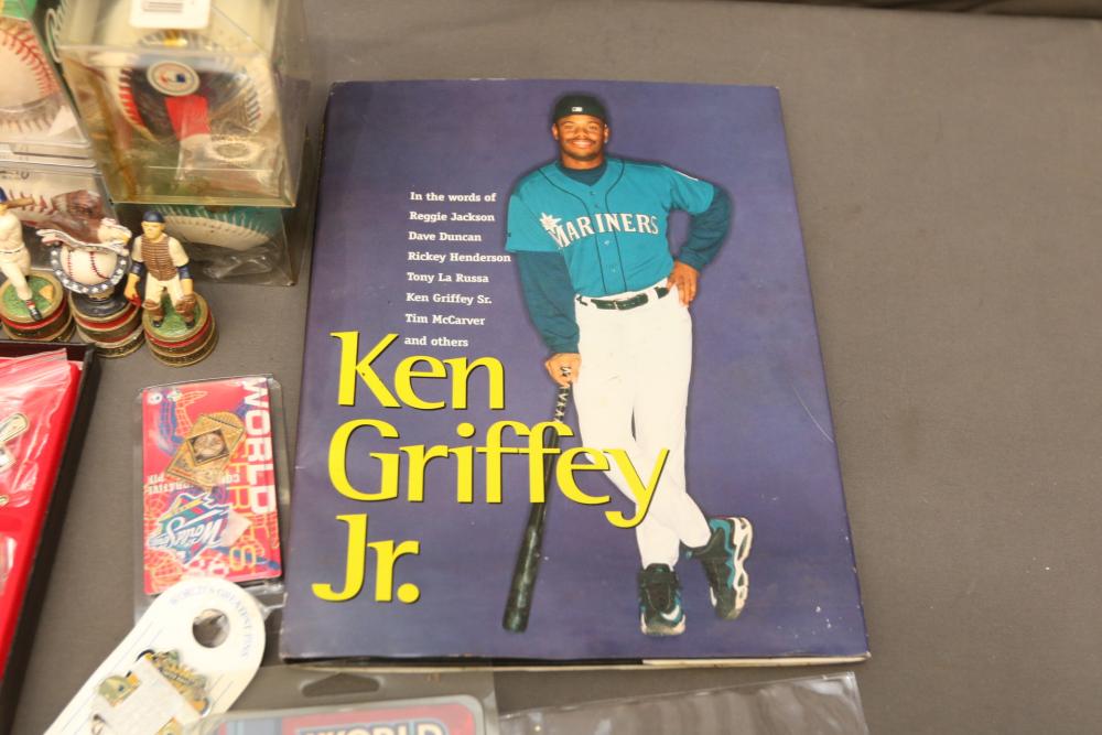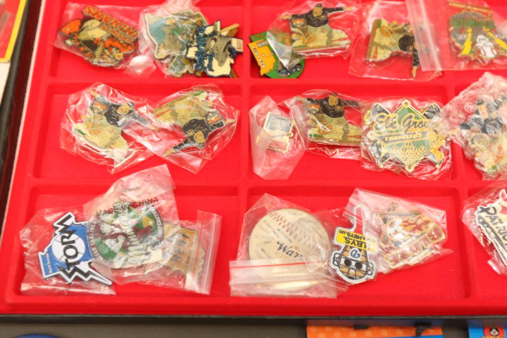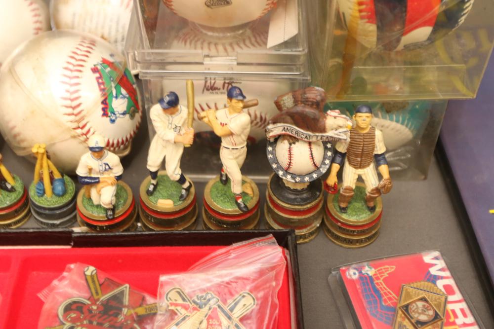 Sports memorabilia including baseball and football, branded advertising baseballs, small collectable figural pieces token coins, Ken Griffey Jr. collector plates, pins including Red Sox, Patriots, Diamondbacks, Thunder, World Series, Fresno Blue Devils, Giants, New York Yankees, Chipper Jones Pinhead, World Series 5 piece collector pin set, also including Looney Tunes pins, United States Census 2000, etc. Pickup only.
