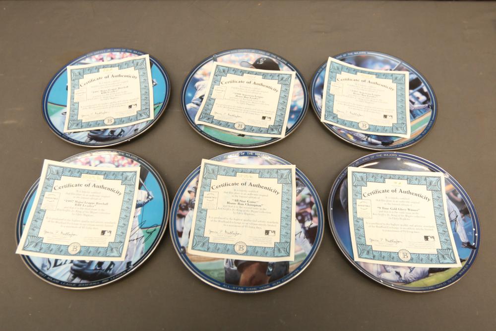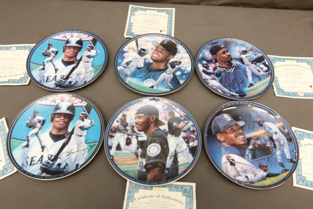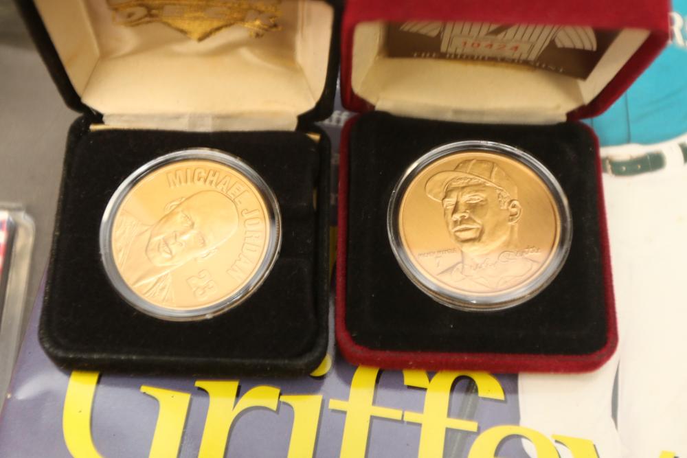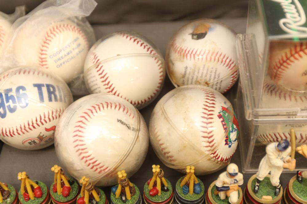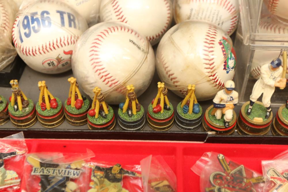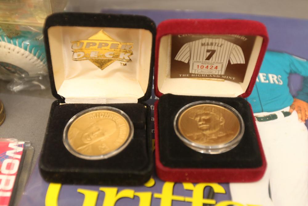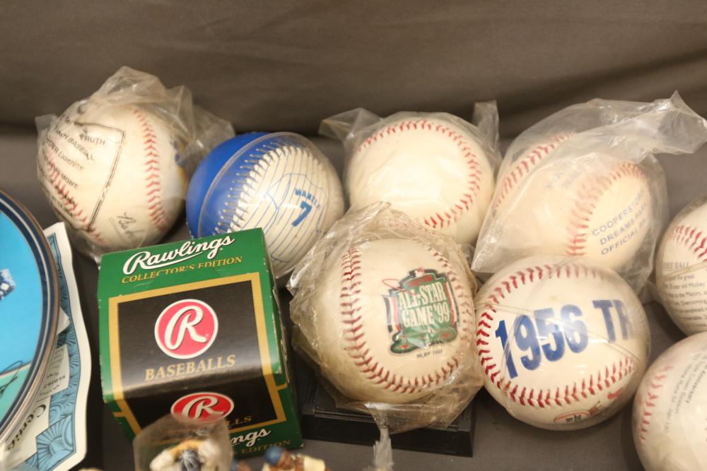 Sports memorabilia including baseball and football, branded advertising baseballs, small collectable figural pieces token coins, Ken Griffey Jr. collector plates, pins including Red Sox, Patriots, Diamondbacks, Thunder, World Series, Fresno Blue Devils, Giants, New York Yankees, Chipper Jones Pinhead, World Series 5 piece collector pin set, also including Looney Tunes pins, United States Census 2000, etc. Pickup only.