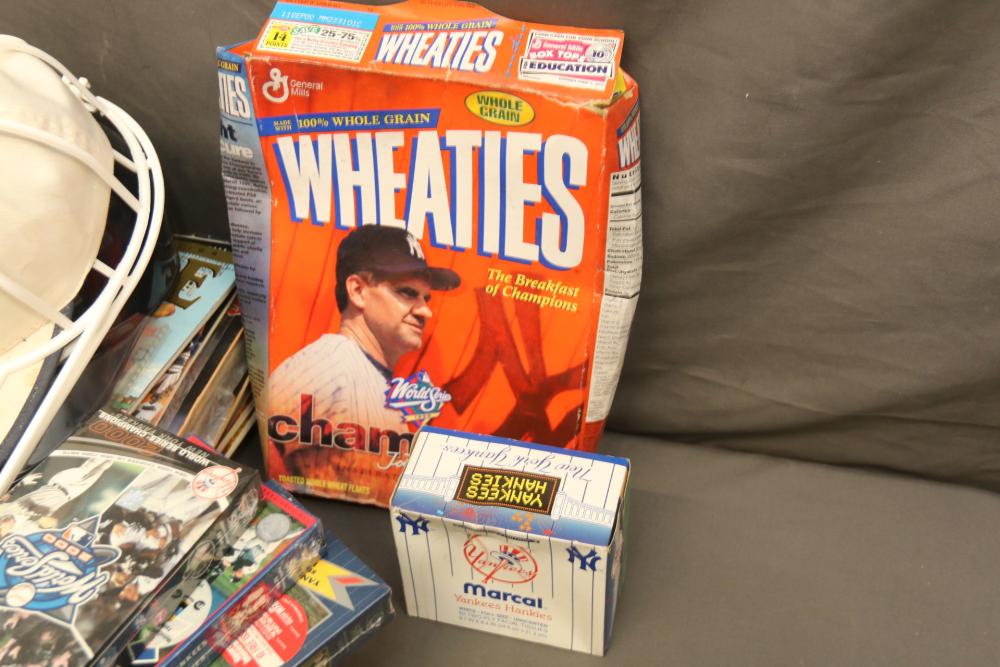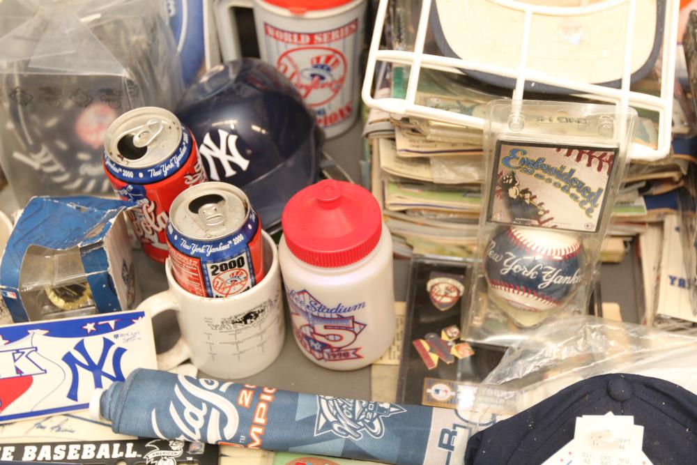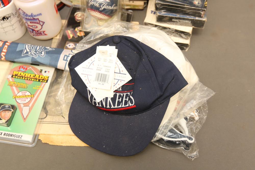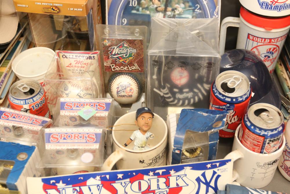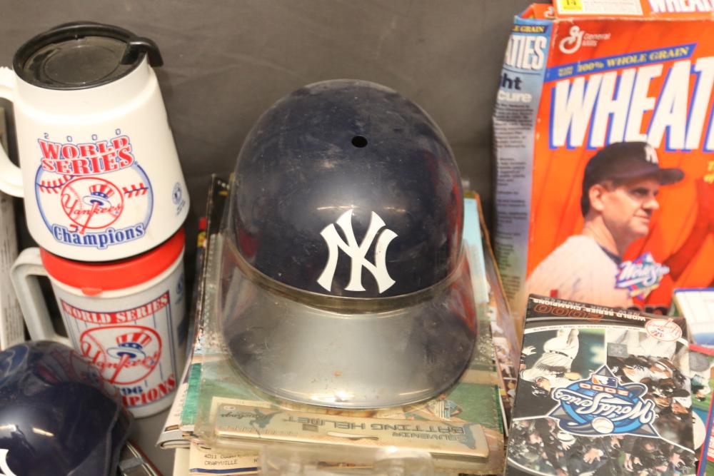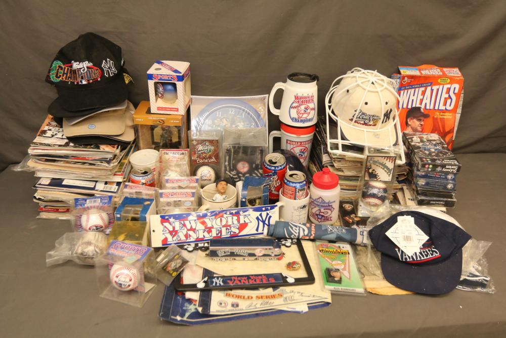New York Yankees memorabilia including Championship hats, baseballs, bumper sticker, license plate holder, Alex Rodriguez Pinhead pin, World Series pennant flag, Coca-Cola cans, helmet, coffee mug, VHS tapes, Wheaties box, hats, magazines, clock, etc. Pickup only.