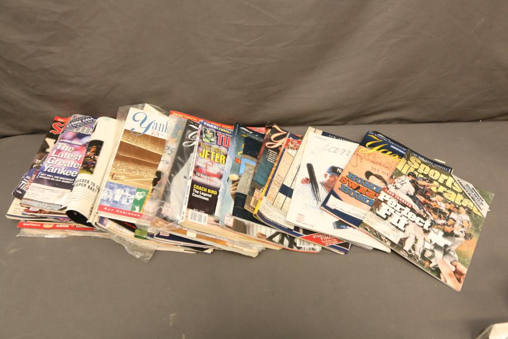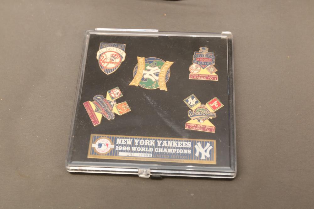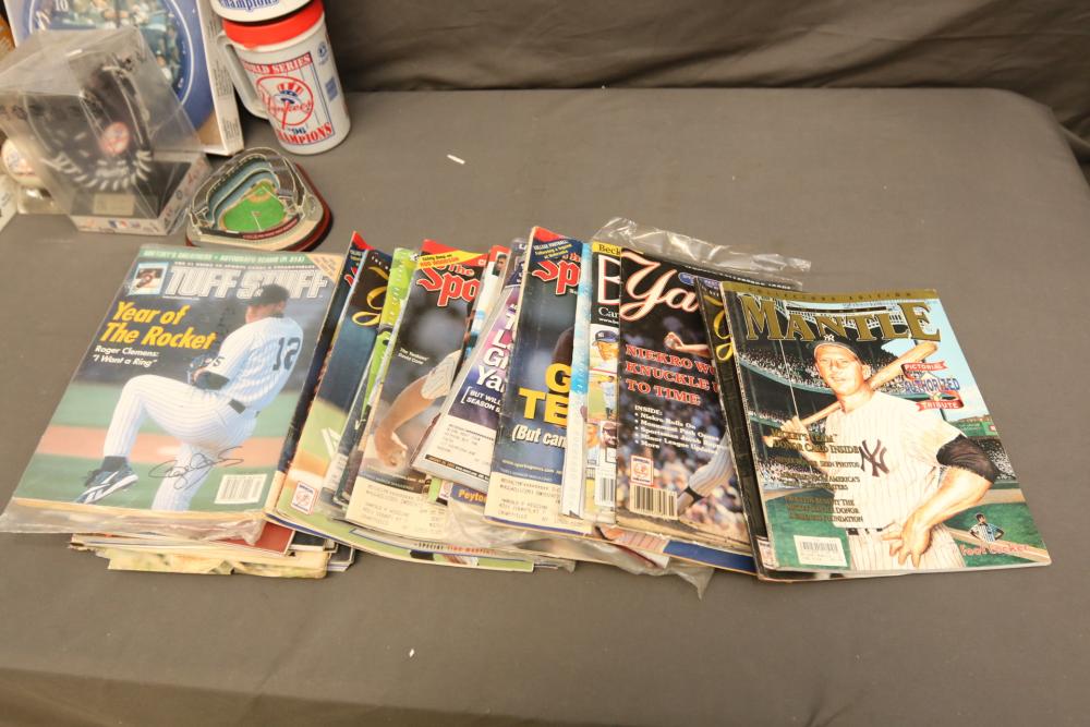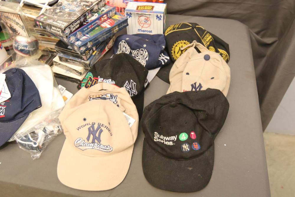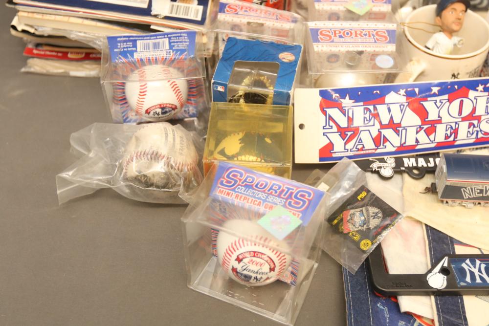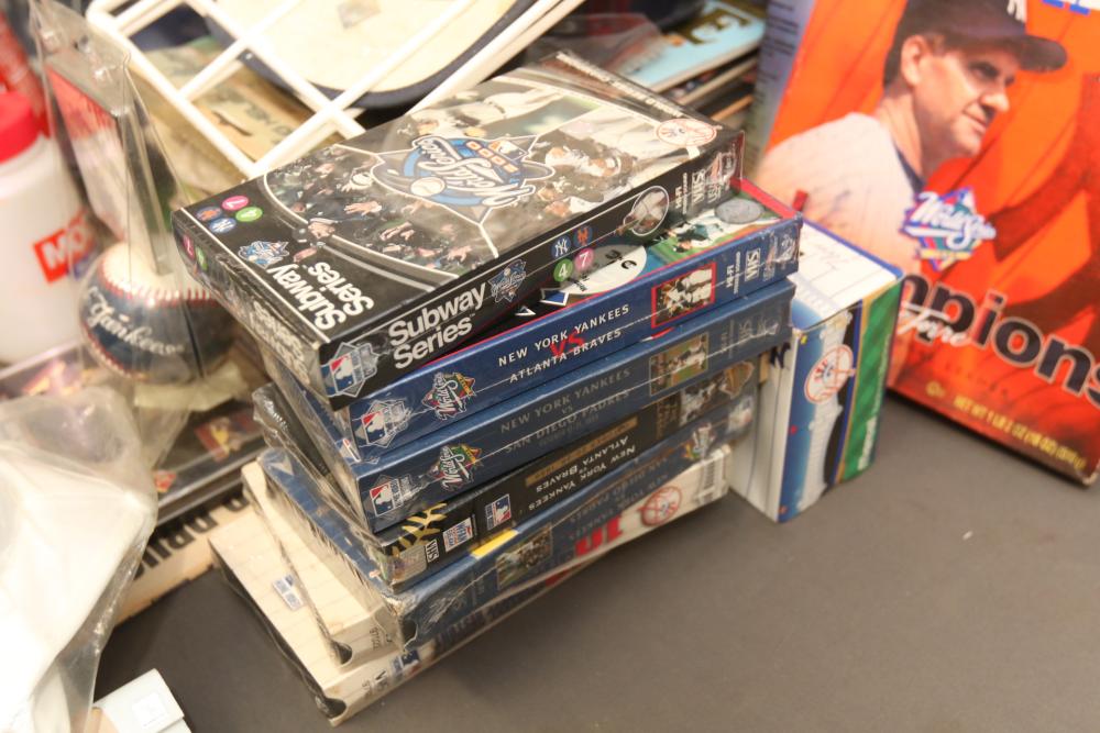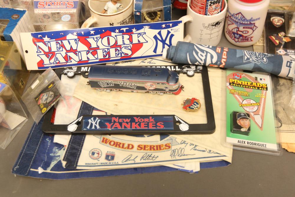 New York Yankees memorabilia including Championship hats, baseballs, bumper sticker, license plate holder, Alex Rodriguez Pinhead pin, World Series pennant flag, Coca-Cola cans, helmet, coffee mug, VHS tapes, Wheaties box, hats, magazines, clock, etc. Pickup only.