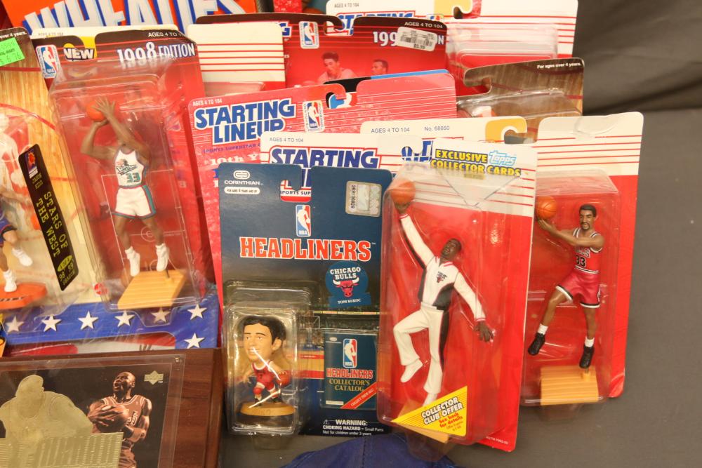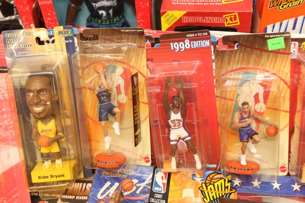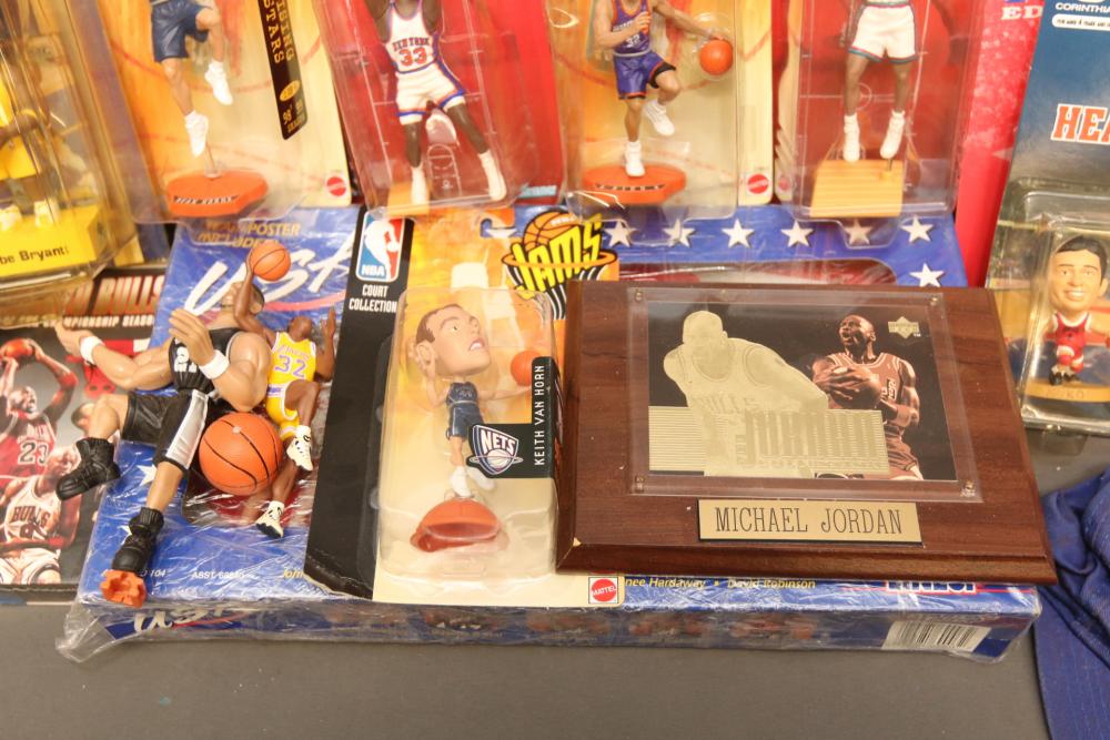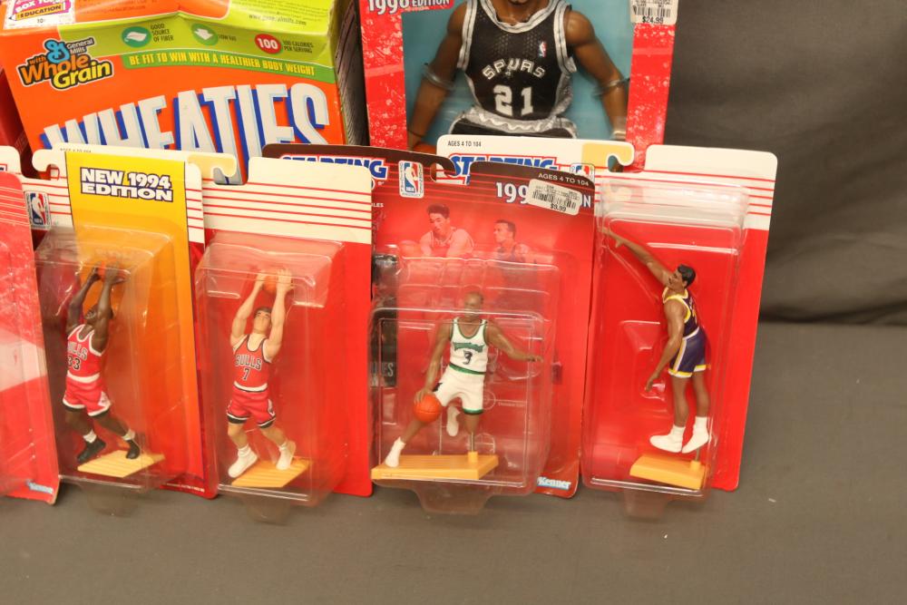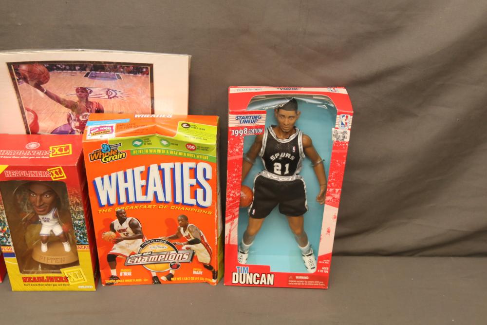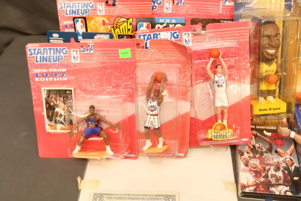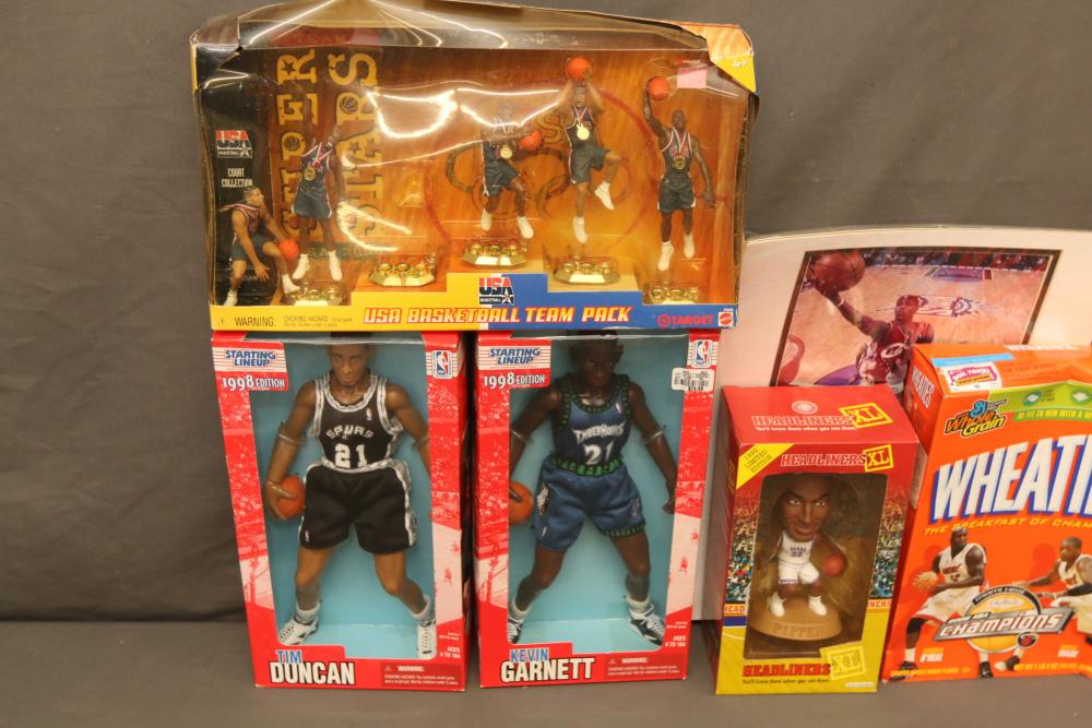 Basketball figurines including beanie baby, Starting Lineup 1997 edition, Michael Jordan plaque, Kobe Bryant bobblehead, headliners, knicks hat, Dennis Rodman, Starting Lineup USA 1996 edition set one of two, NBA super stars, Tim Duncan, Kevin Garnett, Wheaties box, Lebron James decorative envelope and picture, etc. Pickup only.