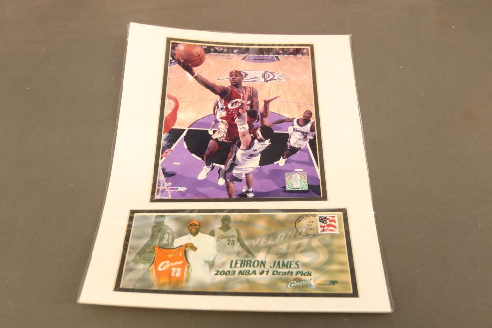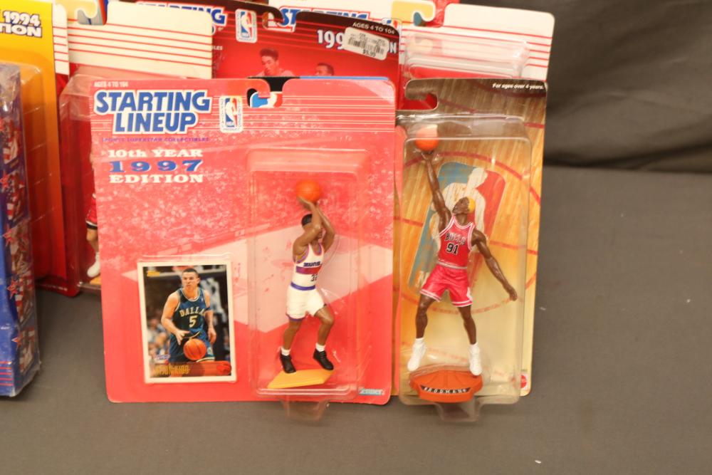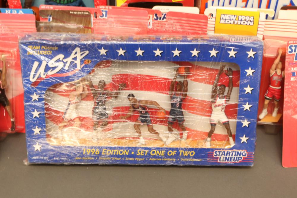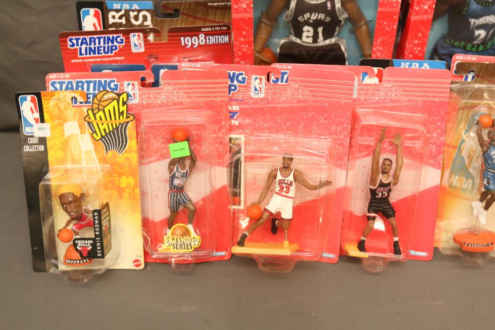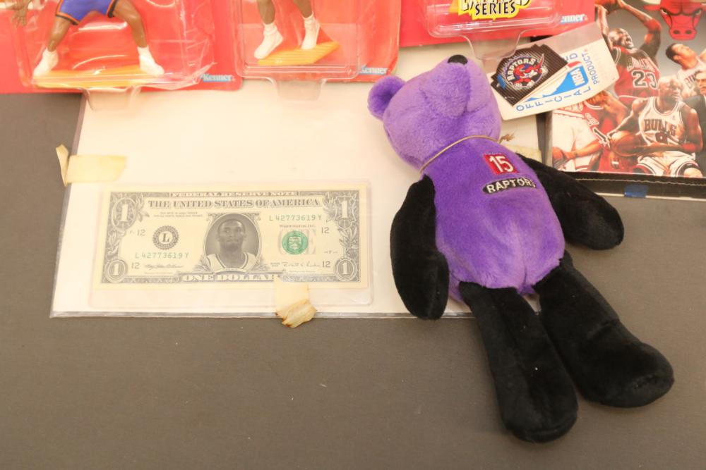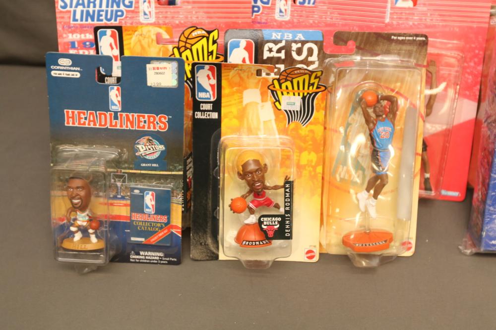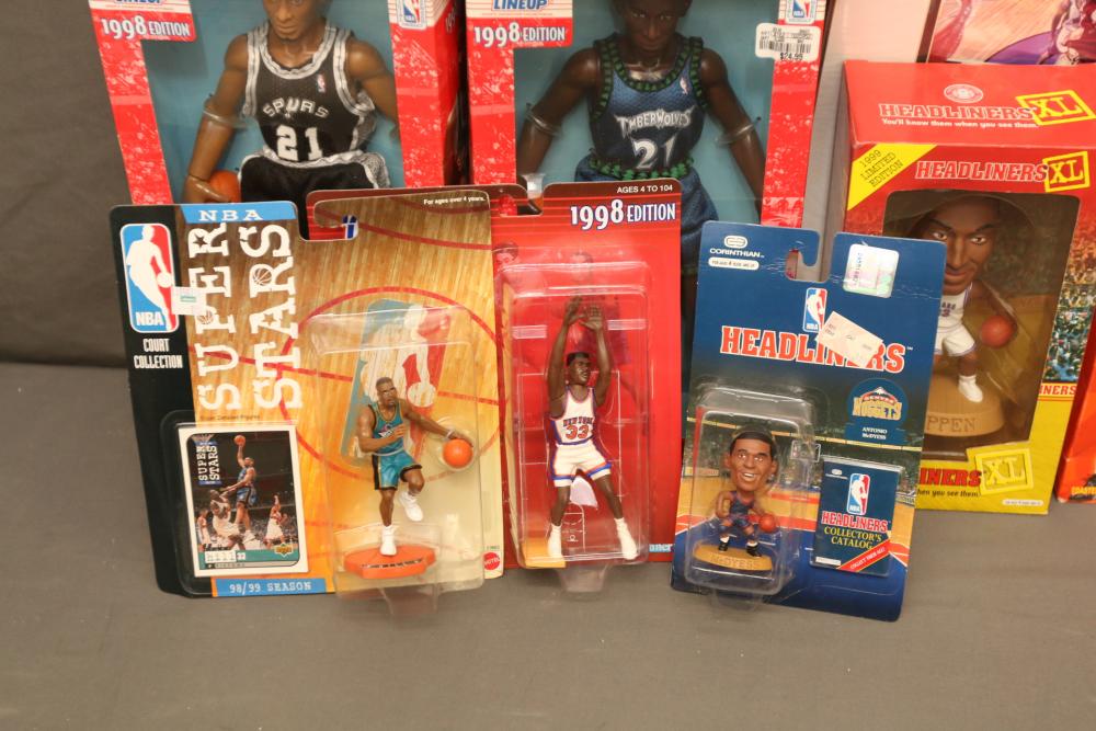Basketball figurines including beanie baby, Starting Lineup 1997 edition, Michael Jordan plaque, Kobe Bryant bobblehead, headliners, knicks hat, Dennis Rodman, Starting Lineup USA 1996 edition set one of two, NBA super stars, Tim Duncan, Kevin Garnett, Wheaties box, Lebron James decorative envelope and picture, etc. Pickup only.