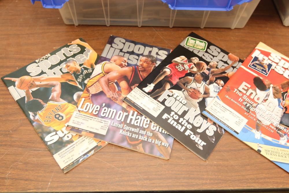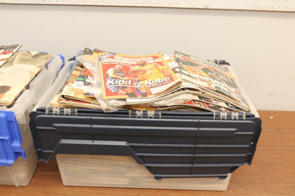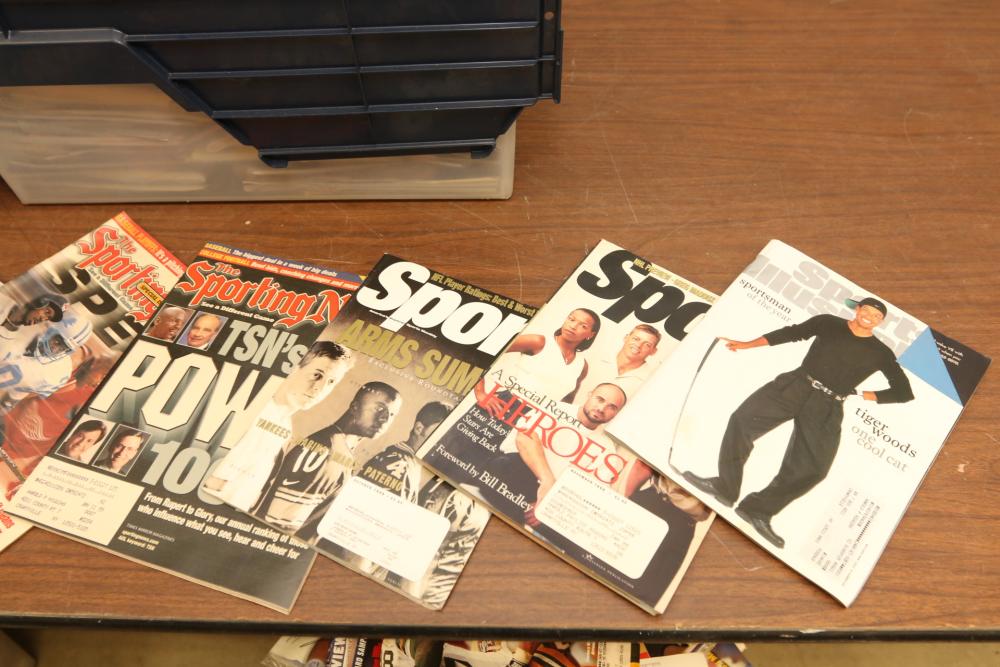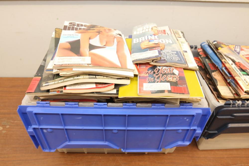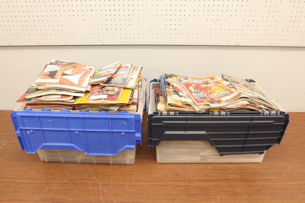 Two totes of sports magazines including Sports Illustrated, ESPN, Life, Sporting News, sports include tennis, ice skating, basketball, swimming, golf, etc. Pickup only.