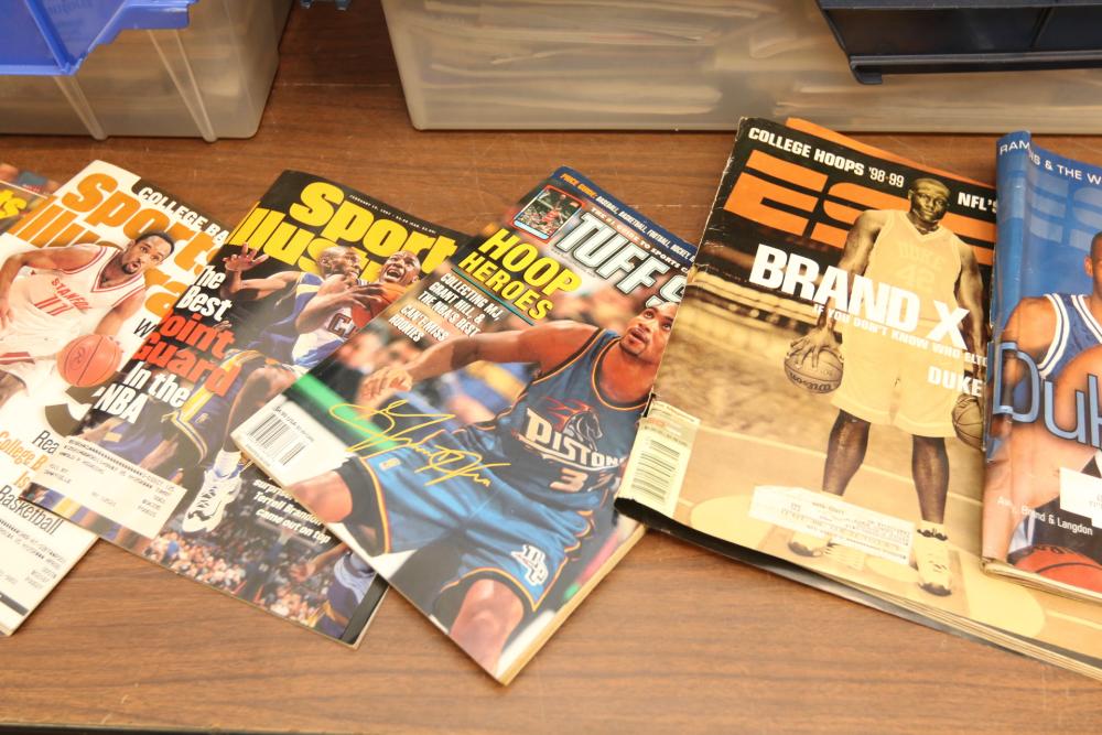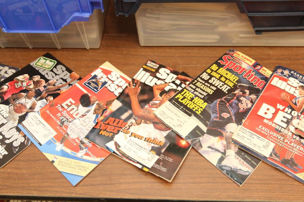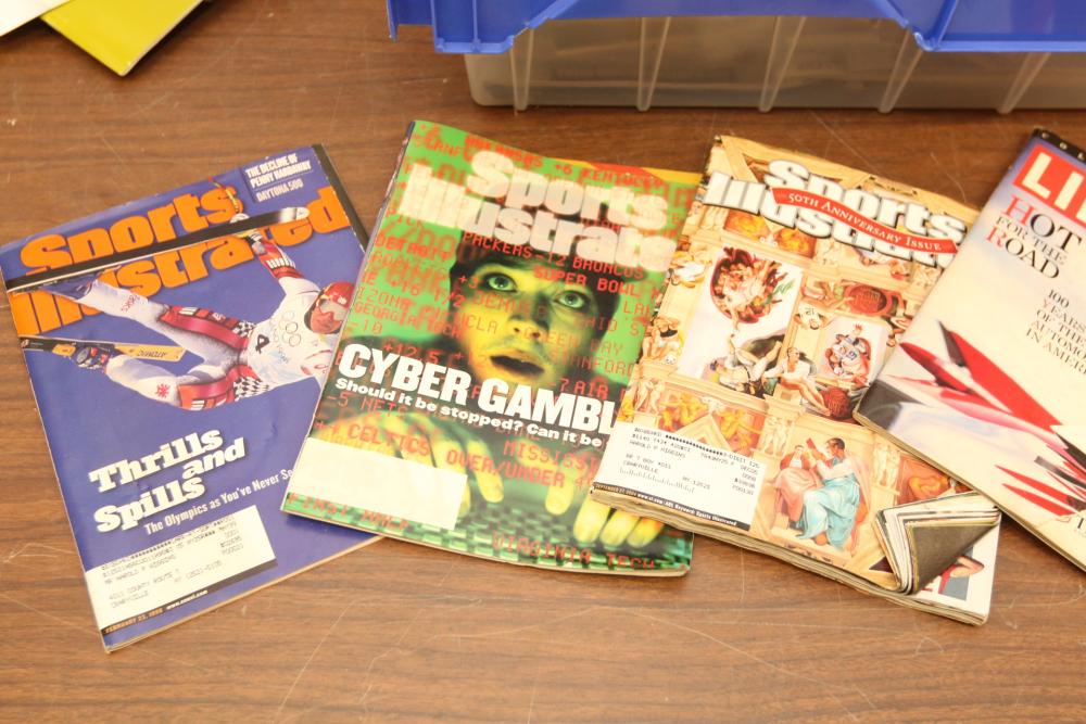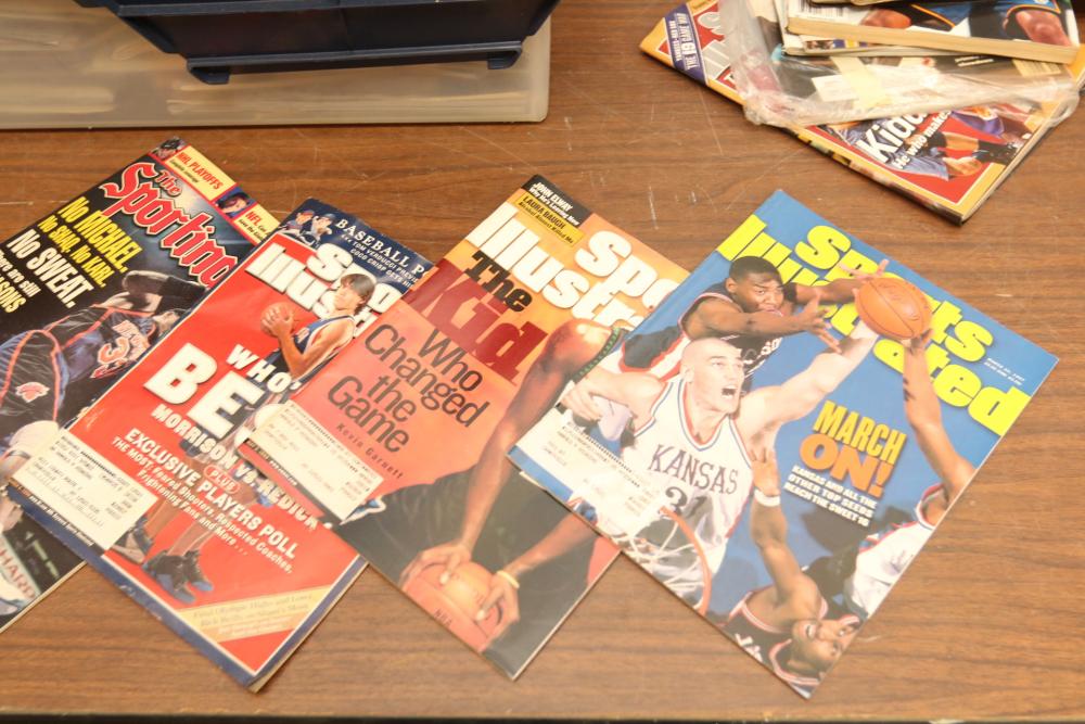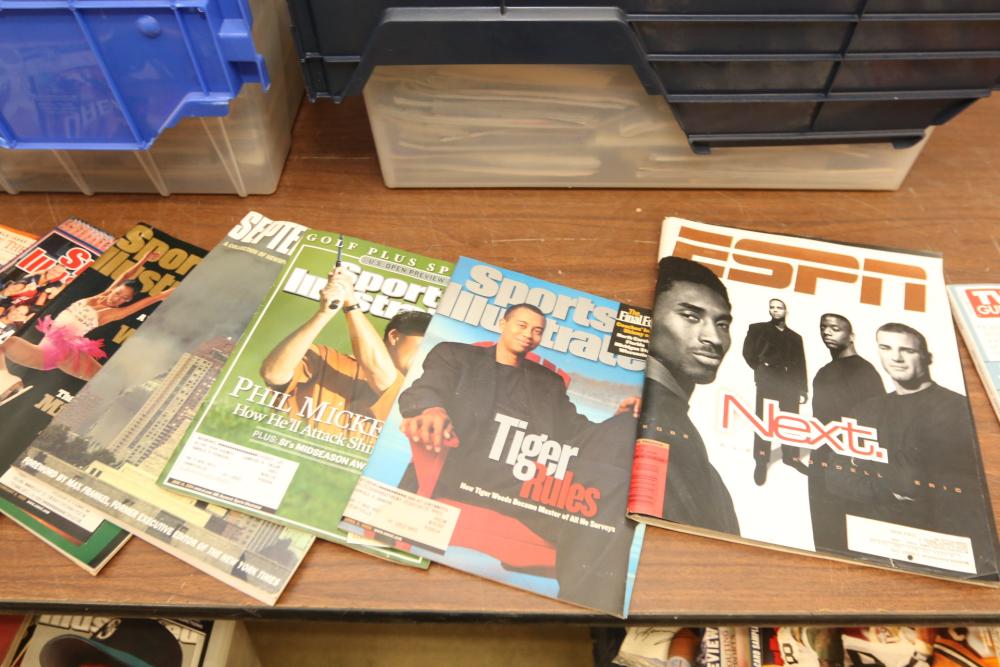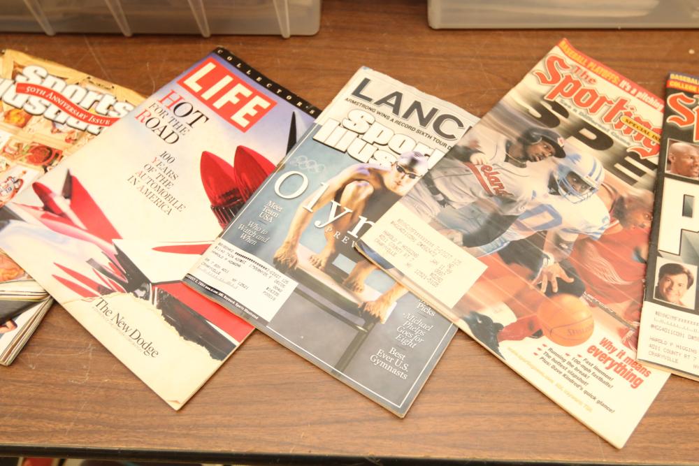 Two totes of sports magazines including Sports Illustrated, ESPN, Life, Sporting News, sports include tennis, ice skating, basketball, swimming, golf, etc. Pickup only.