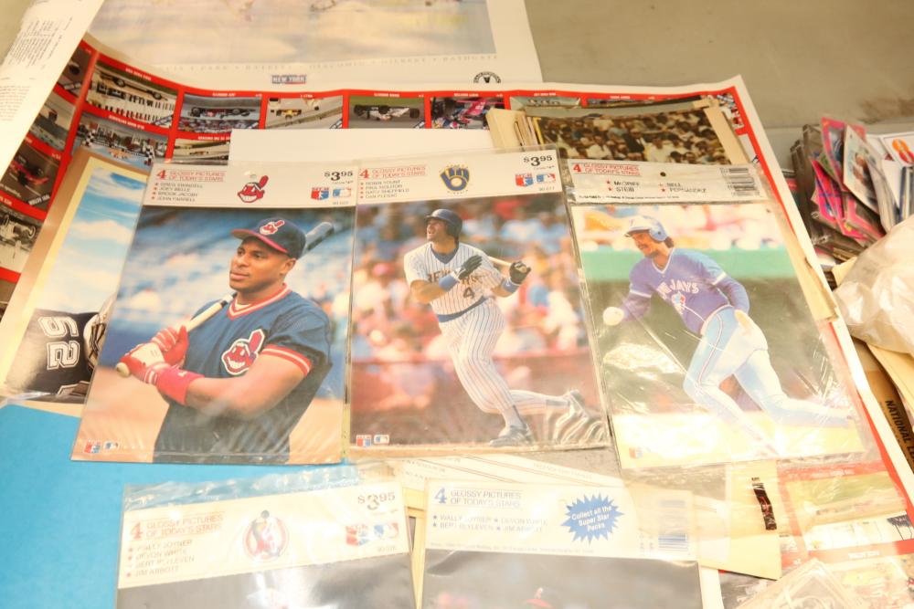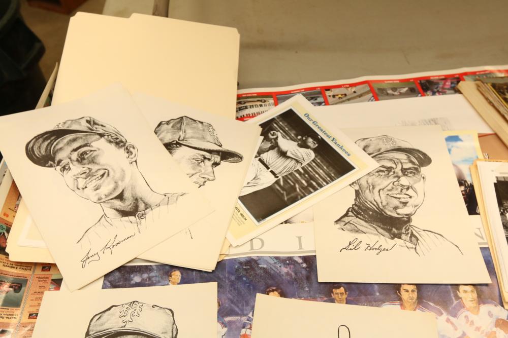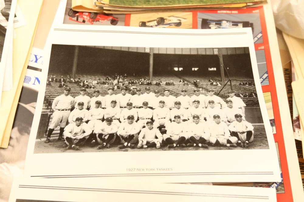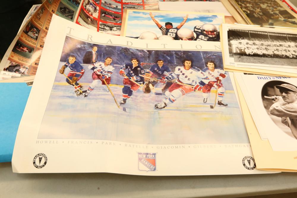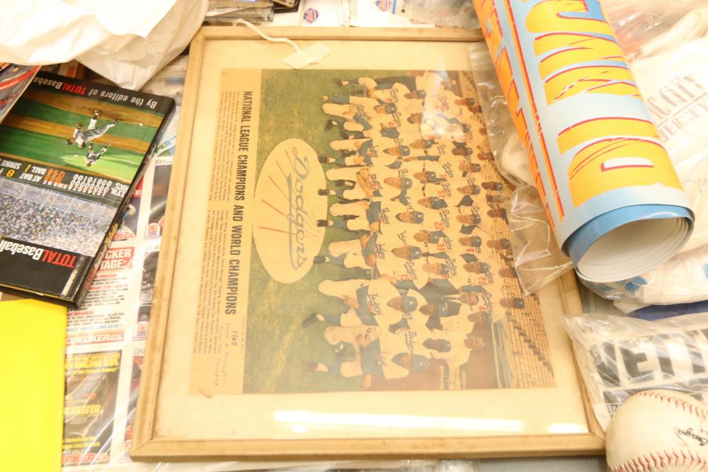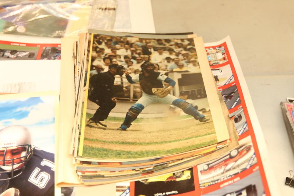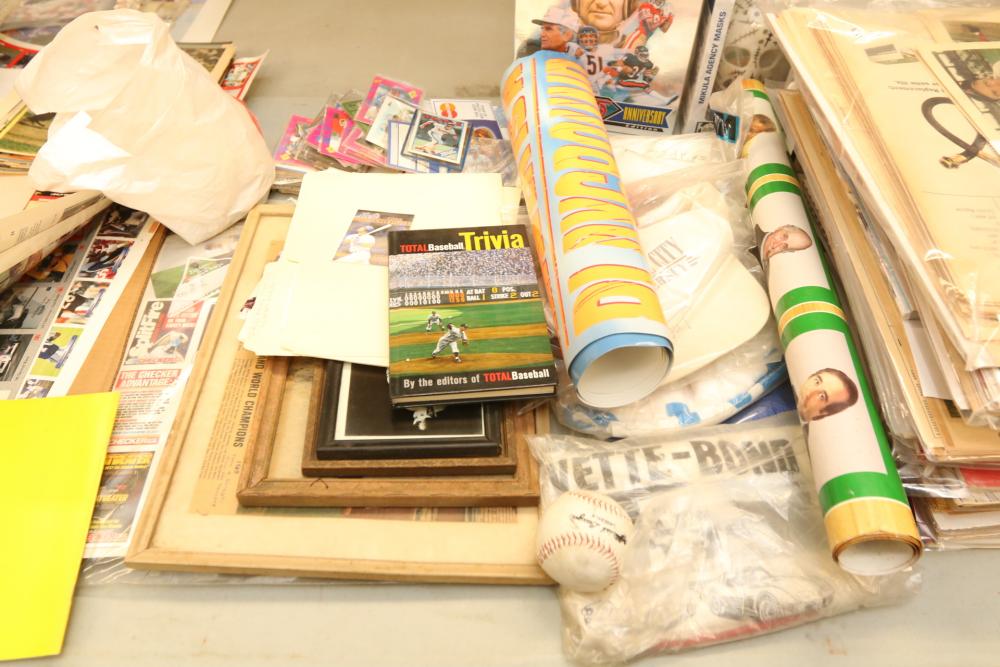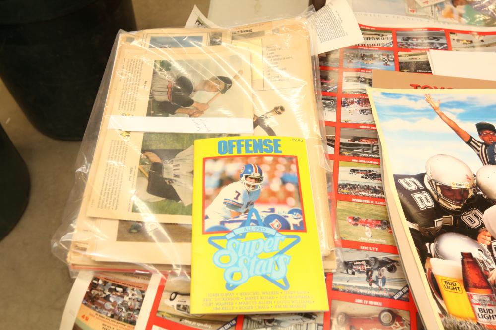 Collection of sports memorabilia including posters, newspapers, framed pictures, and cards from various sports. Pick up only.
