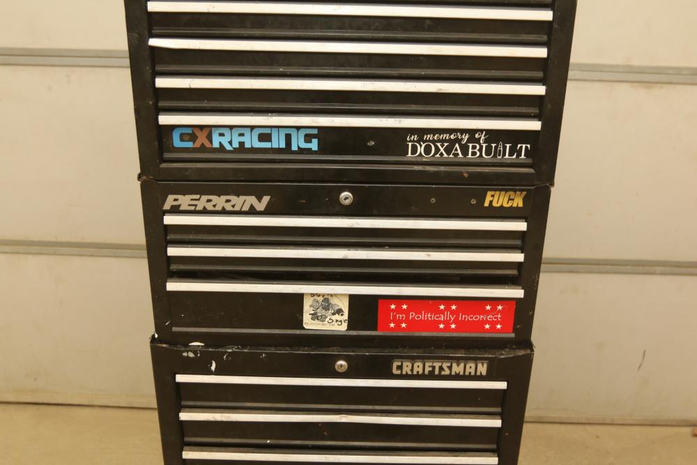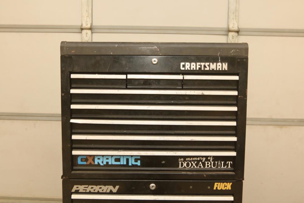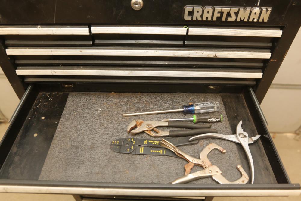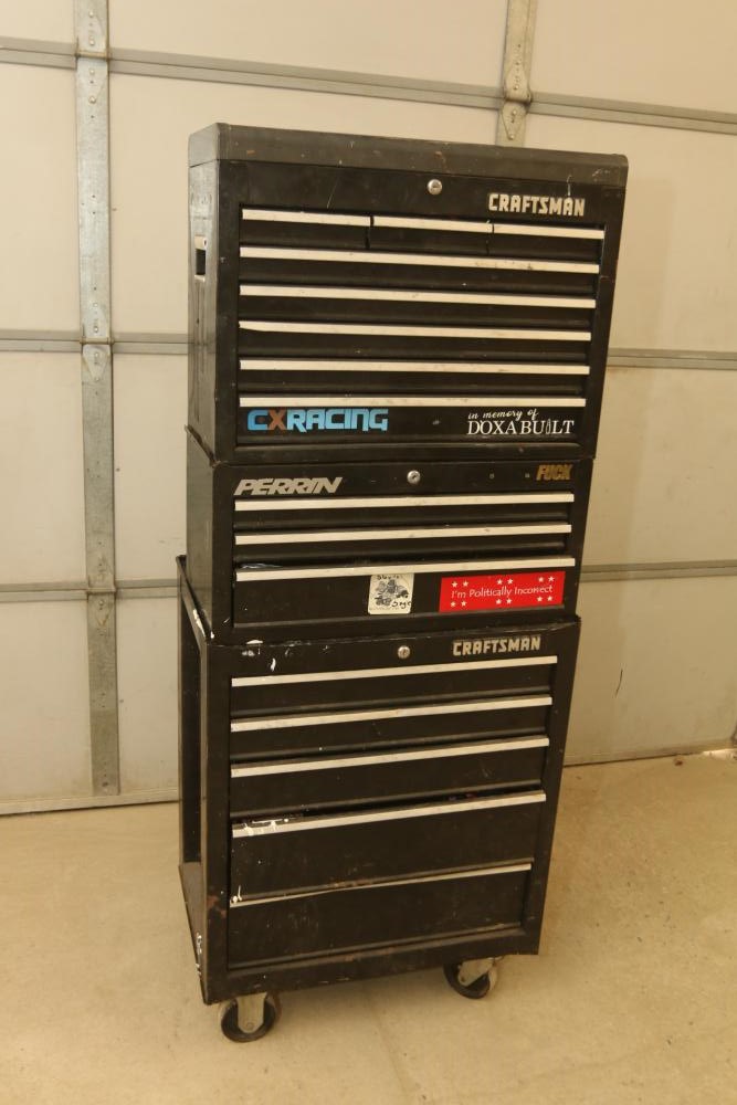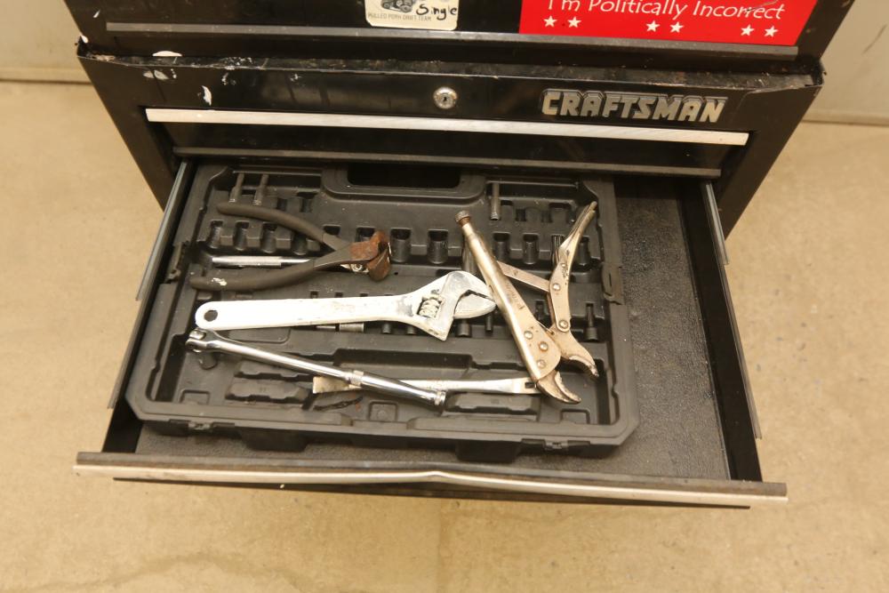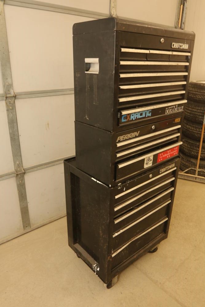 Craftsman rolling tool box with upper and lower craftsman with center piece being Perrin, upper section with eight drawers, lower section with five drawers, and perrin (middle section) with three drawers, tools incl sockets, zip ties, extensions, screw drivers, wrenches, wire cutters, pliers, fuses, socket wrenches, etc. Pickup only.