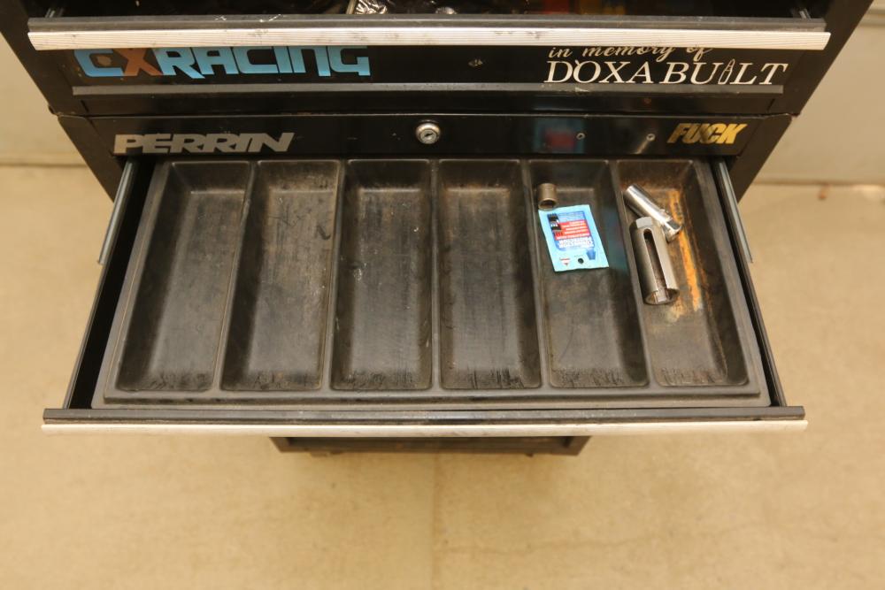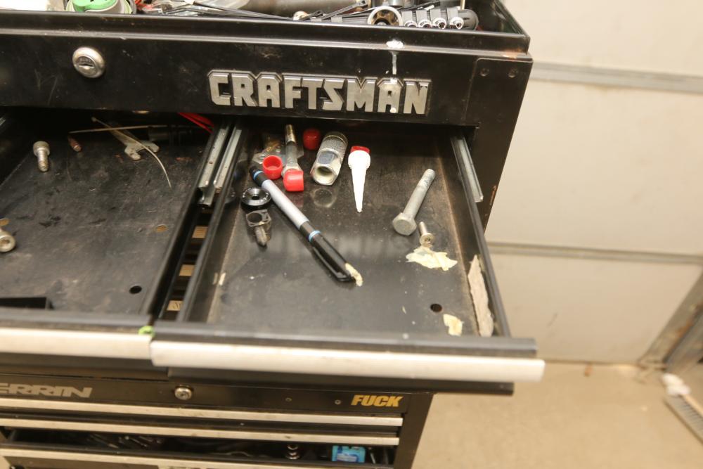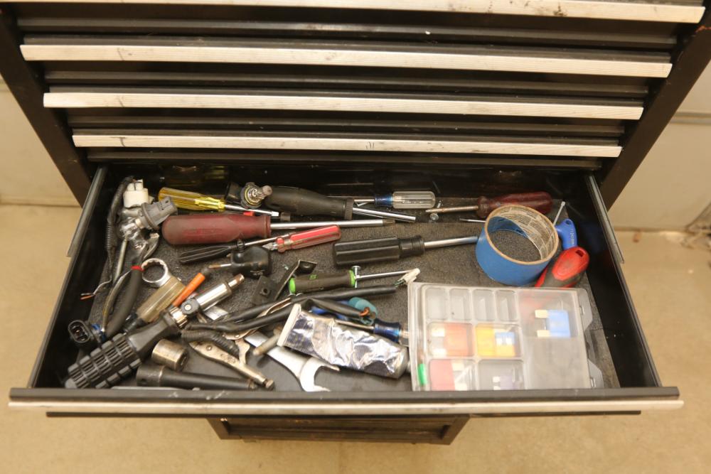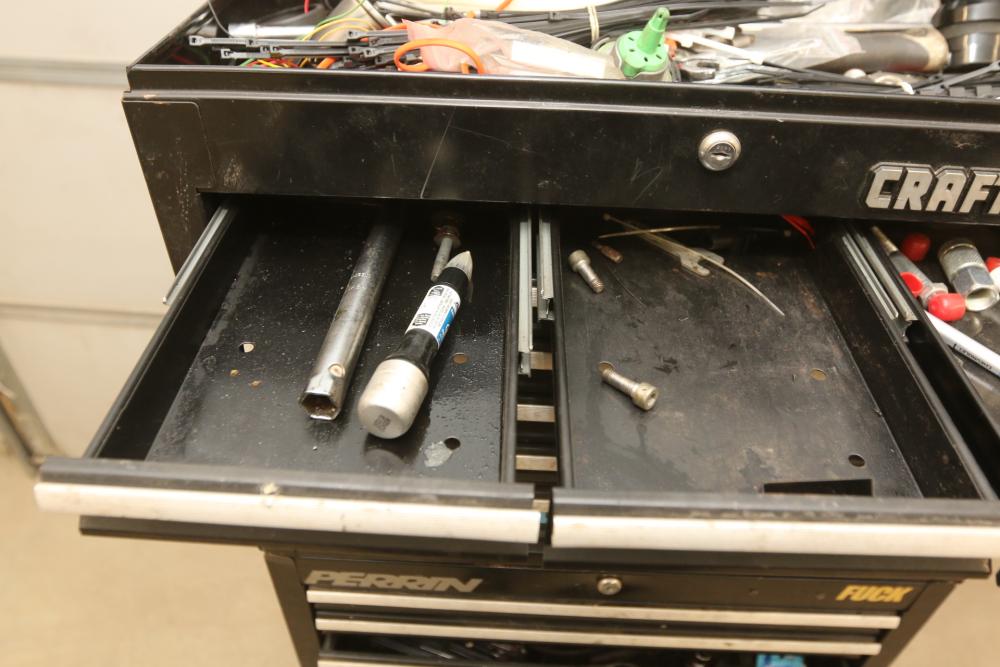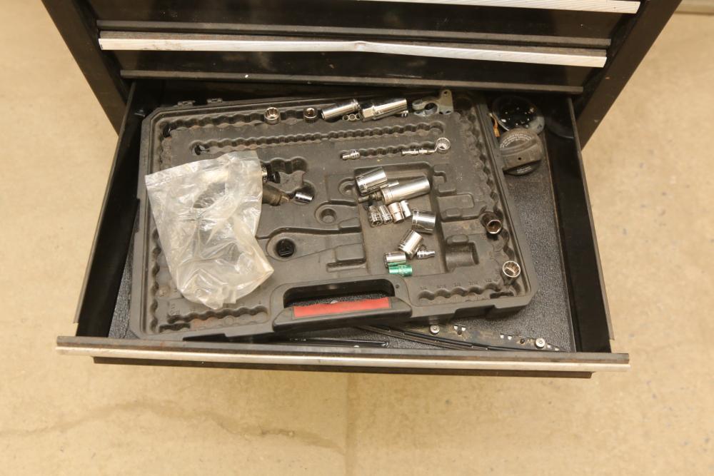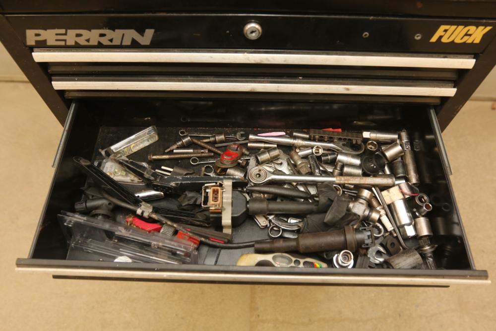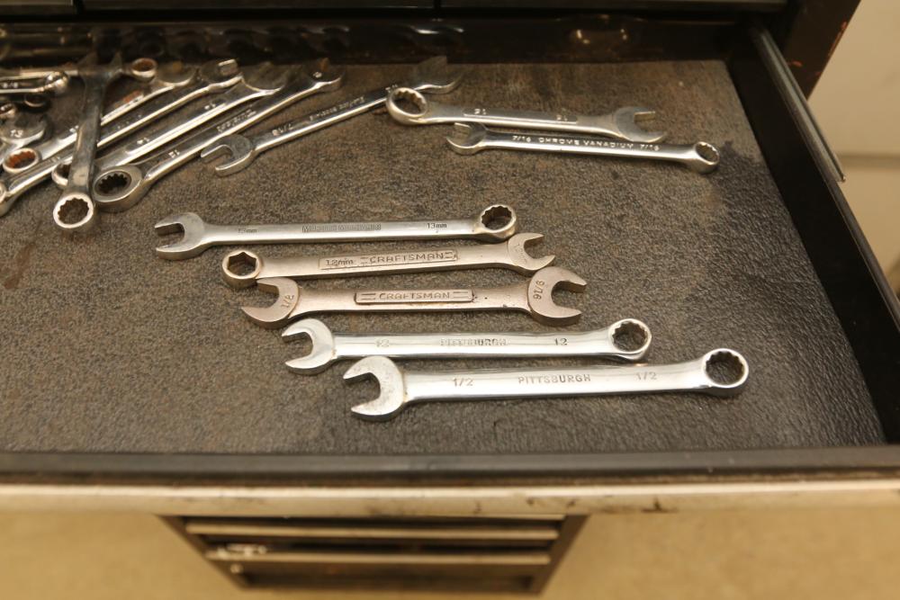 Craftsman rolling tool box with upper and lower craftsman with center piece being Perrin, upper section with eight drawers, lower section with five drawers, and perrin (middle section) with three drawers, tools incl sockets, zip ties, extensions, screw drivers, wrenches, wire cutters, pliers, fuses, socket wrenches, etc. Pickup only.